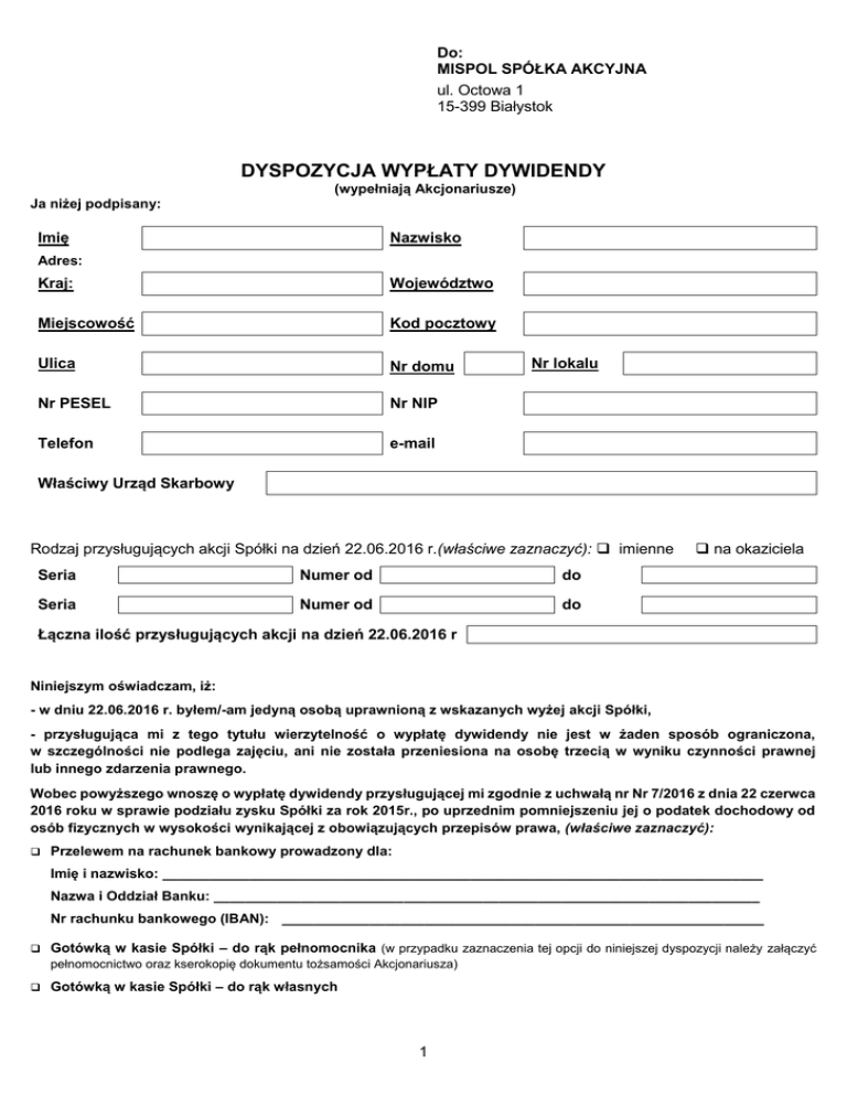 Do: MISPOL SPÓŁKA AKCYJNA ul. Octowa 1 15-399 Białystok DYSPOZYCJA WYPŁATY DYWIDENDY (wypełniają Akcjonariusze) Ja niżej podpisany: Imię Nazwisko Adres: Kraj: Województwo Miejscowość Kod pocztowy Ulica Nr domu Nr PESEL Nr NIP Telefon e-mail Nr lokalu Właściwy Urząd Skarbowy Rodzaj przysługujących akcji Spółki na dzień 22.06.2016 r.(właściwe zaznaczyć): imienne Seria Numer od do Seria Numer od do na okaziciela Łączna ilość przysługujących akcji na dzień 22.06.2016 r Niniejszym oświadczam, iż: - w dniu 22.06.2016 r. byłem/-am jedyną osobą uprawnioną z wskazanych wyżej akcji Spółki, - przysługująca mi z tego tytułu wierzytelność o wypłatę dywidendy nie jest w żaden sposób ograniczona, w szczególności nie podlega zajęciu, ani nie została przeniesiona na osobę trzecią w wyniku czynności prawnej lub innego zdarzenia prawnego. Wobec powyższego wnoszę o wypłatę dywidendy przysługującej mi zgodnie z uchwałą nr Nr 7/2016 z dnia 22 czerwca 2016 roku w sprawie podziału zysku Spółki za rok 2015r., po uprzednim pomniejszeniu jej o podatek dochodowy od osób fizycznych w wysokości wynikającej z obowiązujących przepisów prawa, (właściwe zaznaczyć): Przelewem na rachunek bankowy prowadzony dla: Imię i nazwisko: ____________________________________________________________________________ Nazwa i Oddział Banku: _____________________________________________________________________ Nr rachunku bankowego (IBAN): _____________________________________________________________ Gotówką w kasie Spółki – do rąk pełnomocnika (w przypadku zaznaczenia tej opcji do niniejszej dyspozycji należy załączyć pełnomocnictwo oraz kserokopię dokumentu tożsamości Akcjonariusza) Gotówką w kasie Spółki – do rąk własnych 1 DODATKOWE OŚWIADCZENIA AKCJONARIUSZA Przyjmuję do wiadomości, iż powyższa dyspozycja wypłaty dywidendy zostanie wykonana wyłącznie w sytuacji, jeżeli zostaną potwierdzone moje uprawnienia do otrzymania dywidendy. Oświadczam, że: (właściwe zaznaczyć) posiadam miejsce zamieszkania na terytorium Polski (posiadam na terytorium Polski centrum interesów osobistych lub gospodarczych (ośrodek interesów życiowych) lub przebywam na terytorium Rzeczypospolitej Polskiej dłużej niż 183 dni w roku podatkowym), nie posiadam miejsca zamieszkania na terytorium Polski (posiadam poza terytorium Polski centrum interesów osobistych lub gospodarczych (ośrodek interesów życiowych) i przebywam poza terytorium Polski dłużej niż 183 dni w roku podatkowym), Jednocześnie przyjmuję do wiadomości, iż w przypadku zakreślenia drugiej z powyższych opcji i nie przedstawienia Spółce do dnia 22 lipca 2016 r. zaświadczenia o siedzibie wydanego do celów podatkowych przez właściwą administrację podatkową państwa obcego (certyfikat rezydencji) lub w przypadku powzięcia jakichkolwiek wątpliwości w zakresie przedłożonych dokumentów, Spółka wypłaci mi dywidendę pomniejszoną o zryczałtowany podatek dochodowy w wysokości 19%. W przypadku zakreślenia drugiej z powyższych opcji (nierezydenci) należy też wskazać dodatkowe dane osobowe: Data i miejsce urodzenia: ___________________________________________________________________________ Imię ojca: ________________________________________________________________________________________ Imię matki: _______________________________________________________________________________________ Wyrażam zgodę na przetwarzanie przez Mispol S.A. moich danych osobowych w celach związanych z realizacją niniejszej dyspozycji, a także w innych celach służących realizacji moich uprawnień oraz oświadczam, że świadoma/y jestem prawa do wglądu i poprawiania moich danych osobowych. ______________________________, dnia __________________ r. ____________________________________________ czytelny podpis Akcjonariusza Informacje dotyczące wypłaty dywidendy z zysku za rok obrotowy 2015 Dnia 22.06.2016r. Zwyczajne Walne Zgromadzenie Mispol S.A. podjęło Uchwałę Nr 7/2016 w sprawie podziału zysku Spółki za rok 2015, przeznaczając na dywidendę dla akcjonariuszy kwotę 7.622.788.88 zł, tj. 0,49 zł brutto na 1 akcję. Uprawnionymi do dywidendy są akcjonariusze, którym przysługują akcje Spółki w dniu powzięcia Uchwały Nr 7/2016, tj. w dniu 22.06.2016 r. Termin wypłaty dywidendy ustalony został na dzień 22.07.2016 r. Rozpoczęcie wypłaty dywidendy nastąpi począwszy od dnia 22 lipca 2016 roku, w terminie 14 dni licząc od daty złożenia prawidłowo wypełnionej Dyspozycji wypłaty dywidendy i potwierdzenia uprawnień akcjonariusza do wypłaty dywidendy. Kwota dywidendy wypłacanej poszczególnym akcjonariuszom, do których zastosowanie mają przepisy ustawy z dnia 26 lipca 1991 r. o podatku dochodowym od osób fizycznych (Dz.U.2012.361 z dnia 2012.04.03), zostanie pomniejszona o 19% zryczałtowany podatek dochodowy, pobierany i odprowadzany przez Spółkę, jako płatnika tego podatku, na rachunek właściwego dla płatnika urzędu skarbowego, na podstawie art. 30a ust. 1 pkt 4 i ust. 6 oraz art. 41 ust. 4 i art. 42 ustawy o podatku dochodowym od osób fizycznych. Dywidenda zostanie wypłacona w formie wskazanej w Dyspozycji. Dyspozycję wypłaty dywidendy można złożyć osobiście w siedzibie Mispol S.A. bądź przesłać na adres Mispol S.A. (w takim przypadku podpis pod dyspozycją musi zostać poświadczony przez notariusza). 2