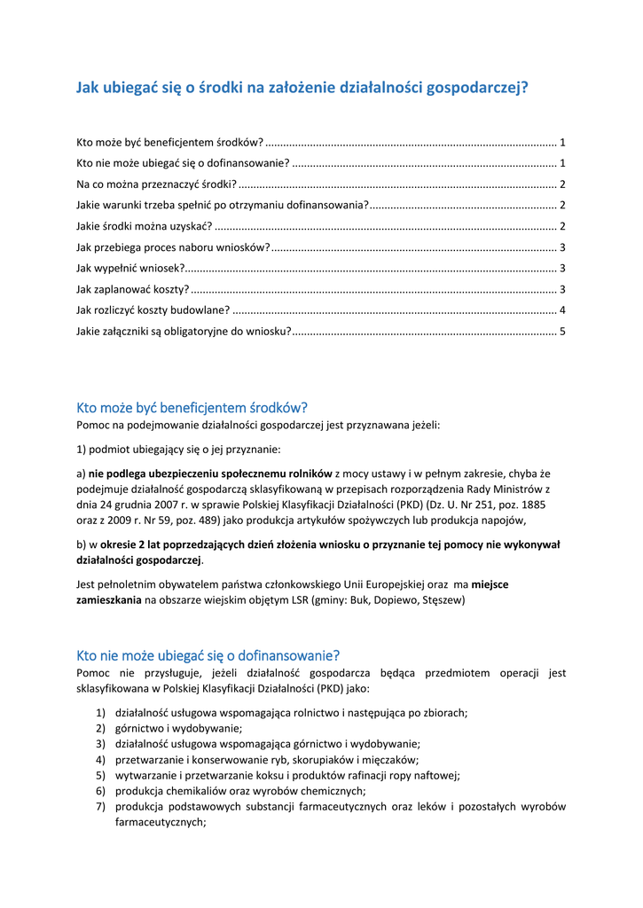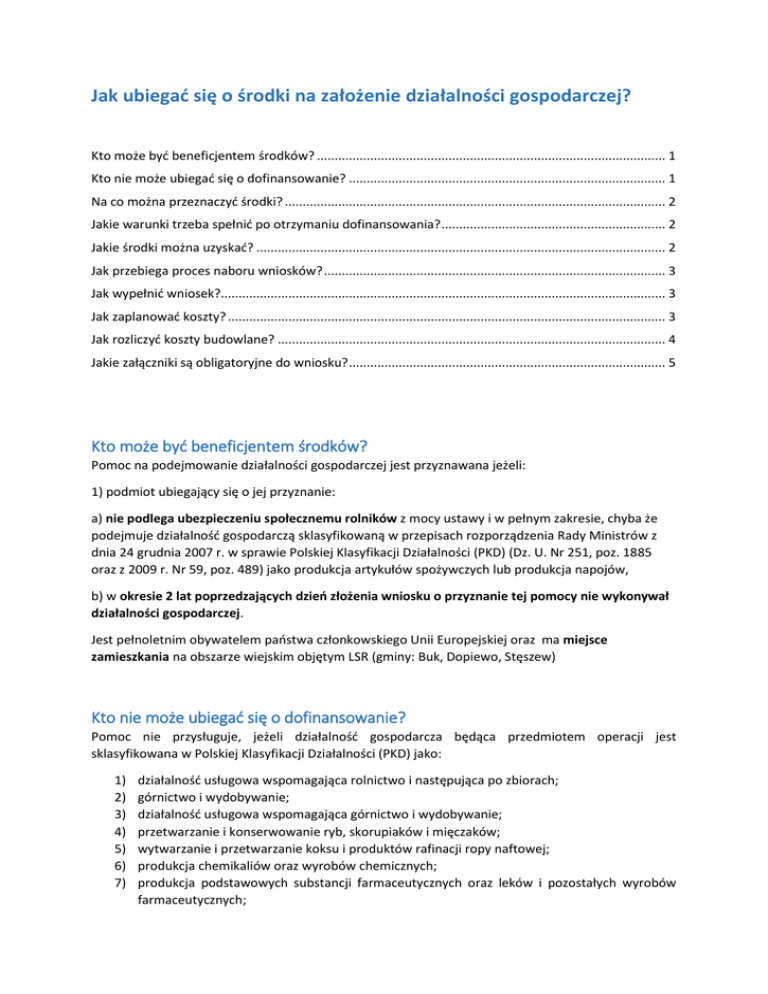 Jak ubiegać się o środki na założenie działalności gospodarczej? Kto może być beneficjentem środków? .................................................................................................. 1 Kto nie może ubiegać się o dofinansowanie? ......................................................................................... 1 Na co można przeznaczyć środki? ........................................................................................................... 2 Jakie warunki trzeba spełnić po otrzymaniu dofinansowania? ............................................................... 2 Jakie środki można uzyskać? ................................................................................................................... 2 Jak przebiega proces naboru wniosków? ................................................................................................ 3 Jak wypełnić wniosek?............................................................................................................................. 3 Jak zaplanować koszty? ........................................................................................................................... 3 Jak rozliczyć koszty budowlane? ............................................................................................................. 4 Jakie załączniki są obligatoryjne do wniosku? ......................................................................................... 5 Kto może być beneficjentem środków? Pomoc na podejmowanie działalności gospodarczej jest przyznawana jeżeli: 1) podmiot ubiegający się o jej przyznanie: a) nie podlega ubezpieczeniu społecznemu rolników z mocy ustawy i w pełnym zakresie, chyba że podejmuje działalność gospodarczą sklasyfikowaną w przepisach rozporządzenia Rady Ministrów z dnia 24 grudnia 2007 r. w sprawie Polskiej Klasyfikacji Działalności (PKD) (Dz. U. Nr 251, poz. 1885 oraz z 2009 r. Nr 59, poz. 489) jako produkcja artykułów spożywczych lub produkcja napojów, b) w okresie 2 lat poprzedzających dzień złożenia wniosku o przyznanie tej pomocy nie wykonywał działalności gospodarczej. Jest pełnoletnim obywatelem państwa członkowskiego Unii Europejskiej oraz ma miejsce zamieszkania na obszarze wiejskim objętym LSR (gminy: Buk, Dopiewo, Stęszew) Kto nie może ubiegać się o dofinansowanie? Pomoc nie przysługuje, jeżeli działalność gospodarcza będąca przedmiotem operacji jest sklasyfikowana w Polskiej Klasyfikacji Działalności (PKD) jako: 1) 2) 3) 4) 5) 6) 7) działalność usługowa wspomagająca rolnictwo i następująca po zbiorach; górnictwo i wydobywanie; działalność usługowa wspomagająca górnictwo i wydobywanie; przetwarzanie i konserwowanie ryb, skorupiaków i mięczaków; wytwarzanie i przetwarzanie koksu i produktów rafinacji ropy naftowej; produkcja chemikaliów oraz wyrobów chemicznych; produkcja podstawowych substancji farmaceutycznych oraz leków i pozostałych wyrobów farmaceutycznych; 8) 9) 10) 11) produkcja metali; produkcja pojazdów samochodowych, przyczep i naczep oraz motocykli; transport lotniczy i kolejowy; gospodarka magazynowa. Na co można przeznaczyć środki? Pomoc jest przyznawana w formie premii, do kosztów kwalifikowalnych zalicza się koszty: 1) ogólne stanowiące 10 % pozostałych kosztów kwalifikowanych (takie jak honoraria architektów, inżynierów, opłaty za konsultacje, opłaty za doradztwo w zakresie zrównoważenia środowiskowego i gospodarczego, w tym studia wykonalności.) 2) zakupu robót budowlanych lub usług, 3) zakupu lub rozwoju oprogramowania komputerowego oraz zakupu patentów, licencji lub wynagrodzeń za przeniesienie autorskich praw majątkowych lub znaków towarowych, 4) najmu lub dzierżawy maszyn, wyposażenia lub nieruchomości, 5) zakupu nowych maszyn lub wyposażenia 6) zakupu nowych środków transportu, z wyłączeniem zakupu samochodów osobowych przeznaczonych do przewozu mniej niż 8 osób łącznie z kierowcą, (do 30% pozostałych kosztów kwalifikowanych), 7) zakupu rzeczy innych niż wymienione w pkt 5 i 6, w tym materiałów. Jakie warunki trzeba spełnić po otrzymaniu dofinansowania? Beneficjent jest zobowiązany do podjęcia we własnym imieniu działalności gospodarczej do której stosuje się przepisy ustawy z dnia 2 lipca 2014 r. o swobodzie działalności gospodarczej, jej wykonywania do dnia, w którym upłynie 2 lata od dnia wypłaty płatności końcowej, oraz: a) zgłoszenie podmiotu ubiegającego się o przyznanie pomocy do ubezpieczenia emerytalnego, ubezpieczeń rentowych i ubezpieczenia wypadkowego na podstawie przepisów o systemie ubezpieczeń społecznych z tytułu wykonywania tej działalności i podleganie tym ubezpieczeniom, do dnia, w którym upłynie 2 lata od dnia wypłaty płatności końcowej, lub b) utworzenie co najmniej jednego miejsca pracy w przeliczeniu na pełne etaty średnioroczne, utrzymanie – 2 lata od dnia wypłaty płatności końcowej. Jakie środki można uzyskać? Beneficjenci mogą wnioskować o przyznanie premii na rozpoczęcie działalności gospodarczej w wysokości 50 000 zł. 80% premii wypłacane jest „z góry” po podpisaniu umowy z Samorządem Województwa, a 20% jest rozliczane wraz z wnioskiem o płatność ostateczną. Jak przebiega proces naboru wniosków? Wnioski są składane osobiście w Biurze LGD w terminie zawartym we właściwym ogłoszeniu o naborze wniosków. Należy złożyć wniosek w dwóch egzemplarzach wraz z wymaganymi załącznikami. Po złożeniu wniosków zostają one poddane ocenie przez Radę Stowarzyszenia oraz ocenione zgodnie z kryteriami oceny zawartymi w Strategii Rozwoju Lokalnego Kierowanego przez społeczność (umieszczonymi na stronie internetowej www.lgdzrodlo.pl (http://lgdzrodlo.pl/kryteria-wyboruoperacji/)) Po dokonaniu oceny, Beneficjenci zostaną poinformowani o jej wynikach. Dofinansowanie otrzymują wnioski, które mieszczą się w l