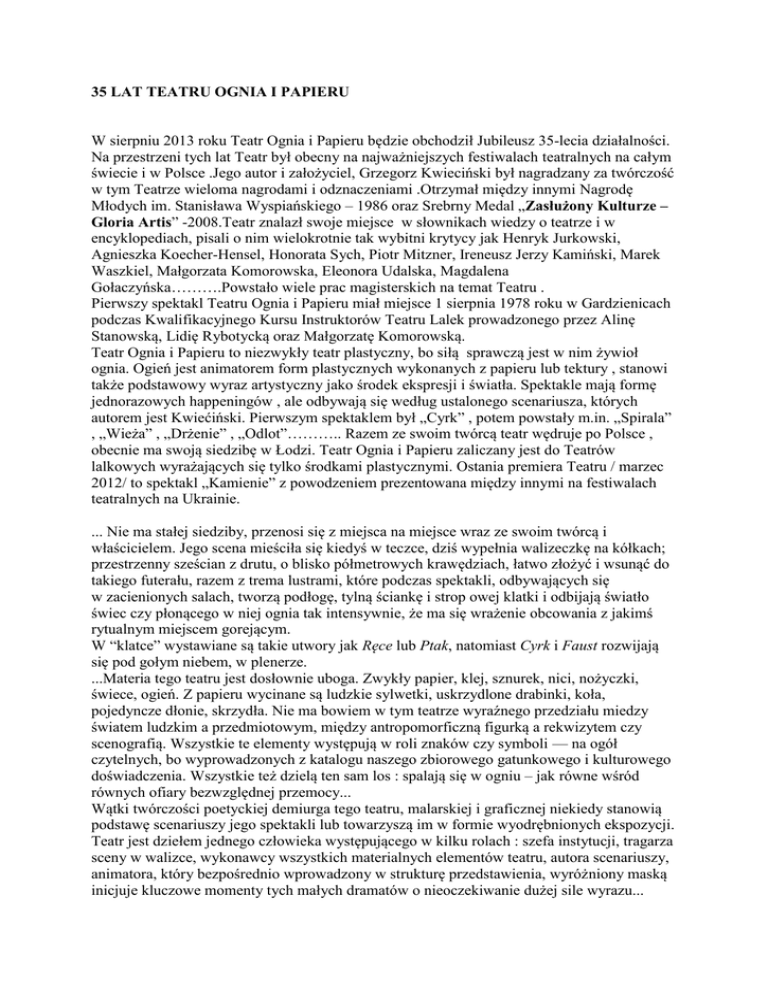 35 LAT TEATRU OGNIA I PAPIERU W sierpniu 2013 roku Teatr Ognia i Papieru będzie obchodził Jubileusz 35-lecia działalności. Na przestrzeni tych lat Teatr był obecny na najważniejszych festiwalach teatralnych na całym świecie i w Polsce .Jego autor i założyciel, Grzegorz Kwieciński był nagradzany za twórczość w tym Teatrze wieloma nagrodami i odznaczeniami .Otrzymał między innymi Nagrodę Młodych im. Stanisława Wyspiańskiego – 1986 oraz Srebrny Medal „Zasłużony Kulturze – Gloria Artis” -2008.Teatr znalazł swoje miejsce w słownikach wiedzy o teatrze i w encyklopediach, pisali o nim wielokrotnie tak wybitni krytycy jak Henryk Jurkowski, Agnieszka Koecher-Hensel, Honorata Sych, Piotr Mitzner, Ireneusz Jerzy Kamiński, Marek Waszkiel, Małgorzata Komorowska, Eleonora Udalska, Magdalena Gołaczyńska……….Powstało wiele prac magisterskich na temat Teatru . Pierwszy spektakl Teatru Ognia i Papieru miał miejsce 1 sierpnia 1978 roku w Gardzienicach podczas Kwalifikacyjnego Kursu Instruktorów Teatru Lalek prowadzonego przez Alinę Stanowską, Lidię Rybotycką oraz Małgorzatę Komorowską. Teatr Ognia i Papieru to niezwykły teatr plastyczny, bo siłą sprawczą jest w nim żywioł ognia. Ogień jest animatorem form plastycznych wykonanych z papieru lub tektury , stanowi także podstawowy wyraz artystyczny jako środek ekspresji i światła. Spektakle mają formę jednorazowych happeningów , ale odbywają się według ustalonego scenariusza, których autorem jest Kwiećiński. Pierwszym spektaklem był „Cyrk” , potem powstały m.in. „Spirala” , „Wieża” , „Drżenie” , „Odlot”……….. Razem ze swoim twórcą teatr wędruje po Polsce , obecnie ma swoją siedzibę w Łodzi. Teatr Ognia i Papieru zaliczany jest do Teatrów lalkowych wyrażających się tylko środkami plastycznymi. Ostania premiera Teatru / marzec 2012/ to spektakl „Kamienie” z powodzeniem prezentowana między innymi na festiwalach teatralnych na Ukrainie. ... Nie ma stałej siedziby, przenosi się z miejsca na miejsce wraz ze swoim twórcą i właścicielem. Jego scena mieściła się kiedyś w teczce, dziś wypełnia walizeczkę na kółkach; przestrzenny sześcian z drutu, o blisko półmetrowych krawędziach, łatwo złożyć i wsunąć do takiego futerału, razem z trema lustrami, które podczas spektakli, odbywających się w zacienionych salach, tworzą podłogę, tylną ściankę i strop owej klatki i odbijają światło świec czy płonącego w niej ognia tak intensywnie, że ma się wrażenie obcowania z jakimś rytualnym miejscem gorejącym. W “klatce” wystawiane są takie utwory jak Ręce lub Ptak, natomiast Cyrk i Faust rozwijają się pod gołym niebem, w plenerze. ...Materia tego teatru jest dosłownie uboga. Zwykły papier, klej, sznurek, nici, nożyczki, świece, ogień. Z papieru wycinane są ludzkie sylwetki, uskrzydlone drabinki, koła, pojedyncze dłonie, skrzydła. Nie ma bowiem w tym teatrze wyraźnego przedziału miedzy światem ludzkim a przedmiotowym, między antropomorficzną figurką a rekwizytem czy scenografią. Wszystkie te elementy występują w roli znaków czy symboli — na ogół czytelnych, bo wyprowadzonych z katalogu naszego zbiorowego gatunkowego i kulturowego doświadczenia. Wszystkie też dzielą ten sam los : spalają się w ogniu – jak równe wśród równych ofiary bezwzględnej przemocy... Wątki twórczości poetyckiej demiurga tego teatru, malarskiej i graficznej niekiedy stanowią podstawę scenariuszy jego spektakli lub towarzyszą im w formie wyodrębnionych ekspozycji. Teatr jest dziełem jednego człowieka występującego w kilku rolach : szefa instytucji, tragarza sceny w walizce, wykonawcy wszystkich materialnych elementów teatru, autora scenariuszy, animatora, który bezpośrednio wprowadzony w strukturę przedstawienia, wyróżniony maską inicjuje kluczowe momenty tych małych dramatów o nieoczekiwanie dużej sile wyrazu... -2– Teatr Ognia i Papieru posługuje się nieskomplikowana techniką animacji. Cały ruch sceniczny zależy właściwie od decyzji autora-aktora, który manipulując sznurkami czy nitkami, wydaje polecenia przyczepionym do tych przewodów figurkom z papieru. Jego siła zostaje jednak ograniczona, a w pewnym momencie kompletnie obezwładniona, kiedy na scenę wkracza ogień, który przesuwa, unosi do góry, skręca, łamie, zwęgla i rozrzuca “aktorów” w sposób umykający kontroli. Człowiek wzniecił ten płomień, ale nie panuje już nad nim, staje się tylko świadkiem wielkiej, niszczycielskiej kreacji ognia. Tak właśnie: niszczycielskiej kreacji, albowiem proces dekonstrukcji okazuje się być dla publiczności widowiskiem podniecającym, którego sens emocjonalny nie wyczerpuje się na walorach estetycznych płomieni, lecz obejmuje i mroczną sferę ludzkiej psychiki, gdzie czekając na uśpienie rozumu, sposobią się do walki demony samounicestwienia. “Nieobliczalność” i niszczycielska skuteczność ognia powodują przy tym, że każda realizacja tego samego scenariusza różni się od poprzedniej: strukturą dynamicznej przestrzeni, siłą wyrazu oraz “obsadą”, jako że kolejne przedstawienia wymagają powoływania do życia ciągle nowych “aktorów”. Jest w tym teatrze coś z ducha sztuki efemerycznej. Mimo wszelkich różnic fabularnych, scenariusze Kwiecińskiego traktują o jednej sprawie: o ludzkim, odwiecznym dążeniu do egzystencji piękniejszej i szlachetniejszej niż pospolita, o dążeniu, które z reguły kończy się klęską... Dłonie wyłaniające się ze sterty papierowych śmieci unoszą się i opadają, lecz nigdy nie połączą się z rękoma czekającymi na nie w górze. Ten cały świat nadziei i dobrych intencji zniszczy ogień, podłożony przez Aktora – Demiurga, wytną nożyce, które amputują palce papierowych dłoni do jednego poziomu, by idei równości stało się zadość. Na koniec aktor umyje własne ręce w emaliowa