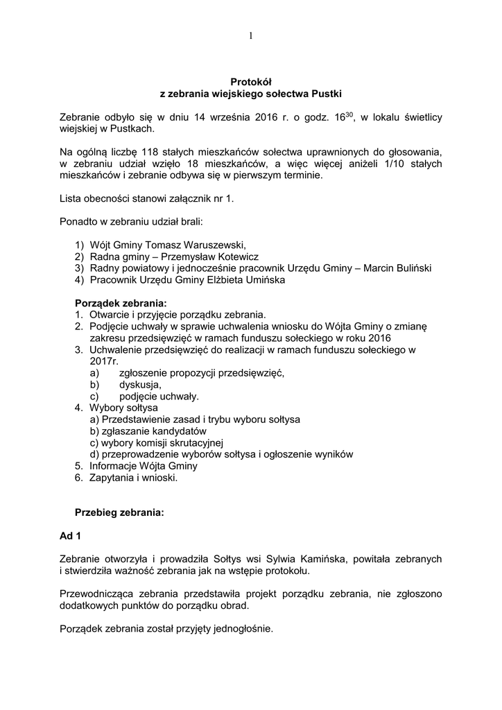 1 Protokół z zebrania wiejskiego sołectwa Pustki Zebranie odbyło się w dniu 14 września 2016 r. o godz. 1630, w lokalu świetlicy wiejskiej w Pustkach. Na ogólną liczbę 118 stałych mieszkańców sołectwa uprawnionych do głosowania, w zebraniu udział wzięło 18 mieszkańców, a więc więcej aniżeli 1/10 stałych mieszkańców i zebranie odbywa się w pierwszym terminie. Lista obecności stanowi załącznik nr 1. Ponadto w zebraniu udział brali: 1) 2) 3) 4) Wójt Gminy Tomasz Waruszewski, Radna gminy – Przemysław Kotewicz Radny powiatowy i jednocześnie pracownik Urzędu Gminy – Marcin Buliński Pracownik Urzędu Gminy Elżbieta Umińska Porządek zebrania: 1. Otwarcie i przyjęcie porządku zebrania. 2. Podjęcie uchwały w sprawie uchwalenia wniosku do Wójta Gminy o zmianę zakresu przedsięwzięć w ramach funduszu sołeckiego w roku 2016 3. Uchwalenie przedsięwzięć do realizacji w ramach funduszu sołeckiego w 2017r. a) zgłoszenie propozycji przedsięwzięć, b) dyskusja, c) podjęcie uchwały. 4. Wybory sołtysa a) Przedstawienie zasad i trybu wyboru sołtysa b) zgłaszanie kandydatów c) wybory komisji skrutacyjnej d) przeprowadzenie wyborów sołtysa i ogłoszenie wyników 5. Informacje Wójta Gminy 6. Zapytania i wnioski. Przebieg zebrania: Ad 1 Zebranie otworzyła i prowadziła Sołtys wsi Sylwia Kamińska, powitała zebranych i stwierdziła ważność zebrania jak na wstępie protokołu. Przewodnicząca zebrania przedstawiła projekt porządku zebrania, nie zgłoszono dodatkowych punktów do porządku obrad. Porządek zebrania został przyjęty jednogłośnie. 2 Ad 2 Zmiana funduszu sołeckiego na 2016 r. Sołtys wsi przedstawiła na co był przeznaczony tegoroczny fundusz wraz z kwotami. W wyniku oszczędności z tytułu ogrzewania świetlicy pozostała kwota ok 1700 zł, dlatego też sołtys zaproponowała przeznaczyć w/w kwotę na doposażenie świetlicy. Nikt nie zgłosił innej propozycji. Po odczytaniu uchwały zebranie jednogłośnie uchwaliło zmianę funduszu sołeckiego na 2016 r. Ad 3 Podjęcie uchwały w sprawie uchwalenia wniosku do Wójta Gminy i wskazania przedsięwzięć do realizacji w ramach funduszu sołeckiego w roku 2017 a) zgłaszanie wniosków Przedsięwzięcia do realizacji zgłosiła Sołtys i były to: 1. Doposażenie placu zabaw – 10 000 zł 2. Organizacja imprez sportowo-kulturalno-rekreacyjnych – 1427,61 zł wniosek stanowi załącznik nr 2. Jeden z mieszkańców zgłosił propozycję utworzenia wiejskiego kąpieliska przy rzece. Radny Przemysław Kotewicz wyjaśnił że nie ma takich możliwości. To co jest np. w Radomnie to tylko plac rekreacyjny, a nie plaża. Dodatkowo na Drwęcy jest Natura 2000. Innych wniosków nie zgłoszono. b) podjęcie uchwały Prowadzący zebranie odczytał projekt uchwały. Zebranie wiejskie przyjęło uchwałę jednogłośnie w sprawie wniosku do Wójta Gminy ze wskazaniem przedsięwzięć do realizacji w 2016 roku, w ramach funduszu sołeckiego. Uchwała stanowi załącznik nr 3. Ad 4 Wybory sołtysa II część zebrania poprowadził Radny Przemysław Kotewicz. Poinformował, że w związku ze złożoną rezygnacją przez Panią Sylwię Kamińską Wójt Gminy zarządzeniem nr 97/2016 z dnia 1.09.2016 r. zarządził ponowne wybory sołtysa sołectwa Pustki. Ponownie została zweryfikowana ilość osób obecnych na sali, liczba mieszkańców nie uległa zmianie, w zebraniu uczestniczyło 18 osób uprawnionych do głosowania. Pracownik Urzędu Gminy Elżbieta Umińska przedstawiła zasady i tryb wyboru sołtysa ze szczególnym uwzględnieniem zasad głosowania. Następnie zgłoszono następujących kandydatów: 1) xxxxx 2) xxxxx 3 Kandydaci wyrazili zgodę na kandydowanie. Wybrano także komisję skrutacyjną w składzie: 1) xxxxxx 2) xxxxxx 3) xxxxxx Kandydaci wyrazili zgodę na udział w pracach komisji, zebranie przyjęło skład komisji jednogłośnie. Komisja skrutacyjna przygotowała karty do głosowania. Po przeprowadzeniu głosowania odczytała protokół z głosowania. Wyniki głosowania przedstawiały się następująco: 11 głosów Karol Gogolin, 5 głosów xxxx, 2 głosy nieważne. Ad 5 Informacja Wójta Gminy 1. Wójt zaapelował o zgłaszanie wszelkich przypadków wandalizmu na terenie gminy. 2. Poinformował o możliwości składania wniosków do Urzędu Gminy o pomoc w przypadku uszkodzenia budynków mieszkalnych w skutek niesprzyjających warunków atmosferycznych. Dotychczas spłynęły 4 takie wnioski na kwotę ok 37 tys. zł. 3. Poinformował o toczącym się postępowaniu przetargowym na budowę obwodnicy Nowego Miasta Lubawskiego. Prace rozpoczną się w 2017 roku. 4. Wójt przedstawił problem nowych przepisów które bardzo restrykcyjnie podchodzą do jakości wody. Może to skutkować np. droższą wodą. Gmina wystosował protest do Ministra Zdrowia w tej sprawie. 5. Przedstawił problem dotyczący Afrykańskiego Pomoru Świń i uczulał na zagrożenia jakie mogą się pojawić. 6. Przedstawił też skutki reformy w oświacie, cofnięcie obniżenia wieku szkolnego spowoduje koszt dla gminy ok 300 tys. zł, natomiast powrót do 8 klasowych podstawówek ok 1 mln zł. Ad 6 Zapytania i wnioski Mieszkańcy złożyli następujące wnioski i zapytania: 1. Mieszkaniec zapytał o jakość wody, stwierdził że jest bardzo zakamieniona. Wójt odpowiedział że ma świadomość problemu, jednakże woda spełnia wszelkie normy jakościowe, a woda twarda dla zdrowia jest lepsza. W trakcie jest opracowywana dokumentacja techniczna. SUWy będą wyposażone w uzdatnianie. 2. Padł wniosek ustawienie 4-5 lamp na nowych działkach Wójt poinformował że z tegorocznego funduszu jest wykonywana dokumentacja techniczna, ale nie wie jak będzie kształtował się budżet na przyszły rok i czy gminę będzie na to stać. Przed nami szereg kosztownych inwestycji. 3. Wniosek o wycięcie gałęzi przy lampie która oświetla krzaki, a nie drogę (między Panią sołtys a Panią xxxxxx) 4.