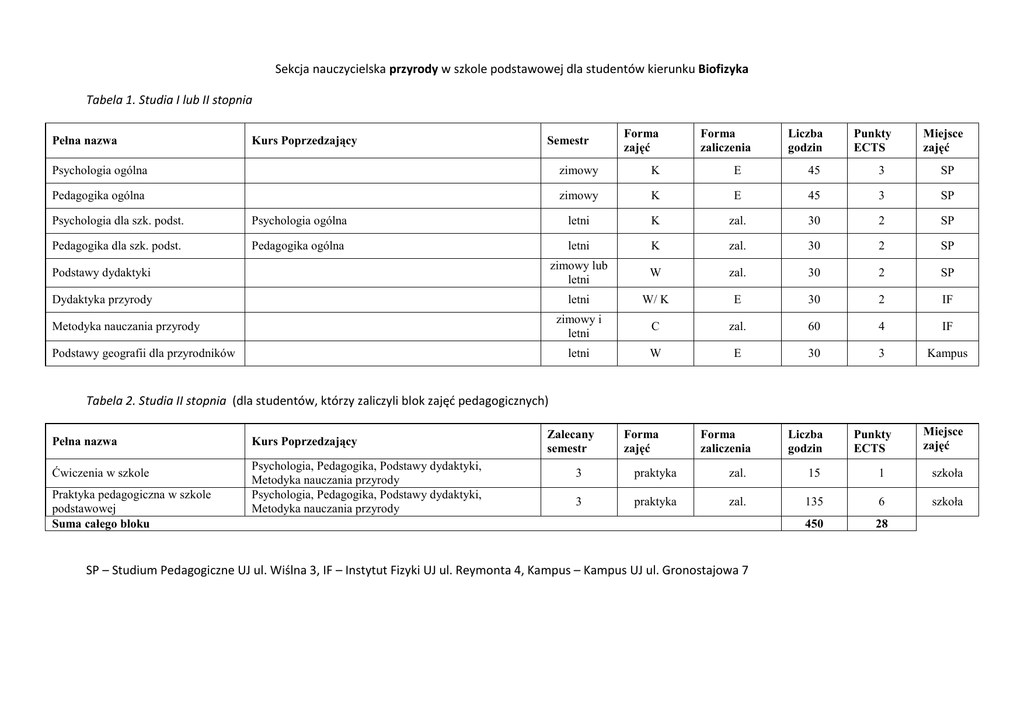 Sekcja nauczycielska przyrody w szkole podstawowej dla studentów kierunku Biofizyka Tabela 1. Studia I lub II stopnia Pełna nazwa Kurs Poprzedzający Semestr Forma zajęć Forma zaliczenia Liczba godzin Punkty ECTS Miejsce zajęć Psychologia ogólna zimowy K E 45 3 SP Pedagogika ogólna zimowy K E 45 3 SP Psychologia dla szk. podst. Psychologia ogólna letni K zal. 30 2 SP Pedagogika dla szk. podst. Pedagogika ogólna letni K zal. 30 2 SP Podstawy dydaktyki zimowy lub letni W zal. 30 2 SP Dydaktyka przyrody letni W/ K E 30 2 IF zimowy i letni C zal. 60 4 IF letni W E 30 3 Kampus Metodyka nauczania przyrody Podstawy geografii dla przyrodników Tabela 2. Studia II stopnia (dla studentów, którzy zaliczyli blok zajęć pedagogicznych) Pełna nazwa Kurs Poprzedzający Ćwiczenia w szkole Psychologia, Pedagogika, Podstawy dydaktyki, Metodyka nauczania przyrody Psychologia, Pedagogika, Podstawy dydaktyki, Metodyka nauczania przyrody Praktyka pedagogiczna w szkole podstawowej Suma całego bloku Zalecany semestr Forma zajęć Forma zaliczenia Liczba godzin Punkty ECTS Miejsce zajęć 3 praktyka zal. 15 1 szkoła 3 praktyka zal. 135 6 szkoła 450 28 SP – Studium Pedagogiczne UJ ul. Wiślna 3, IF – Instytut Fizyki UJ ul. Reymonta 4, Kampus – Kampus UJ ul. Gronostajowa 7 Sekcja nauczycielska przyrody w szkole podstawowej dla studentów kierunku Zaawansowane Materiały i Nanotechnologia Tabela 1. Studia I lub II stopnia Pełna nazwa Kurs Poprzedzający Semestr Forma zajęć Forma zaliczenia Liczba godzin Punkty ECTS Miejsce zajęć Psychologia ogólna zimowy K E 45 3 SP Pedagogika ogólna zimowy K E 45 3 SP Psychologia dla szk. podst. Psychologia ogólna letni K zal. 30 2 SP Pedagogika dla szk. podst. Pedagogika ogólna letni K zal. 30 2 SP Podstawy dydaktyki zimowy lub letni W zal. 30 2 SP Dydaktyka przyrody letni W/ K E 30 2 IF zimowy i letni C zal. 60 4 IF Podstawy geografii dla przyrodników letni W E 30 3 Kampus Biologia dla przyrodników letni K/ C Zal. na ocenę 30 2 Kampus Liczba godzin Punkty ECTS Miejsce zajęć Metodyka nauczania przyrody Tabela 2. Studia II stopnia (dla studentów, którzy zaliczyli blok zajęć pedagogicznych) Pełna nazwa Kurs Poprzedzający Ćwiczenia w szkole Psychologia, Pedagogika, Podstawy dydaktyki, Metodyka nauczania przyrody Psychologia, Pedagogika, Podstawy dydaktyki, Metodyka nauczania przyrody Praktyka pedagogiczna w szkole podstawowej Suma całego bloku Zalecany semestr Forma zajęć Forma zaliczenia 3 praktyka zal. 15 1 szkoła 3 praktyka zal. 135 6 szkoła 480 30 SP – Studium Pedagogiczne UJ ul. Wiślna 3, IF – Instytut Fizyki UJ ul. Reymonta 4, Kampus – Kampus UJ ul. Gronostajowa 7 Sekcja nauczycielska przyrody w szkole podstawowej dla studentów kierunku Fizyka oraz Astronomia Tabela 1. Studia I lub II stopnia Pełna nazwa Kurs Poprzedzający Semestr Forma zajęć Forma zaliczenia Liczba godzin Punkty ECTS Miejsce zajęć Psychologia ogólna zimowy K E 45 3 SP Pedagogika ogólna zimowy K E 45 3 SP Psychologia dla szk. podst. Psychologia ogólna letni K zal. 30 2 SP Pedagogika dla szk. podst. Pedagogika ogólna letni K zal. 30 2 SP Podstawy dydaktyki zimowy lub letni W zal. 30 2 SP Dydaktyka przyrody letni W/ K E 30 2 IF Metodyka nauczania przyrody zimowy i letni C zal. 60 4 IF Podstawy chemii zimowy W/ C zal. na ocenę 30 2 WCH Podstawy geografii dla przyrodników letni W E 30 3 Kampus Biologia dla przyrodników letni K/ C zal. na ocenę 30 2 Kampus Tabela 2. Studia II stopnia (dla studentów, którzy zaliczyli blok zajęć pedagogicznych) Pełna nazwa Kurs Poprzedzający Ćwiczenia w szkole Psychologia, Pedagogika, Podstawy dydaktyki, Metodyka nauczania przyrody Psychologia, Pedagogika, Podstawy dydaktyki, Metodyka nauczania przyrody Praktyka pedagogiczna w szkole podstawowej Suma całego bloku Zalecany semestr Forma zajęć Forma zaliczenia Liczba godzin Punkty ECTS Miejsce zajęć 3 praktyka zal. 15 1 szkoła 3 praktyka zal. 135 6 szkoła 510 32 SP – Studium Pedagogiczne UJ ul. Wiślna 3, IF – Instytut Fizyki UJ ul. Reymonta 4, Kampus – Kampus UJ ul. Gronostajowa 7, WCH – Wydział Chemii UJ ul. Ingardena 3