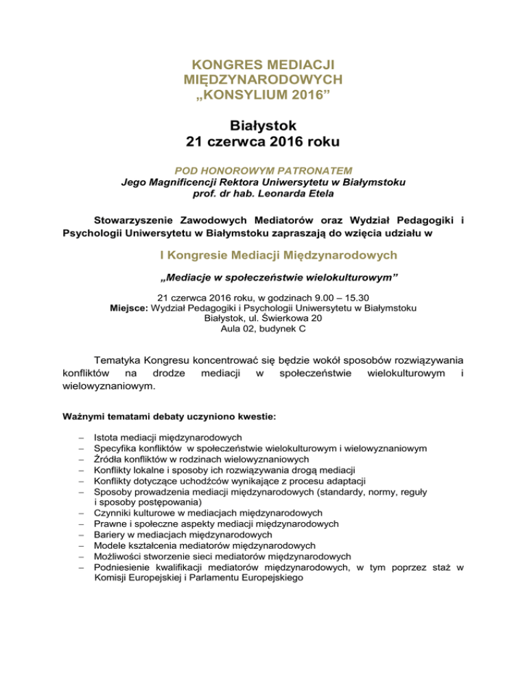 KONGRES MEDIACJI MIĘDZYNARODOWYCH „KONSYLIUM 2016” Białystok 21 czerwca 2016 roku POD HONOROWYM PATRONATEM Jego Magnificencji Rektora Uniwersytetu w Białymstoku prof. dr hab. Leonarda Etela Stowarzyszenie Zawodowych Mediatorów oraz Wydział Pedagogiki i Psychologii Uniwersytetu w Białymstoku zapraszają do wzięcia udziału w I Kongresie Mediacji Międzynarodowych „Mediacje w społeczeństwie wielokulturowym” 21 czerwca 2016 roku, w godzinach 9.00 – 15.30 Miejsce: Wydział Pedagogiki i Psychologii Uniwersytetu w Białymstoku Białystok, ul. Świerkowa 20 Aula 02, budynek C Tematyka Kongresu koncentrować się będzie wokół sposobów rozwiązywania konfliktów na drodze mediacji w społeczeństwie wielokulturowym i wielowyznaniowym. Ważnymi tematami debaty uczyniono kwestie: Istota mediacji międzynarodowych Specyfika konfliktów w społeczeństwie wielokulturowym i wielowyznaniowym Źródła konfliktów w rodzinach wielowyznaniowych Konflikty lokalne i sposoby ich rozwiązywania drogą mediacji Konflikty dotyczące uchodźców wynikające z procesu adaptacji Sposoby prowadzenia mediacji międzynarodowych (standardy, normy, reguły i sposoby postępowania) Czynniki kulturowe w mediacjach międzynarodowych Prawne i społeczne aspekty mediacji międzynarodowych Bariery w mediacjach międzynarodowych Modele kształcenia mediatorów międzynarodowych Możliwości stworzenie sieci mediatorów międzynarodowych Podniesienie kwalifikacji mediatorów międzynarodowych, w tym poprzez staż w Komisji Europejskiej i Parlamentu Europejskiego I Kongres Mediacji Międzynarodowych organizowany jest jednocześnie w czterech miastach w Polsce (Rzeszów - 20.06.2016; Białystok – 21.06.2016; Warszawa – 22.06.2016; Poznań – 23.06.2016) oraz Irlandii (Dublin). Odbędą się również panele dyskusyjne w placówkach dyplomatycznych w Warszawie – lipiec 2016 (Ambasady: USA, Kanady, Francji, Niemiec, Wielkiej Brytanii, Rosji, Chin, Ukrainy, Brazylii, Indii, RPA, Nigerii). Oczekiwane efekty Kongresu to: 1. Powołanie Międzynarodowej Fundacji Umowy Społecznej na rzecz budowania zaufania na świecie i promocji alternatywnych wobec sądu sposobów rozwiązywania konfliktów. 2. Opracowanie standardów kształcenia i pracy mediatorów międzynarodowych. 3. Stworzenie sieci mediatorów międzynarodowych. 4. Podniesienie kwalifikacji mediatorów międzynarodowych, w tym poprzez staż w Komisji Europejskiej i Parlamentu Europejskiego . 5. Publikacja obejmująca diagnozę mediacji – „Mediacje Międzynarodowe – Konsylium 2016” Udział w I Kongresie Mediacji Międzynarodowych jest bezpłatny Wszystkich zainteresowanych prosimy o wypełnienie deklaracji uczestnictwa i przesłanie jej do dnia 15 maja 2016 roku na adres: [email protected] Formularz zgłoszenia- w załączniku