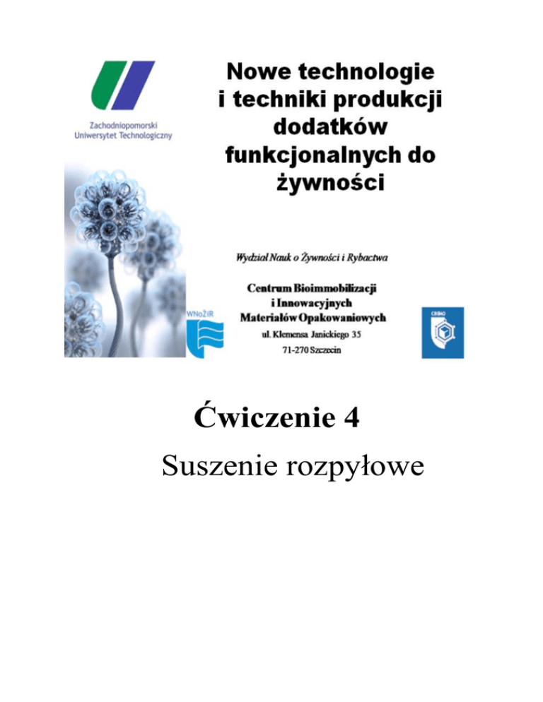 Ćwiczenie 4 Suszenie rozpyłowe Wstęp Suszenie rozpyłowe jest to proces, w wyniku którego, z wyjściowego płynnego surowca (roztworu lub zawiesiny), powstaje produkt w postaci proszku. Suszenie rozpyłowe znajduje szerokie zastosowanie w przemyśle spożywczym, ale także w wielu innych sektorach przemysłu, takich jak, np. przemysł farmaceutyczny, agrochemiczny, chemiczny czy biotechnologiczny. Otrzymany w wyniku suszenia rozpyłowego produkt w porównaniu z produktem płynnym charakteryzuje się dłuższym okresem trwałości, łatwością dozowania oraz mniejszą objętością, co jest istotne zarówno podczas transportu, jak i składowania. Odtworzenie otrzymanych w procesie suszenia rozpyłowego produktów proszkowych ogranicza się do prostego rozpuszczenia w wodzie. Odtworzone proszki, dzięki działaniu przez krótki okres czasu wysokiej temperatury (charakterystycznego dla tej technologii), zachowują w wysokim stopniu cechy organoleptyczne surowca, takich jak smak, barwa i aromat. Suszenie rozpyłowe jest procesem tak powszechnym, ponieważ jest to: - jedna z niewielu metod pozwalająca na otrzymanie produktu w postaci proszku z surowca w postaci płynnej; - metoda bardzo uniwersalna, ponieważ można dobrać odpowiednie parametry procesu, co prowadzi do otrzymania produktu o danych właściwościach; - skuteczna metoda suszenia materiałów wrażliwych na wysoką temperaturę dzięki krótkiemu kontaktowi z gorącym powietrzem, pozwalająca na zachowanie aktywności biologicznej tych materiałów; - metoda elastyczna pod względem jej wydajności – w ciągu godziny można otrzymać od kilku gram nawet do kilku ton proszku. Przykłady zastosowania suszenia rozpyłowego w przemyśle spożywczym: - produkcja mleka w proszku; - produkcja kawy rozpuszczalnej; - suszenie hydrolizatów białkowych; - otrzymywanie proszków soków owocowych i warzywnych; - produkcja dodatków do żywności, takich jak aromaty czy barwniki; - suszenie rozpyłowe witamin; - suszenie bakterii probiotycznych, drożdży, enzymów. Suszenie rozpyłowe dodatków do żywności Mikrokapsułkowanie barwników, aromatów, witamin, bakterii probiotycznych i innych wrażliwych składników stosowanych w żywności stosuje się w celu zwiększenia ich stabilności i trwałości. Związki smakowe i zapachowe występują wśród najbardziej wartościowych składników każdego pożywienia. Jednak dodatek już niewielkich ilości substancji aromatycznych może być dość kosztowny. Niestety większość tych substancji to lotne ciecze, które mogą odparować, ulec utlenieniu lub wzajemnym oddziaływaniom, a to wystarczy by dramatycznie zmienić jakość produktu spożywczego, głównie poprzez wielokrotne otwieranie i zamykanie opakowań. Dlatego korzystnym rozwiązaniem jest kapsułkowanie lotnych związków przeznaczonych jako dodatki do żywności. Suszenie rozpyłowe lotnych związków polega na ich fizycznym zamknięciu w stałych nośnikach (głównie węglowodanowych). Zdolność węglowodanów do wiązania związków smakowych i zapachowych, uzupełnione o ich różnorodność, niski koszt i rozpowszechnione użycie w przemyśle spożywczym, sprawia, że są tak chętnie stosowane jako materiały nośnikowe. Żywotność i stabilność bakterii probiotycznych stanowią technologiczne i marketingowe wyzwanie dla producentów przemysłowych. Intensywne prace badawcze koncentrują się na ochronie mikroorganizmów probiotycznych, zarówno podczas procesu wytwarzania produktów oraz ich przechowywania, jak i transportu przez przewód pokarmowy. Taka ochrona może być osiągnięta różnymi sposobami, jednym z nich jest immobilizacja, czyli mikrokapsułkowanie. Mikrokapsułkowanie metodą suszenia rozpyłowego polega na wytworzeniu otoczki wokół rdzenia poprzez odparowanie rozpuszczalnika z roztworu tworzącego ścianę otoczki. Do komory suszarki doprowadza się przygotowany wcześniej roztwór/emulsję kapsułkowanej substancji w odpowiednio dobranym nośniku. W wyniku kontaktu rozpylonej cieczy z gorącym czynnikiem suszącym (przeważnie z gorącym powietrzem) następuje odparowanie rozpuszczalnika z powierzchni ścianek kapsułki i zestalenie się powłoki. Materiał znajdujący się wewnątrz mikrokapsułki nazywany jest rdzeniem, substancją czynną, wypełniaczem czy też fazą wewnętrzną. Natomiast materiał otaczający rdzeń nazywany jest ścianą mikrokapsułki, powłoką, membraną, matrycą, fazą zewnętrzną czy też materiałem powłokotwórczym. Podczas procesu suszenia rozpyłowego wyróżnić można cztery etapy: - rozpylenie surowca do postaci mgły, - kontakt powstałych kropel z gorącym medium suszącym, - odparowanie rozpuszczalnika, - oddzielenie proszku od strumienia powietrza. Rozpylenie cieczy polega na rozproszeniu surowca za pomocą dyszy lub tarczy obrotowej do postaci mikrokropel, które tworzą tzw. „mgłę” (miliony kropelek o średnicy 10-300 μm). Surowiec stanowią aktywne składniki (tworzące rdzeń mikrokapsułek) zdyspergowane w wodnym roztworze powłokotwórczym. Rozpylenie surowca jest jednym z ważniejszych etapów w całym procesie, ponieważ warunkuje ono wielkość uzyskanych kropel, co ma wpływ na szybkość i efektywność suszenia - odparowania wody (czas, w którym suszony materiał kontaktuje się z wysoką temperaturą powietrza), a także na wielkość cząsteczek powstałego proszku. Rozpylenie ciekłego surowca odbywa się w komorze suszarki, gdzie ciecz kontaktuje się z gorącym medium suszącym. Uzyskanie dużego obszaru rozpylonej cieczy podczas rozpylania ułatwia wymianę ciepła z ogrzanego gazu suszącego do rozpylonych cząsteczek cieczy. W ten sposób rozpuszczalnik odparowuje w bardzo krótkim czasie (średnio 1-20 sekund). Dlatego też suszony materiał przeważnie nie osiąga temperatury wlotowej gazu suszącego. Wysoka temperatura, przenoszona do kropelek rozpylonej cieczy, kontaktuje się z substancją powłokotwórczą, dzi