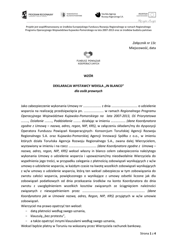 Projekt jest współfinansowany ze środków Europejskiego Funduszu Rozwoju Regionalnego w ramach Regionalnego Programu Operacyjnego Województwa Kujawsko-Pomorskiego na lata 2007-2013 oraz ze środków budżetu państwa Załącznik nr 13c Miejscowość, data WZÓR DEKLARACJA WYSTAWCY WEKSLA „IN BLANCO” dla osób prawnych Jako zabezpieczenie wykonania Umowy nr .................... z dnia ............................. o udzielenie wsparcia na realizację przedsięwzięcia pn. ...................... w ramach Regionalnego Programu Operacyjnego Województwa Kujawsko-Pomorskiego na lata 2007-2013, Oś Priorytetowa ………, Działanie ………, Poddziałanie ……… działając w imieniu ……………… (dane Koordynatora zgodne z Umową – nazwa, adres, regon, NIP, KRS), w załączeniu składam/my do dyspozycji Operatora Funduszu Powiązań Kooperacyjnych- Konsorcjum Toruńskiej Agencji Rozwoju Regionalnego S.A. oraz Kujawsko-Pomorskiej Agencji Innowacji Spółka z o.o., w imieniu których działa Toruńska Agencja Rozwoju Regionalnego S.A., zwana dalej Wierzycielem, wystawiony w imieniu i na rzecz ……………………………. (dane Koordynatora zgodne z Umową – nazwa, adres, regon, NIP, KRS) weksel własny in blanco celem zabezpieczenia należytego wykonania Umowy o udzielenie wsparcia i upoważniam/my nieodwołalnie Wierzyciela do wypełnienia jego treści, w przypadku zalegania z płatnością zobowiązań wynikających z w/w umowy o udzielenie wsparcia, w każdym czasie na kwotę wszelkich zobowiązań wynikających z w/w umowy o udzielenie wsparcia, którą ten weksel zabezpiecza w tym zobowiązania do zwrotu całości wsparcia, powiększonego o wynikające z umowy odsetki liczone jak dla zobowiązań podatkowych od dnia przekazania środków na konto Koordynatora do dnia zwrotu z uwzględnieniem wszelkich kosztów związanych ze ściągnięciem należności związanych z niewypełnieniem przez …………………………………………………………………. (dane Koordynatora jak w Umowie nazwa, adres, Regon, NIP, KRS) przyjętych w w/w umowie zobowiązań. Wierzyciel ma prawo opatrzyć ten weksel: datą płatności według swego uznania, klauzulą „bez protestu”, a także opatrzyć innymi klauzulami według swego uznania, Weksel będzie płatny w Toruniu na wskazany przez Wierzyciela rachunek bankowy. Strona 1 z 4 Wierzyciel zawiadomi o powyższym: ………………..……………………………………………………………………. ..................................................................................................................................................... (pełna nazwa Koordynatora, adres, Regon, NIP) listem poleconym wysłanym co najmniej na 7 dni przed terminem płatności na podany powyżej adres, chyba, że Koordynator powiadomi Wierzyciela o zmianie adresu stosownie do zapisów Umowy. Pismo zwrócone z adnotacją urzędu pocztowego: „nie podjęto w terminie”, „adresat wyprowadził się” lub tym podobne, uznaje się za doręczone. Jakiekolwiek zmiany treści niniejszej deklaracji wekslowej dla swej ważności wymagają formy pisemnej. ............................................................... ............................................................... (Nazwa, adres wystawcy weksla) (czytelne podpisy osób upoważnionych do wystawienia weksla, pieczęć firmowa) Dane osób upoważnionych do wystawienia weksla w imieniu ………..(dane Koordynatora)……..:1 Imię, nazwisko, stanowisko …………………… Seria i nr dowodu osobistego …………………... Pesel …………………… Imiona rodziców …………………... Data i miejsce urodzenia …………………… ........................................ (podpis) Imię, nazwisko, stanowisko Seria i nr dowodu osobistego Pesel Imiona rodziców Data i miejsce urodzenia …………………… …………………… …………………… …………………… …………………… ........................................ (podpis) 2Ja, niżej podpisana/-y .........................., zamieszkała/-y: ......................................, legitymująca/-y się dowodem osobistym nr ......................................, PESEL ......................................, jako poręczyciel opisanego wyżej weksla z poręczeniem wekslowym (aval), wystawionego przez ......................................... wyrażam zgodę na wypełnienie tego weksla przez Wierzyciela zgodnie z niniejszą deklaracją wekslową. 1 2 Informacje należy powielić w ilości odpowiadającej liczbie osób upoważnionych do wystawienia weksla. Wypełnić w przypadku Uczestnika przedsięwzięcia- poręczyciela wekslowego będącego osobą fizyczną Strona 2 z 4 Wierzyciel zobowiązuje się zawiadomić mnie o wypełnieniu weksla listem poleconym wysłanym najpóźniej na 7 dni przed terminem płatności weksla na adres: .................................................... Jednocześnie wyrażam zgodę, aby zawiadomienie o wypełnieniu weksla zastąpiło przedstawienie weksla do zapłaty. W razie nieodebrania zawiadomienia za datę doręczenia zawiadomienia uważa się dzień pierwszego awizowania. Zobowiązuje się również do informowania Wierzyciela o każdorazowej zmianie adresu z tym skutkiem, że list skierowany według ostatnich danych i pod ostatnio znany adres będzie uważany za skutecznie doręczony. Imię, nazwisko, …………………… Seria i nr dowodu osobistego …………………… Pesel …………………… Imiona rodziców …………………… Data i miejsce urodzenia …………………… ................................................................... (data i czytelny podpis) 3Ja, niżej podpisana/-y .........................., zamieszkała/-y: ......................................, legitymująca/-y się dowodem osobistym nr ......................................, PESEL ...................................