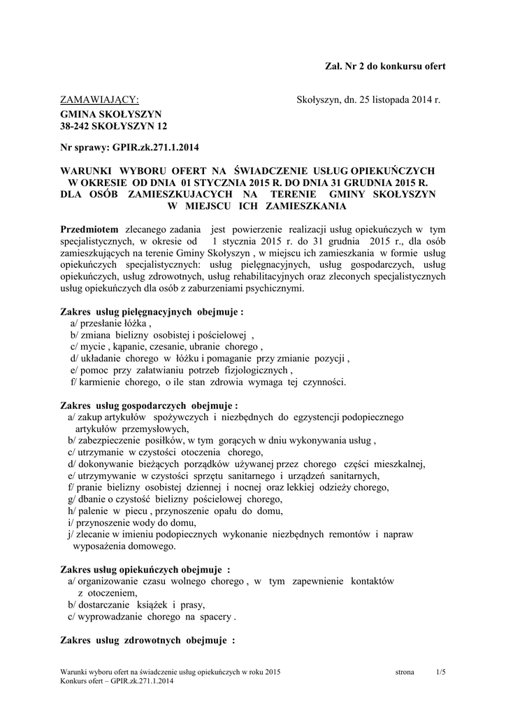 Zał. Nr 2 do konkursu ofert ZAMAWIAJĄCY: GMINA SKOŁYSZYN 38-242 SKOŁYSZYN 12 Skołyszyn, dn. 25 listopada 2014 r. Nr sprawy: GPIR.zk.271.1.2014 WARUNKI WYBORU OFERT NA ŚWIADCZENIE USŁUG OPIEKUŃCZYCH W OKRESIE OD DNIA 01 STYCZNIA 2015 R. DO DNIA 31 GRUDNIA 2015 R. DLA OSÓB ZAMIESZKUJACYCH NA TERENIE GMINY SKOŁYSZYN W MIEJSCU ICH ZAMIESZKANIA Przedmiotem zlecanego zadania jest powierzenie realizacji usług opiekuńczych w tym specjalistycznych, w okresie od 1 stycznia 2015 r. do 31 grudnia 2015 r., dla osób zamieszkujących na terenie Gminy Skołyszyn , w miejscu ich zamieszkania w formie usług opiekuńczych specjalistycznych: usług pielęgnacyjnych, usług gospodarczych, usług opiekuńczych, usług zdrowotnych, usług rehabilitacyjnych oraz zleconych specjalistycznych usług opiekuńczych dla osób z zaburzeniami psychicznymi. Zakres usług pielęgnacyjnych obejmuje : a/ przesłanie łóżka , b/ zmiana bielizny osobistej i pościelowej , c/ mycie , kąpanie, czesanie, ubranie chorego , d/ układanie chorego w łóżku i pomaganie przy zmianie pozycji , e/ pomoc przy załatwianiu potrzeb fizjologicznych , f/ karmienie chorego, o ile stan zdrowia wymaga tej czynności. Zakres usług gospodarczych obejmuje : a/ zakup artykułów spożywczych i niezbędnych do egzystencji podopiecznego artykułów przemysłowych, b/ zabezpieczenie posiłków, w tym gorących w dniu wykonywania usług , c/ utrzymanie w czystości otoczenia chorego, d/ dokonywanie bieżących porządków używanej przez chorego części mieszkalnej, e/ utrzymywanie w czystości sprzętu sanitarnego i urządzeń sanitarnych, f/ pranie bielizny osobistej dziennej i nocnej oraz lekkiej odzieży chorego, g/ dbanie o czystość bielizny pościelowej chorego, h/ palenie w piecu , przynoszenie opału do domu, i/ przynoszenie wody do domu, j/ zlecanie w imieniu podopiecznych wykonanie niezbędnych remontów i napraw wyposażenia domowego. Zakres usług opiekuńczych obejmuje : a/ organizowanie czasu wolnego chorego , w tym zapewnienie kontaktów z otoczeniem, b/ dostarczanie książek i prasy, c/ wyprowadzanie chorego na spacery . Zakres usług zdrowotnych obejmuje : Warunki wyboru ofert na świadczenie usług opiekuńczych w roku 2015 Konkurs ofert – GPIR.zk.271.1.2014 strona 1/5 a/ załatwianie wizyt lekarskich, b/ realizowanie recept lekarskich, c/ podawanie lekarstw choremu, d/ współpraca z pielęgniarką środowiskową i lekarzem , e/ na życzenie chorego zorganizowanie wizyty księdza w domu . Zakres usług rehabilitacyjnych : a/ rehabilitacja fizyczna.(w domu podopiecznego lub w ośrodku) – nie dotyczy usług świadczonych przez lekarzy Zakres usług specjalistycznych dla osób z zaburzeniami psychicznymi : a/ uczenie i rozwijanie umiejętności niezbędnych do samodzielnego życia, b/ pielęgnacja – jako wspieranie procesu leczenia, c/ rehabilitacja fizyczna i usprawnianie zaburzonych funkcji organizmu w zakresie nieobjętym przepisami ustawy z dn. 27.08.2004 r. o świadczeniach opieki zdrowotnej finansowanej ze środków publicznych (Dz. U. z 2008 r. Nr 164, poz. 1027, z późn.zm.), d/ pomoc mieszkaniowa (pomoc w uzyskaniu mieszkania, negocjowaniu i wnoszeniu opłat, organizacji drobnych remontów, adaptacji, napraw, likwidacji barier architektonicznych, kształtowanie relacji pomiędzy sąsiadami), e/ zapewnienie dzieciom i młodzieży z zaburzeniami psychicznymi dostępu do zajęć rehabilitacyjnych i rewalidacyjno-wychowawczych, w wyjątkowych przypadkach, jeżeli nie mają możliwości uzyskania dostępu do zajęć, o których mowa w art. 7 ustawy z dnia 19.08.1994 r. o ochronie zdrowia psychicznego (Dz.U. z 2011 r. Nr 231, poz. 1375 z późn.zm.). Osoby świadczące specjalistyczne usługi opiekuńcze muszą posiadać kwalifikacje wymagane w Rozporządzeniu Ministra Polityki Społecznej z dn. 22.09.2005 r. w sprawie specjalistycznych usług opiekuńczych (Dz.U. Nr 189, poz. 1598 oraz Dz.U. z 2006 r. Nr 134, poz. 943). Zlecenie specjalistycznych usług opiekuńczych obejmuje łącznie 21 923 godzin, w tym: a) specjalistyczne usługi opiekuńcze nad osobami, które z powodu wieku, choroby wymagają pomocy innych osób – 18 398 godzin; b) specjalistyczne usługi opiekuńcze świadczone na rzecz osób z zaburzeniami psychicznymi – 3 525 godzin. Usługi będą świadczone na terenie Gminy Skołyszyn. Zlecone specjalistyczne usługi opiekuńcze świadczone na rzecz osób z zaburzeniami psychicznymi realizowane będą na warunkach określonych Zarządzeniem Nr 181/2014 Wojewody Podkarpackiego z dnia 23 października 2014 r. w sprawie ustalenia sposobu wykonywania zadań pomocy społecznej zleconych z zakresu administracji rządowej realizowanych przez jednostki samorządu terytorialnego. I. WYMAGANIA WOBEC OFERENTÓW 1. Ofertę należy złożyć na obowiązującym druku będącym załącznikiem do rozporządzenia Ministra Pracy i Polityki Społecznej z dnia 15 grudnia 2010 r. w sprawie określenia wzoru oferty i ramowego wzoru umowy dotyczących realizacji zadania publicznego oraz wzoru sprawozdania z wykonania tego zadania (Dz.U. z 2011 r. Nr 6, poz. 25). Oferta musi zawierać w szczególności: 1) Szczegółowy zakres rzeczowy zadania publicznego, sposób realizacji zadania. Warunki wyboru ofert na świadczenie usług opiekuńczych w roku 2015 Konkurs ofert – GPIR.zk.271.1.2014 strona 2/5 2) Termin i miejsce realizacji zadania publicznego, harmonogram działań. 3) Kalkulację przewidywanych kosztów realizacji zadania publicznego wraz z podaniem źródeł finansowania. 4) Informację o wcześniejszej działalności organizacji pozarządowej lub podmiotów składających ofertę w zakresie, którego dotyczy zadanie publiczne. 5) Informację o posiadanych rzeczowych i kadrowych zapewniających wykonanie zadania publicznego oraz o planowanej wysokości środków finansowych na realizację zadania, pochodzących z innych źródeł. 6) Deklarację o zamiarze osiągania lub nie osiągania zysku przy rea