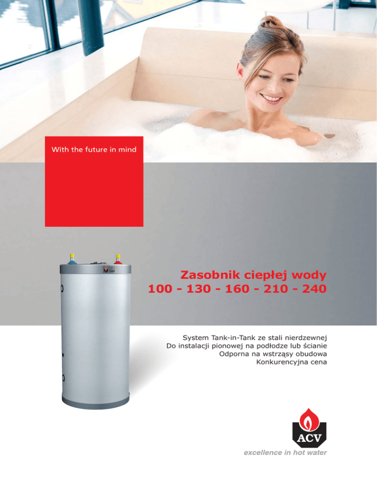 With the future in mind Zasobnik ciepłej wody 100 - 130 - 160 - 210 - 240 System Tank-in-Tank ze stali nierdzewnej Do instalacji pionowej na podłodze lub ścianie Odporna na wstrząsy obudowa Konkurencyjna cena Zasobnik ciepłej wody Comfort ACV 100 – 130 – 160 – 210 – 240 Firma ACV zawdzięcza swoją renomę niezawodnym urządzeniom do wytwarzania ciepłej wody. Zasobnik ciepłej wody Comfort może zostać ustawiony bezpośrednio na podłodze lub zawieszony pionowo na ścianie. Jest on wyposażony w odporną na wstrząsy obudowę i specjalną, doskonałą izolację. Dzięki wyjątkowemu systemowi Tank-in-Tank (zbiornik w zbiorniku) gotowa do użycia ciepła woda dostępna jest przez cały czas Zasobnik ciepłej wody Comfort 100 – 130 – 160 - 210 – 240 Zasobnik ciepłej wody do montażu na podłodze lub pionowo na ścianie Izolowany elastyczną pianką poliuretanową zapewniającą doskonałą izolację Gruba powłoka z winylu Opcjonalnie dostępny z wbudowanym termostatem do regulacji temperatury System Tank-in-Tank Zalety Pomimo swoich niewielkich rozmiarów (zajmuje tylko 0,22m² powierzchni) zasobnik ten oferuje swoim użytkownikom pełną wygodę korzystania z gorącej wody. Zasobnik Comfort 100 zapewnia przepływ ciepłej wody na poziomie co najmniej 20 litrów na minutę! Zasobnik ciepłej wody Comfort ma bardzo atrakcyjną cenę. System Tank-in-Tank Dzięki swojej wyjątkowej koncepcji system Tank-in-Tank (zbiornik w zbiorniku) oferuje pełny komfort związany z ciepłą wodą w połączeniu z trwałością i ograniczonymi wymaganiami z zakresu konserwacji. Zasobnik umożliwia dostęp do nieograniczonej ilości ciepłej wody, co stanowi sekret nadzwyczajnego komfortu sanitarnego. Wysoka temperatura przechowywania wody (do 90°C) Niewielkie rozmiary i minimalne straty ciepła Stal nierdzewna zapewniająca wyjątkową odporność na korozję Ochrona przed osadzaniem się kamienia dzięki rozszerzaniu się i kurczeniu zbiornika w zależności od temperatury Doskonała wydajność i trwałość produktu Higieniczny i niewymagający konserwacji System anty-legionella chroniący przed bakteriami legionelli ZESKANUJ KOD QR I DOWIEDZ SIĘ WIĘCEJ NA TEMAT TECHNOLOGII TANK-IN-TANK 2 Ø 3/4" pojemność Liczba osób mieszkających w Państwa gospodarstwie domowym decyduje o wyborze zasobnika ciepłej wody. Specjalista ds. technicznych określi wspólnie z Państwem objętość ciepłej wody, jaka jest niezbędna zgodnie z Państwa potrzebami Przepływ maksymalny Jaki zasobnik ciepłej wody będzie odpowiedni dla danego użytkownika? l/10 min. przy 40 °C kW numer numer 100 212 23 2 1 130 236 23 3 2 160 321 31 4 2 210 406 39 5 3 240 547 53 7 4 Zasobniki ciepłej wody Ø 3/4" Ø 1" 50 mm Dane techniczne A WYMIARY B Ø 1" C 100 130 160 210 240 A mm 845 1005 1205 1475 1720 B mm 580 740 940 1210 1455 C mm 215 215 215 215 210 DANE OGÓLNE 1 2 130 160 210 240 Pojemność całkowita L 105 130 161 203 242 Pojemność główna L 30 55 62 77 78 Waga (pustego zbiornika) kg 37 40 47 55 65 Czas potrzebny na całkowite napełnienie zbiornika minuty 24 24 22 22 20 Powierzchnia grzewcza m2 1.03 1.03 1.26 1.54 1.94 Moc impulsowa kW 23 23 31 39 53 8 3 5 100 Temperatura działania: 85°C, temperatura poboru wody: 10°C 4 9 1 1 7 Przykład konfiguracji 10 Podłączenie do obwodu ECS 6 1. 2. 3. 4. 5. Zawór izolacyjny Zawór redukcji ciśnienia Zawór kontrolny Pojemnik wzbiorczy Zawór ciśnienia 6. Zawór spustowy 7.Syfon 8. Zawór zwrotny 9.Manometr 10.Uziemienie 3 With the future in mind dystrybutor: www.acv.com Firma ACV nie ponosi odpowiedzialności za jakiekolwiek rozbieżności zaistniałe na skutek kopiowania lub publikacji niniejszego dokumentu. Na potrzeby nieustannego doskonalenia swoich produktów ACV zastrzega sobie prawo do dokonywania zmian w specyfikacjach technicznych i wyposażeniu swoich produktów bez uprzedniego powiadomienia. 06/2013 V1 PRINT01 Since 1922