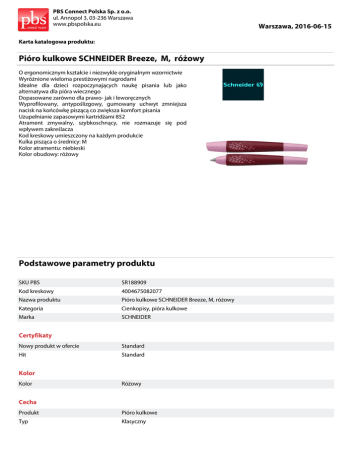 PBS Connect Polska Sp. z o.o. ul. Annopol 3, 03-236 Warszawa www.pbspolska.eu Karta katalogowa produktu: Pióro kulkowe SCHNEIDER Breeze, M, różowy O ergonomicznym kształcie i niezwykle oryginalnym wzornictwie Wyróżnione wieloma prestiżowymi nagrodami Idealne dla dzieci rozpoczynających naukę pisania lub jako alternatywa dla pióra wiecznego Dopasowane zarówno dla prawo- jak i leworęcznych Wyprofilowany, antypoślizgowy, gumowany uchwyt zmniejsza nacisk na końcówkę piszącą co zwiększa komfort pisania Uzupełnianie zapasowymi kartridżami 852 Atrament zmywalny, szybkoschnący, nie rozmazuje się pod wpływem zakreślacza Kod kreskowy umieszczony na każdym produkcie Kulka pisząca o średnicy: M Kolor atramentu: niebieski Kolor obudowy: różowy Podstawowe parametry produktu SKU PBS SR188909 Kod kreskowy 4004675082077 Nazwa produktu Pióro kulkowe SCHNEIDER Breeze, M, różowy Kategoria Cienkopisy, pióra kulkowe Marka SCHNEIDER Certyfikaty Nowy produkt w ofercie Standard Hit Standard Kolor Kolor Różowy Cecha Produkt Pióro kulkowe Typ Klasyczny Warszawa, 2016-06-15 PBS Connect Polska Sp. z o.o. ul. Annopol 3, 03-236 Warszawa www.pbspolska.eu Karta katalogowa produktu cd. Pióro kulkowe SCHNEIDER Breeze, M, różowy Podstawowe parametry produktu W ofercie od 2015-01 Wymiary Grubość linii (mm) M Wspólny słownik zamówień CPV 30192121-5 Długopisy kulkowe Jednostki logistyczne Opakowanie 1 5 szt Opakowanie 2 400 szt Warszawa, 2016-06-15