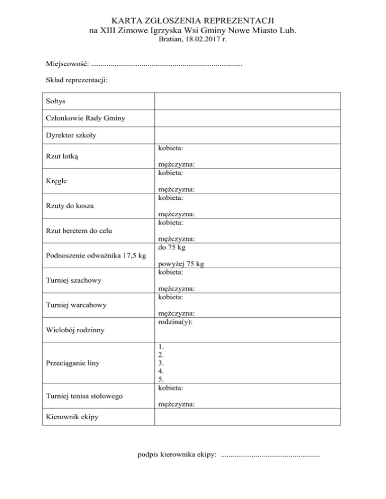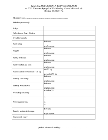 KARTA ZGŁOSZENIA REPREZENTACJI na XIII Zimowe Igrzyska Wsi Gminy Nowe Miasto Lub. Bratian, 18.02.2017 r. Miejscowość: .............................................................................. Skład reprezentacji: Sołtys Członkowie Rady Gminy Dyrektor szkoły kobieta: Rzut lotką mężczyzna: kobieta: Kręgle mężczyzna: kobieta: Rzuty do kosza mężczyzna: kobieta: Rzut beretem do celu mężczyzna: do 75 kg Podnoszenie odważnika 17,5 kg powyżej 75 kg kobieta: Turniej szachowy mężczyzna: kobieta: Turniej warcabowy mężczyzna: rodzina(y): Wielobój rodzinny Przeciąganie liny 1. 2. 3. 4. 5. kobieta: Turniej tenisa stołowego mężczyzna: Kierownik ekipy podpis kierownika ekipy: ...................................................