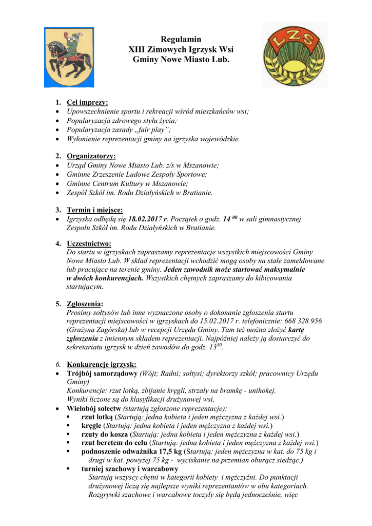 Regulamin XIII Zimowych Igrzysk Wsi Gminy Nowe Miasto Lub. 1. Cel imprezy: Upowszechnienie sportu i rekreacji wśród mieszkańców wsi; Popularyzacja zdrowego stylu życia; Popularyzacja zasady „fair play”; Wyłonienie reprezentacji gminy na igrzyska wojewódzkie. 2. Organizatorzy: Urząd Gminy Nowe Miasto Lub. z/s w Mszanowie; Gminne Zrzeszenie Ludowe Zespoły Sportowe; Gminne Centrum Kultury w Mszanowie; Zespół Szkół im. Rodu Działyńskich w Bratianie. 3. Termin i miejsce: Igrzyska odbędą się 18.02.2017 r. Początek o godz. 14 00 w sali gimnastycznej Zespołu Szkół im. Rodu Działyńskich w Bratianie. 4. Uczestnictwo: Do startu w igrzyskach zapraszamy reprezentacje wszystkich miejscowości Gminy Nowe Miasto Lub. W skład reprezentacji wchodzić mogą osoby na stałe zameldowane lub pracujące na terenie gminy. Jeden zawodnik może startować maksymalnie w dwóch konkurencjach. Wszystkich chętnych zapraszamy do kibicowania startującym. 5. Zgłoszenia: Prosimy sołtysów lub inne wyznaczone osoby o dokonanie zgłoszenia startu reprezentacji miejscowości w igrzyskach do 15.02.2017 r. telefonicznie: 668 328 956 (Grażyna Zagórska) lub w recepcji Urzędu Gminy. Tam też można złożyć kartę zgłoszenia z imiennym składem reprezentacji. Najpóźniej należy ją dostarczyć do sekretariatu igrzysk w dzień zawodów do godz. 1330. 6. Konkurencje igrzysk: Trójbój samorządowy (Wójt; Radni; sołtysi; dyrektorzy szkół; pracownicy Urzędu Gminy) Konkurencje: rzut lotką, zbijanie kręgli, strzały na bramkę - unihokej. Wyniki liczone są do klasyfikacji drużynowej wsi. Wielobój sołectw (startują zgłoszone reprezentacje): rzut lotką (Startują: jedna kobieta i jeden mężczyzna z każdej wsi.) kręgle (Startują: jedna kobieta i jeden mężczyzna z każdej wsi.) rzuty do kosza (Startują: jedna kobieta i jeden mężczyzna z każdej wsi.) rzut beretem do celu (Startują: jedna kobieta i jeden mężczyzna z każdej wsi.) podnoszenie odważnika 17,5 kg (Startują: jeden mężczyzna w kat. do 75 kg i drugi w kat. powyżej 75 kg - wyciskanie na przemian oburącz siedząc.) turniej szachowy i warcabowy Startują wszyscy chętni w kategorii kobiety i mężczyźni. Do punktacji drużynowej liczą się najlepsze wyniki reprezentantów w obu kategoriach. Rozgrywki szachowe i warcabowe toczyły się będą jednocześnie, więc zawodnicy startować mogą tylko w jednej z tych konkurencji: w szachach albo w warcabach. Szachiści i grający w warcaby mogą wziąć udział w innych konkurencjach wyłącznie po zakończeniu swoich rozgrywek. wielobój rodzinny (drużyna: matka, ojciec i dziecko do 13 lat). Startują wszystkie chętne rodziny. Do punktacji drużynowej wsi liczy się wynik najlepszych reprezentantów. Slalom sprawnościowy na dystansie 2x10 m: matka – bieg slalomem tam i z powrotem z kozłowaniem piłki nożnej; dziecko – prowadzenie slalomem piłki nożnej tam i z powrotem; ojciec – bieg slalomem tam i z powrotem trzymając rękoma dwie piłki lekarskie. Zawodnicy startują jeden po drugim w kolejności: matka, dziecko i ojciec. Zwycięża drużyna, która uzyska łącznie najkrótszy czas. przeciąganie liny Startują reprezentacje poszczególnych wsi złożone z dwóch kobiet i trzech mężczyzn lub odwrotnie. Wieś reprezentuje jedna drużyna. Nie używamy rękawiczek. turniej tenisa stołowego Startują: jedna kobieta i jeden mężczyzna z każdej wsi. System rozgrywek zostanie ustalony przed rozpoczęciem zawodów. 7. System punktowania: W poszczególnych konkurencjach będzie prowadzona punktacja dziesięciu najlepszych zawodników według systemu: I – 13 pkt, II – 10 pkt, III – 8 pkt,IV – 7 pkt, V – 6 pkt, VI – 5 pkt, VII – 4 pkt, VIII – 3 pkt, IX – 2 pkt, X – 1 pkt. Wielobój rodzinny i przeciąganie liny punktowane są podwójnie. Miejscowości otrzymują premie punktowe za start sołtysów i radnych gminy (proporcjonalnie do liczby mandatów, w oparciu o obwody) O miejscu wsi w całych igrzyskach decyduje łączna liczba punktów zdobytych przez reprezentujących ją zawodników. 8. Nagrody : Za zajęcie miejsc od pierwszego do trzeciego w poszczególnych konkurencjach przewidziano pamiątkowe medale. Trzy najlepsze reprezentacje wsi nagrodzone zostaną pucharami zgodnie z klasyfikacją drużynową. Pozostałe otrzymają pamiątkowe dyplomy. 9. Postanowienia końcowe : Zgłoszeni zawodnicy są zobowiązani do posiadania aktualnych badań lekarskich; Obowiązuje strój sportowy; Wszelkie sprawy sporne rozstrzygają sędziowie poszczególnych konkurencji; Ostateczna interpretacja niniejszego regulaminu należy wyłącznie do organizatora. Zapraszamy PROGRAM MINUTOWY XIII Zimowych Igrzysk Wsi Gminy Nowe Miasto Lubawskie 1345 Odprawa kierowników ekip 1400 Uroczyste otwarcie Igrzysk 1415 Rozpoczęcie konkurencji: szachy, warcaby, tenis stołowy trójbój samorządowy, wielobój sołectw 15 30 Wielobój rodzinny 1600 Przeciąganie liny 1630 Występ artystyczny 1700 Podsumowanie igrzysk, wręczenie medali i pucharów 1730 – 1800 Zamknięcie XIII Zimowych Igrzysk Wsi Gminy Nowe Miasto Lubawskie Uwaga! Organizatorzy zastrzegają sobie prawo dokonywania korekty programu minutowego w celu dostosowania go do liczby startujących. Przez cały czas trwania igrzysk czynna będzie kawiarenka. Dobrej zabawy i sportowych wrażeń życzą: Organizatorzy
