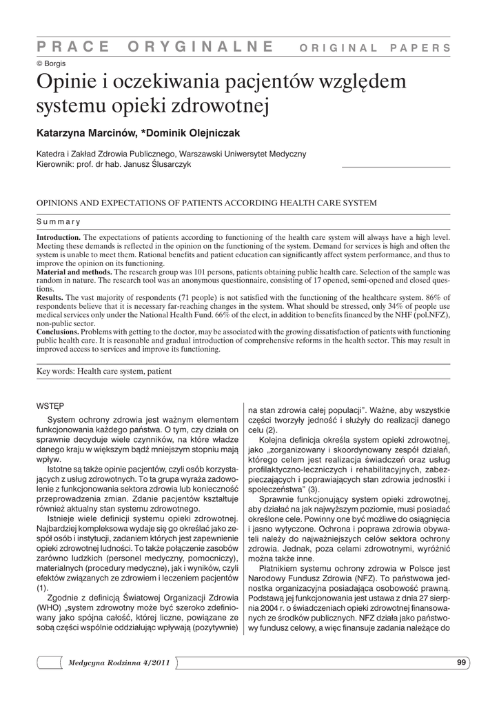 PRACE ORYGINALNE ORIGINAL PAPERS © Borgis Opinie i oczekiwania pacjentów względem systemu opieki zdrowotnej Katarzyna Marcinów, *Dominik Olejniczak Katedra i Zakład Zdrowia Publicznego, Warszawski Uniwersytet Medyczny Kierownik: prof. dr hab. Janusz Ślusarczyk Opinions and expectations of patients according health care system Summary Introduction. The expectations of patients according to functioning of the health care system will always have a high level. Meeting these demands is reflected in the opinion on the functioning of the system. Demand for services is high and often the system is unable to meet them. Rational benefits and patient education can significantly affect system performance, and thus to improve the opinion on its functioning. Material and methods. The research group was 101 persons, patients obtaining public health care. Selection of the sample was random in nature. The research tool was an anonymous questionnaire, consisting of 17 opened, semi-opened and closed questions. Results. The vast majority of respondents (71 people) is not satisfied with the functioning of the healthcare system. 86% of respondents believe that it is necessary far-reaching changes in the system. What should be stressed, only 34% of people use medical services only under the National Health Fund. 66% of the elect, in addition to benefits financed by the NHF (pol.NFZ), non-public sector. Conclusions. Problems with getting to the doctor, may be associated with the growing dissatisfaction of patients with functioning public health care. It is reasonable and gradual introduction of comprehensive reforms in the health sector. This may result in improved access to services and improve its functioning. Key words: Health care system, patient Wstęp System ochrony zdrowia jest ważnym elementem funkcjonowania każdego państwa. O tym, czy działa on sprawnie decyduje wiele czynników, na które władze danego kraju w większym bądź mniejszym stopniu mają wpływ. Istotne są także opinie pacjentów, czyli osób korzystających z usług zdrowotnych. To ta grupa wyraża zadowolenie z funkcjonowania sektora zdrowia lub konieczność przeprowadzenia zmian. Zdanie pacjentów kształtuje również aktualny stan systemu zdrowotnego. Istnieje wiele definicji systemu opieki zdrowotnej. Najbardziej kompleksowa wydaje się go określać jako zespół osób i instytucji, zadaniem których jest zapewnienie opieki zdrowotnej ludności. To także połączenie zasobów zarówno ludzkich (personel medyczny, pomocniczy), materialnych (procedury medyczne), jak i wyników, czyli efektów związanych ze zdrowiem i leczeniem pacjentów (1). Zgodnie z definicją Światowej Organizacji Zdrowia (WHO) „system zdrowotny może być szeroko zdefiniowany jako spójna całość, której liczne, powiązane ze sobą części wspólnie oddziałując wpływają (pozytywnie) Medycyna Rodzinna 4/2011 na stan zdrowia całej populacji”. Ważne, aby wszystkie części tworzyły jedność i służyły do realizacji danego celu (2). Kolejna definicja określa system opieki zdrowotnej, jako „zorganizowany i skoordynowany zespół działań, którego celem jest realizacja świadczeń oraz usług profilaktyczno-leczniczych i rehabilitacyjnych, zabezpieczających i poprawiających stan zdrowia jednostki i społeczeństwa” (3). Sprawnie funkcjonujący system opieki zdrowotnej, aby działać na jak najwyższym poziomie, musi posiadać określone cele. Powinny one być możliwe do osiągnięcia i jasno wytyczone. Ochrona i poprawa zdrowia obywateli należy do najważniejszych celów sektora ochrony zdrowia. Jednak, poza celami zdrowotnymi, wyróżnić można także inne. Płatnikiem systemu ochrony zdrowia w Polsce jest Narodowy Fundusz Zdrowia (NFZ). To państwowa jednostka organizacyjna posiadająca osobowość prawną. Podstawą jej funkcjonowania jest ustawa z dnia 27 sierpnia 2004 r. o świadczeniach opieki zdrowotnej finansowanych ze środków publicznych. NFZ działa jako państwowy fundusz celowy, a więc finansuje zadania należące do 99 Katarzyna Marcinów, Dominik Olejniczak państwowych lub samorządowych organów publicznych. Organami wchodzącymi w skład Narodowego Funduszu Zdrowia są Rada i Prezes Funduszu oraz rady oddziałów wojewódzkich wraz z ich dyrektorami. Natomiast organem centralnym jest Prezes Narodowego Funduszu Zdrowia, powoływany na wniosek Ministra Zdrowia przez Radę Funduszu. Struktura organizacyjna NFZ składa się z Centrali i 16 Oddziałów Wojewódzkich (4). Kolejnym elementem systemu są świadczeniodawcy. Zgodnie z ustawą z dnia 30 sierpnia 1991 r. o zakładach opieki zdrowotnej, usług zdrowotnych mogą udzielać zakłady opieki zdrowotnej. Ustawa z dnia 5 grudnia 1996 r. o zawodach lekarza i lekarza dentysty wskazuje także osoby fizyczne wykonujące zawód medyczny lub grupową praktykę lekarską, jako świadczeniodawców. Grupowa praktyka pielęgniarek i położnych w myśl ustawy z dnia 5 lipca 1996 r. o zawodach pielęgniarek i położnych jest również włączona do grupy podmiotów udzielających opieki zdrowotnej. Świadczeniodawcą jest także osoba fizyczna posiadająca uprawnienia do udzielania świadczeń zdrowotnych i udzielająca ich w ramach prowadzonej działalności gospodarczej, np. technicy radiologii, fizjoterapeuci (5, 6). Usługi medyczne mogą być udzielane przez państwową jednostkę budżetową, posiadającą w swojej strukturze organizacyjnej ambulatorium, ambulatorium z izbą chorych lub lekarza podstawowej opieki zdrowotnej. Do świadczeniodawców zaliczamy również podmioty realizujące czynności z zakresu zaopatrzenia w środki pomocnicze i wyroby medyczne będące przedmiotami ortopedycznymi (6, 7). Zasadniczym elementem sektora zdrowia w Polsce jest podstawowa opieka zdrowotna (POZ). Są to świadczenia zdrowotne profilaktyczne, diagnostyczne, rehabilitacyjne, lecznicze oraz pielęgnacyjne z zakresu medycyny ogólnej, rodzinnej i pediatrii, udzielane w 