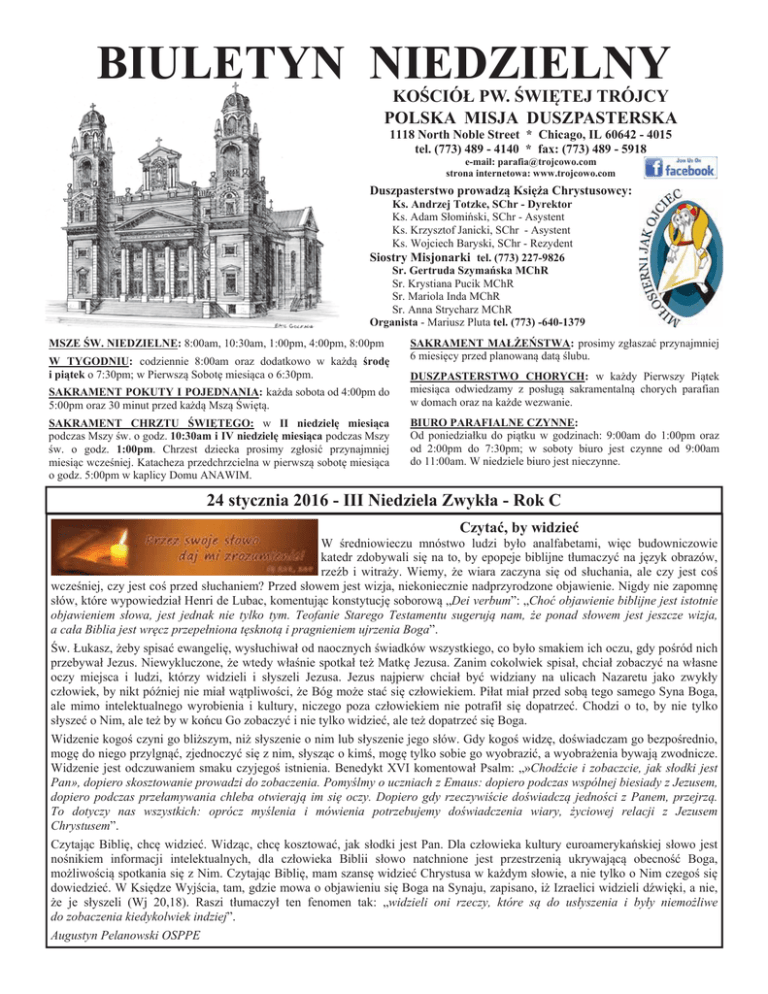 BIULETYN NIEDZIELNY KOĝCIÓà PW. ĝWIĉTEJ TRÓJCY POLSKA MISJA DUSZPASTERSKA 1118 North Noble Street * Chicago, IL 60642 - 4015 tel. (773) 489 - 4140 * fax: (773) 489 - 5918 e-mail: [email protected] strona internetowa: www.trojcowo.com Duszpasterstwo prowadzą KsiĊĪa Chrystusowcy: Ks. Andrzej Totzke, SChr - Dyrektor Ks. Adam SáomiĔski, SChr - Asystent Ks. Krzysztof Janicki, SChr - Asystent Ks. Wojciech Baryski, SChr - Rezydent Siostry Misjonarki tel. (773) 227-9826 Sr. Gertruda SzymaĔska MChR Sr. Krystiana Pucik MChR Sr. Mariola Inda MChR Sr. Anna Strycharz MChR Organista - Mariusz Pluta tel. (773) -640-1379 MSZE ĝW. NIEDZIELNE: 8:00am, 10:30am, 1:00pm, 4:00pm, 8:00pm W TYGODNIU: codziennie 8:00am oraz dodatkowo w kaĪdą ĞrodĊ i piątek o 7:30pm; w Pierwszą SobotĊ miesiąca o 6:30pm. SAKRAMENT POKUTY I POJEDNANIA: kaĪda sobota od 4:00pm do 5:00pm oraz 30 minut przed kaĪdą Mszą ĝwiĊtą. SAKRAMENT CHRZTU ĝWIĉTEGO: w II niedzielĊ miesiąca podczas Mszy Ğw. o godz. 10:30am i IV niedzielĊ miesiąca podczas Mszy Ğw. o godz. 1:00pm. Chrzest dziecka prosimy zgáosiü przynajmniej miesiąc wczeĞniej. Katacheza przedchrzcielna w pierwszą sobotĊ miesiąca o godz. 5:00pm w kaplicy Domu ANAWIM. SAKRAMENT MAàĩEēSTWA: prosimy zgáaszaü przynajmniej 6 miesiĊcy przed planowaną datą Ğlubu. DUSZPASTERSTWO CHORYCH: w kaĪdy Pierwszy Piątek miesiąca odwiedzamy z posáugą sakramentalną chorych parafian w domach oraz na kaĪde wezwanie. BIURO PARAFIALNE CZYNNE: Od poniedziaáku do piątku w godzinach: 9:00am do 1:00pm oraz od 2:00pm do 7:30pm; w soboty biuro jest czynne od 9:00am do 11:00am. W niedziele biuro jest nieczynne. 24 stycznia 2016 - III Niedziela Zwykáa - Rok C Czytaü, by widzieü W Ğredniowieczu mnóstwo ludzi byáo analfabetami, wiĊc budowniczowie katedr zdobywali siĊ na to, by epopeje biblijne táumaczyü na jĊzyk obrazów, rzeĨb i witraĪy. Wiemy, Īe wiara zaczyna siĊ od sáuchania, ale czy jest coĞ wczeĞniej, czy jest coĞ przed sáuchaniem? Przed sáowem jest wizja, niekoniecznie nadprzyrodzone objawienie. Nigdy nie zapomnĊ sáów, które wypowiedziaá Henri de Lubac, komentując konstytucjĊ soborową „Dei verbum”: „Choü objawienie biblijne jest istotnie objawieniem sáowa, jest jednak nie tylko tym. Teofanie Starego Testamentu sugerują nam, Īe ponad sáowem jest jeszcze wizja, a caáa Biblia jest wrĊcz przepeániona tĊsknotą i pragnieniem ujrzenia Boga”. ĝw. àukasz, Īeby spisaü ewangeliĊ, wysáuchiwaá od naocznych Ğwiadków wszystkiego, co byáo smakiem ich oczu, gdy poĞród nich przebywaá Jezus. Niewykluczone, Īe wtedy wáaĞnie spotkaá teĪ MatkĊ Jezusa. Zanim cokolwiek spisaá, chciaá zobaczyü na wáasne oczy miejsca i ludzi, którzy widzieli i sáyszeli Jezusa. Jezus najpierw chciaá byü widziany na ulicach Nazaretu jako zwykáy czáowiek, by nikt póĨniej nie miaá wątpliwoĞci, Īe Bóg moĪe staü siĊ czáowiekiem. Piáat miaá przed sobą tego samego Syna Boga, ale mimo intelektualnego wyrobienia i kultury, niczego poza czáowiekiem nie potrafiá siĊ dopatrzeü. Chodzi o to, by nie tylko sáyszeü o Nim, ale teĪ by w koĔcu Go zobaczyü i nie tylko widzieü, ale teĪ dopatrzeü siĊ Boga. Widzenie kogoĞ czyni go bliĪszym, niĪ sáyszenie o nim lub sáyszenie jego sáów. Gdy kogoĞ widzĊ, doĞwiadczam go bezpoĞrednio, mogĊ do niego przylgnąü, zjednoczyü siĊ z nim, sáysząc o kimĞ, mogĊ tylko sobie go wyobraziü, a wyobraĪenia bywają zwodnicze. Widzenie jest odczuwaniem smaku czyjegoĞ istnienia. Benedykt XVI komentowaá Psalm: „»ChodĨcie i zobaczcie, jak sáodki jest Pan», dopiero skosztowanie prowadzi do zobaczenia. PomyĞlmy o uczniach z Emaus: dopiero podczas wspólnej biesiady z Jezusem, dopiero podczas przeáamywania chleba otwierają im siĊ oczy. Dopiero gdy rzeczywiĞcie doĞwiadczą jednoĞci z Panem, przejrzą. To dotyczy nas wszystkich: oprócz myĞlenia i mówienia potrzebujemy doĞwiadczenia wiary, Īyciowej relacji z Jezusem Chrystusem”. Czytając BibliĊ, chcĊ widzieü. Widząc, chcĊ kosztowaü, jak sáodki jest Pan. Dla czáowieka kultury euroamerykaĔskiej sáowo jest noĞnikiem informacji intelektualnych, dla czáowieka Biblii sáowo natchnione jest przestrzenią ukrywającą obecnoĞü Boga, moĪliwoĞcią spotkania siĊ z Nim. Czytając BibliĊ, mam szansĊ widzieü Chrystusa w kaĪdym sáowie, a nie tylko o Nim czegoĞ siĊ dowiedzieü. W KsiĊdze WyjĞcia, tam, gdzie mowa o objawieniu siĊ Boga na Synaju, zapisano, iĪ Izraelici widzieli dĨwiĊki, a nie, Īe je sáyszeli (Wj 20,18). Raszi táumaczyá ten fenomen tak: „widzieli oni rzeczy, które są do usáyszenia i byáy niemoĪliwe do zobaczenia kiedykolwiek indziej”. Augustyn Pelanowski OSPPE INTENCJE MSZALNE 24 stycznia - III Niedziela, ĝwiąteczny Koncert KolĊd 8:00 +Henryk Mocarski 8:00 ++Zbigniew Czochara, Wáadysáaw, Edward, Tomasz Kiwior, ElĪbieta ĝpiewak, Maria i Karol Rej, Marcin Kozioá 10:30 ++Czesáaw Janik, Jan i Emilia Czuba 10:30 +Maria Wójcik 1:00 DziĊkczynna z proĞbą o BoĪe báogosáawieĔstwo dla Janiny i Antoniego z okazji 25 rocznicy Ğlubu 1:00 +Zbigniew Pudeáko w 2 rocznicĊ Ğmierci 3:30 NIESZPORY NIEDZIELNE 4:00 O BoĪe Miáosierdzie i potrzebne áaski dla Rycerzy Miáosierdzia BoĪego, ksiĊdza opiekuna i ich rodzin przez wstawiennictwo MB Miáosierdzia oraz za zmaráych czáonków Wspólnoty 8:00 +Franciszek àupiĔski i zmarli z rodziny àupiĔskich i Mystkowskich 25 stycznia 2016 - Poniedziaáek, Nawrócenie Ğw. Pawáa 8:00 Za Īywych i zmaráych parafian 8:00 O zdrowie dla Jolanty Rusieckiej 8:00 +Grzegorz Maryniarczyk 8:00 +Henryk Mocarski 26 stycznia 2016 - Wtorek, Ğw. Tytusa i Tymoteusza 8:00 ++Józef i Marcelina Obrochta 8:00 +Henryk Mocarski 8:00 +Edwin Lewandowski 27 stycznia 2016 - ĝroda, bá. Jerzego Matulewicza 8:00 +Józef Rapacz 8:00 +Henryk Mocarski 7:30 INTENCJE ZBIOROWE 28 stycznia 2015 - Czwartek, Ğw. Tomasza z Akwinu 8:00 +Aniela Komperd
