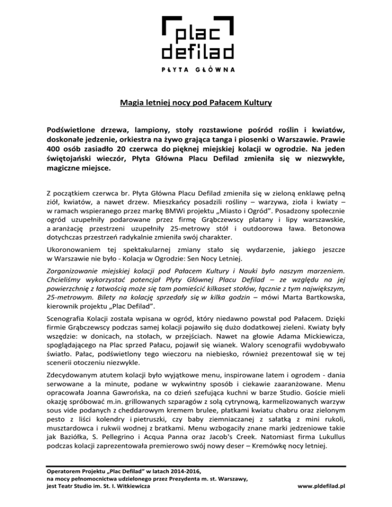 Magia letniej nocy pod Pałacem Kultury Podświetlone drzewa, lampiony, stoły rozstawione pośród roślin i kwiatów, doskonałe jedzenie, orkiestra na żywo grająca tanga i piosenki o Warszawie. Prawie 400 osób zasiadło 20 czerwca do pięknej miejskiej kolacji w ogrodzie. Na jeden świętojański wieczór, Płyta Główna Placu Defilad zmieniła się w niezwykłe, magiczne miejsce. Z początkiem czerwca br. Płyta Główna Placu Defilad zmieniła się w zieloną enklawę pełną ziół, kwiatów, a nawet drzew. Mieszkańcy posadzili rośliny – warzywa, zioła i kwiaty – w ramach wspieranego przez markę BMWi projektu „Miasto i Ogród”. Posadzony społecznie ogród uzupełniły podarowane przez firmę Grąbczewscy platany i lipy warszawskie, a aranżację przestrzeni uzupełniły 25-metrowy stół i outdoorowa ława. Betonowa dotychczas przestrzeń radykalnie zmieniła swój charakter. Ukoronowaniem tej spektakularnej zmiany stało się wydarzenie, jakiego jeszcze w Warszawie nie było - Kolacja w Ogrodzie: Sen Nocy Letniej. Zorganizowanie miejskiej kolacji pod Pałacem Kultury i Nauki było naszym marzeniem. Chcieliśmy wykorzystać potencjał Płyty Głównej Placu Defilad – ze względu na jej powierzchnię z łatwością może się tam pomieścić kilkaset stołów, łącznie z tym największym, 25-metrowym. Bilety na kolację sprzedały się w kilka godzin – mówi Marta Bartkowska, kierownik projektu „Plac Defilad”. Scenografia Kolacji została wpisana w ogród, który niedawno powstał pod Pałacem. Dzięki firmie Grąbczewscy podczas samej kolacji pojawiło się dużo dodatkowej zieleni. Kwiaty były wszędzie: w donicach, na stołach, w przejściach. Nawet na głowie Adama Mickiewicza, spoglądającego na Plac sprzed Pałacu, pojawił się wianek. Walory scenografii wydobywało światło. Pałac, podświetlony tego wieczoru na niebiesko, również prezentował się w tej scenerii otoczeniu niezwykle. Zdecydowanym atutem kolacji było wyjątkowe menu, inspirowane latem i ogrodem - dania serwowane a la minute, podane w wykwintny sposób i ciekawie zaaranżowane. Menu opracowała Joanna Gawrońska, na co dzień szefująca kuchni w barze Studio. Goście mieli okazję spróbować m.in. grillowanych szparagów z solą cytrynową, karmelizowanych warzyw sous vide podanych z cheddarowym kremem brulee, płatkami kwiatu chabru oraz zielonym pesto z liści kolendry i pietruszki, czy baby ziemniaczanej z sałatką z mini rukoli, musztardowca i rukwii wodnej z bratkami. Menu wzbogaciły znane marki jedzeniowe takie jak Baziółka, S. Pellegrino i Acqua Panna oraz Jacob's Creek. Natomiast firma Lukullus podczas kolacji zaprezentowała premierowo swój nowy deser – Kremówkę nocy letniej. Operatorem Projektu „Plac Defilad” w latach 2014-2016, na mocy pełnomocnictwa udzielonego przez Prezydenta m. st. Warszawy, jest Teatr Studio im. St. I. Witkiewicza www.pldefilad.pl Niezwykłą oprawę muzyczną stworzyła grająca na żywo Orkiestra Placu Defilad pod kierownictwem artystycznym Sebastiana Wypycha. Kolacja pod gołym niebem i rozbrzmiewający w tle Astor Piazzolla. Osiem osób na scenie. Piękne tanga polskie i argentyńskie oraz piosenki Władysława Szpilmana. Usłyszeć można było takie utwory jak "Pójdę na Stare Miasto", "W małym kinie", czy "Jeśli kochasz się w dziewczynie". Wyzwaniem okazała się pogoda. Z różnych dzielnic Warszawy docierały informacje o deszczu, który praktycznie cały wieczór nas oszczędzał. Pierwsze krople spadły pod koniec deseru. Ale zarówno orkiestra, jak i goście nie poddawali się - dodaje Marta Bartkowska. Jesteśmy szczęśliwi i wzruszeni. Dostajemy telefony, że pomysł spodobał się też naszym gościom. Chcemy, aby tego rodzaju wydarzenia, wokół stołu, większe i mniejsze, działy się na Placu Defilad częściej. Pod nazwą „Plac Defilad” kryje się zainicjowany w 2014 roku cykl wydarzeń, którego ideą jest stworzenie otwartej, przyjaznej dla mieszkańców i turystów przestrzeni miejskiej w centralnym punkcie Warszawy. Głównym organizatorem jest Miasto Warszawa, a gospodarzem stołeczny Teatr Studio. Najważniejszym symbolem miejsca jest Pałac Kultury i Nauki, będący jednocześnie jednym z partnerów projektu. Projekt współtworzą instytucje kultury oraz klubokawiarnie działające w przestrzeni Placu – m.in. barStudio i Cafe Kulturalna. Mieliśmy marzenie, żeby ożywić nieprzyjemną i wietrzną przestrzeń pod Pałacem Kultury, żeby stworzyć przestrzeń, w której Warszawiacy będą się dobrze czuli razem. Sobotnia kolacja udowadnia, że nasza międzysektorowa i międzyinstytucjonalna współpraca ma sens. Mam nadzieję, że energia, która pojawiła się między ludźmi przyniesie miastu liczne korzyści – mówi Grzegorz Lewandowski z baru Studio, pomysłodawca i kierownik programowy projektu „Plac Defilad”. Więcej informacji o wydarzeniu na stronie www.pldefilad.pl oraz na Facebooku: https://www.facebook.com/pldefilad i https://www.facebook.com/photo.php?fbid=10202974127793933&set=o.14528255282934 89&type=1&theater¬if_t=page_wall W przypadku pytań prosimy o kontakt: Monika Zagórska, Marketing & PR, Plac Defilad Tel. +48 609 793 927, e-mail: [email protected] O Placu Defilad Plac Defilad to centralny plac Warszawy, ale też zainicjowany w 2014 roku cykl wydarzeń pod wspólną nazwą „Plac Defilad”. Głównym organizatorem jest Miasto Warszawa, a gospodarzem stołeczny Teatr Studio. Osią i najważniejszym symbolem miejsca jest Pałac Kultury i Nauki, będący jednocześnie jednym z partnerów projektu. Projekt współtworzą instytucje kultury oraz klubokawiarnie działające obecnie (lub w przyszłości) w przestrzeni Placu – m.in. barStudio, Cafe Kulturalna i Teatr Dramatyczny. Ideą projektu jest stworzenie otwartej, przyjaznej dla mieszkańców przestrzeni miejskiej w centralnym punkcie Warszawy. Do współpracy zapraszani są kolejni partnerzy otwarci w swojej dzi
