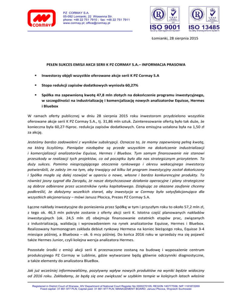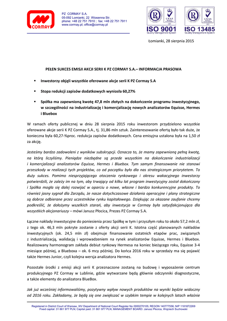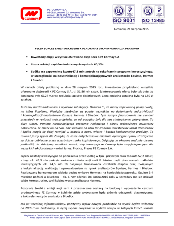 PZ CORMAY S.A. 05-092 Lomianki, 22 Wiosenna Str. phone: +48 22 751 7910 ; fax: +48 22 751 7911 www.cormay.pl; [email protected] Łomianki, 28 sierpnia 2015 PEŁEN SUKCES EMISJI AKCJI SERII K PZ CORMAY S.A.– INFORMACJA PRASOWA Inwestorzy objęli wszystkie oferowane akcje serii K PZ Cormay S.A Stopa redukcji zapisów dodatkowych wyniosła 60,27% Spółka ma zapewnioną kwotę 47,8 mln złotych na dokończenie programu inwestycyjnego, w szczególności na industrializację i komercjalizację nowych analizatorów Equisse, Hermes i Bluebox W ramach oferty publicznej w dniu 28 sierpnia 2015 roku inwestorom przydzielono wszystkie oferowane akcje serii K PZ Cormay S.A., tj. 31,86 mln sztuk. Zainteresowanie ofertą było tak duże, że konieczna była 60,27-%proc. redukcja zapisów dodatkowych. Cena emisyjna ustalona była na 1,50 zł za akcję. Jesteśmy bardzo zadowoleni z wyników subskrypcji. Oznacza to, że mamy zapewnioną pełną kwotę, na którą liczyliśmy. Pieniądze niezbędne są przede wszystkim na dokończenie industrializacji i komercjalizacji analizatorów Equisse, Hermes i Bluebox. Tym samym finansowanie nie stanowi przeszkody w realizacji tych projektów, co od początku było dla nas strategicznym priorytetem. To duży sukces. Pomimo niesprzyjającego otoczenia rynkowego i okresu wakacyjnego inwestorzy potwierdzili, że zależy im na tym, aby trwający od kilku lat program inwestycyjny został dokończony i Spółka mogła się dalej rozwijać w oparciu o nowe, własne i bardzo konkurencyjne produkty. To również jasny sygnał dla Zarządu, że nasze dotychczasowe działania operacyjne i plany strategiczne są dobrze odbierane przez uczestników rynku kapitałowego. Dziękując za okazane zaufanie chcemy podkreślić, że dołożymy wszelkich starań, aby inwestycja w Cormay była satysfakcjonująca dla wszystkich akcjonariuszy – mówi Janusz Płocica, Prezes PZ Cormay S.A. Łączne nakłady inwestycyjne do poniesienia przez Spółkę w tym i przyszłym roku to około 57,2 mln zł, z tego ok. 46,3 mln pokryte zostanie z oferty akcji serii K. Istotna część planowanych nakładów inwestycyjnych (ok. 24,5 mln zł) obejmuje finansowanie ostatnich etapów prac, związanych z industrializacją, walidacją i wprowadzeniem na rynek analizatorów Equisse, Hermes i Bluebox. Realizowany harmonogram zakłada debiut rynkowy Hermesa na koniec bieżącego roku, Equisse 3-4 miesiące później, a Blueboxa – ok. 6 mcy później. Do końca 2016 roku w sprzedaży ma się pojawić także Hermes Junior, czyli kolejna wersja analizatora Hermes. Pozostałe środki z emisji akcji serii K przeznaczone zostaną na budowę i wyposażenie centrum produkcyjnego PZ Cormay w Lublinie, gdzie wytwarzane będą głównie odczynniki diagnostyczne, a także elementy do analizatora BlueBox. Jak już wcześniej informowaliśmy, pozytywny wpływ nowych produktów na wyniki będzie widoczny od 2016 roku. Zakładamy, że będą się one zwiększać w szybkim tempie w kolejnych latach właśnie Registered in District Court of Warsaw, XIV Department of National Court Register No 0000270105; REGON 140777556; NIP 1181872269 Fixed capital: 31 861 977 PLN; Capital paid: 31 861 977 PLN; MANAGEMENT BOARD: Janusz Płocica, Wojciech Suchowski w oparciu o nowe analizatory, ponieważ potencjał tego rynku jest bardzo obiecujący, a nasze nowe produkty nowoczesne i oczekiwane przez klientów - podsumowuje Janusz Płocica. Na koniec 2013 roku wartość światowego rynku IVD (diagnostyki in vitro) szacowana była na 54,5 mld USD. Prognozy „IVD Marketreach” Enterprise Analysis Corporation zakładają, że w 2018 roku wzrośnie on do około 69,3 mld USD. dodatkowych informacji udziela: Katarzyna Sadowska CC Group Sp. z o.o. Telefon: +48 22 440 14 40 Mobile: +48 697 613 020 *** Grupa PZ Cormay to notowany na Giełdzie Papierów Wartościowych w Warszawie producent i dystrybutor najwyższej klasy odczynników diagnostycznych oraz aparatury medycznej. Produkuje i sprzedaje testy diagnostyczne dla chemii klinicznej, hematologii, koagulologii, immunologii. W swojej ofercie posiada automatyczne analizatory biochemiczne, hematologiczne oraz immunologiczne. Oferuje w pełni zautomatyzowane systemy do analizy parazytologicznej, a także próżniowy system pobierania krwi. Grupa PZ Cormay oferuje swoje produkty pod cenionymi markami PZ Cormay, Orphée (Szwajcaria), Audit Diagnostics (Irlandia) oraz Diesse (Włochy). Innowacyjność Grupy PZ Cormay wspiera doświadczony, międzynarodowy zespół badawczo-rozwojowy, a jej produkty są eksportowane do ponad 150 krajów świata. Registered in District Court of Warsaw, XIV Department of National Court Register No 0000270105; REGON 140777556; NIP 1181872269 Fixed capital: 31 861 977 PLN; Capital paid: 31 861 977 PLN; MANAGEMENT BOARD: Janusz Płocica, Wojciech Suchowski