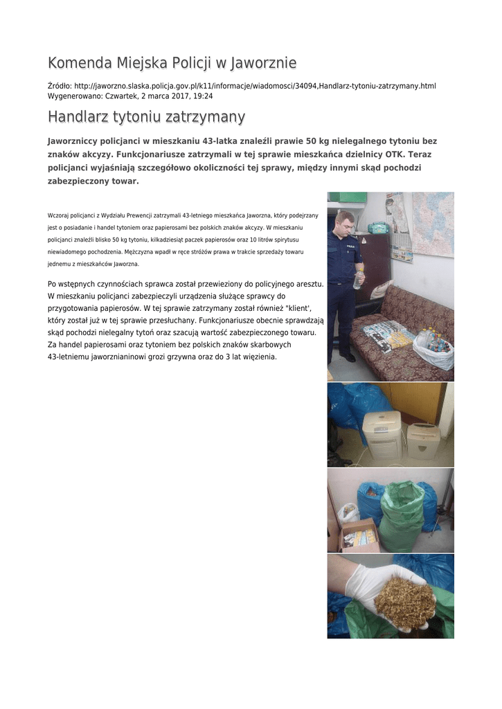 Komenda Miejska Policji w Jaworznie Źródło: http://jaworzno.slaska.policja.gov.pl/k11/informacje/wiadomosci/34094,Handlarz-tytoniu-zatrzymany.html Wygenerowano: Czwartek, 2 marca 2017, 19:24 Handlarz tytoniu zatrzymany Jaworzniccy policjanci w mieszkaniu 43-latka znaleźli prawie 50 kg nielegalnego tytoniu bez znaków akcyzy. Funkcjonariusze zatrzymali w tej sprawie mieszkańca dzielnicy OTK. Teraz policjanci wyjaśniają szczegółowo okoliczności tej sprawy, między innymi skąd pochodzi zabezpieczony towar. Wczoraj policjanci z Wydziału Prewencji zatrzymali 43-letniego mieszkańca Jaworzna, który podejrzany jest o posiadanie i handel tytoniem oraz papierosami bez polskich znaków akcyzy. W mieszkaniu policjanci znaleźli blisko 50 kg tytoniu, kilkadziesiąt paczek papierosów oraz 10 litrów spirytusu niewiadomego pochodzenia. Mężczyzna wpadł w ręce stróżów prawa w trakcie sprzedaży towaru jednemu z mieszkańców Jaworzna. Po wstępnych czynnościach sprawca został przewieziony do policyjnego aresztu. W mieszkaniu policjanci zabezpieczyli urządzenia służące sprawcy do przygotowania papierosów. W tej sprawie zatrzymany został również "klient', który został już w tej sprawie przesłuchany. Funkcjonariusze obecnie sprawdzają skąd pochodzi nielegalny tytoń oraz szacują wartość zabezpieczonego towaru. Za handel papierosami oraz tytoniem bez polskich znaków skarbowych 43-letniemu jaworznianinowi grozi grzywna oraz do 3 lat więzienia. Ocena: 0/5 (0) Tweetnij