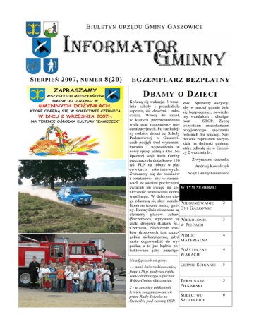 B IULETYN URZĘDU G MINY G ASZOWICE S IERPIEŃ 2007, NUMER 8(20) EGZEMPLARZ BEZPŁATNY D BAMY O D ZIECI Kończą się wakacje. 3 wrze- stwo. Sprawmy wszyscy, śnia szkoły i przedszkola aby w naszej gminie żyło zapełnią się dziećmi i mło- się bezpieczniej, powiedzdzieżą. Wrócą do szkół, my wandalom i chuligaw których przeprowadzono nom – STOP. Życzę wiele prac remontowo- mo- wszystkim mieszkańcom dernizacyjnych. Po raz kolej- przyjemnego spędzania ny rodzice dzieci ze Szkoły ostatnich dni wakacji. SerPodstawowej w Gaszowi- decznie zapraszam wszystcach podjęli trud wyremon- kich na dożynki gminne, towania i wyposażenia w które odbędą się w Czerninowy sprzęt jedną z klas. Na cy 2 września br. lipcowej sesji Rada Gminy Z wyrazami szacunku przeznaczyła dodatkowo 150 tyś. PLN na roboty w plaAndrzej Kowalczyk cówkach oświato wych. Wójt Gminy Gaszowice Zwracamy się do rodziców i opiekunów, aby w rozmowach ze swoimi pociechami zwracali im uwagę na ko- W TYM NUMERZE : nieczność szanowania dobra wspólnego. W dalszym ciągu zdarzają się akty wanda2 P ODSUMOWANIE lizmu na terenie naszej gminy. Bezmyślnie niszczone są D NI G ASZOWIC elementy placów zabaw (Szczerbice), wyrywane są P ÓŁKOLONIE 3 znaki drogowe (Łuków Śl., W P IECACH Czernica). Niszczenie znaków drogowych jest szcze4 gólnie niebezpieczne, gdyż P OMOC ATERIALNA M może doprowadzić do wypadku, a to już będzie po4 traktowane jako przestęp- P OŻYTECZNE W AKACJE Na zdjęciach od góry: L ETNIE Ś CIGANIE 1– pani Ania za kierownicą fiata 126 p, podczas rajdu samochodowego o puchar Wójta Gminy Gaszowice, T ERMINARZ 2 - uczestnicy półkolonii letnich zorganizowanych przez Radę Sołecką ze Szczerbic pod remizą OSP. 5 5 P IŁKARSKI S OŁECTWO S ZCZERBICE 6 S TR . 2 S IERPIEŃ 2007, P ODSUMOWANIE D NI G ASZOWIC W dniach 4-5 sierpnia 2007r. na terenie Ośrodka Kultury i Sportu w Gaszowicach odbyły się już XI Dni Gaszowic. Podczas dwudniowej imprezy przy pięknej pogodzie mieszkańcy Gaszowic i okolicznych miejscowości bawili się i odpoczywali przy występach zespołów muzycznych, kabaretu, miejscowej młodzieży. Atrakcją imprezy jak co roku był pokaz ogni sztucznych oraz loteria fantowa, której główną nagrodą był rower a także sprzęt AGD i RTV. Na uczestników czekały także atrakcje takie jak lunapark, zjeżdżalnie dla dzieci, stoiska handlowe. Pracownicy Ośrodka Kultury i Sportu w Gaszowicach pragną podziękować uczestnikom imprezy za wspaniałą zabawę i liczne uczestnictwo. A w szczególności pragniemy złożyć podziękowania sponsorom, którzy wsparli finansowo naszą imprezę a bez ich wsparcia impreza byłaby skromniejsza. Sponsorzy: FIRMA TCHAS Sp. z o. o. ODDZIAŁ W POLSCE Z/S W GOSTYNIU, PRZEDSIĘBIORSTWO BUDOWLANE „KUBIK” KOCIAŁKOWSKI K ANALIZACJA , JAN i KUDEJ ZBIGNIEW Z KRAKOWA, PRZEDSIĘBIORSTWO „AKWEDUKT” Sp. z o. o. z KIELC, ZAKŁADY PIWOWARSKIE TYSKIE, GMINNA SPÓŁDZIELNIA SAMOPOMOC CHŁOPSKA GASZOWICE Z/S W JEJKOWICACH, FIRMA DOMIX CZESŁAW JANYGA ZE SZCZERBIC, PRZEDSIĘB I O R S T WO H AN D LO W O USŁUGOWE DUDA Z GASZOWIC, MCJ CZOGALLA JACEK ZE SZCZERBIC, LORKENTECH BUGDOL HENRYK Z GASZOWIC, SKLEP ROLNOSPOŻYWCZY ZAWIOŁA JOANNA Z GASZOWIC, CAFE PIZZERIA ALEKSANDER ZE SZCZERBIC. Podziękowania także składam pracownikom Zakładu Komunalnego za pomoc w organizacji festynu, oraz członkom Ochotniczej Straży Pożarnej w Gaszowicach za pomoc w utrzymaniu bezpieczeństwa podczas festynu. 8(20) ZAPROSZENIE Zapraszamy wszystkich mieszkańców gminy do udziału w gminnych dożynkach, które odbędą się w sołectwie Czernica w dniu 2 września b.r. na terenie Ośrodka Kultury Zameczek. Program uroczystości: 13.00 – msza św. dożynkowa w kościele pn. NMP Królowej Polski w Czernicy; 14.00 -15.00 - przejazd korowodu dożynkowego ulicami: Wolności- Buczyna – Jana – Graniczna – Podleśna - Powstańców – Wolności ; 15.00 – powitanie, - wręczenie dożynkowego chleba, podziękowanie dla rolników; 16.00 – występy dzieci z SP Czernica i Przedszkola oraz zespołu Jutrzenka działającego przy OK Zameczek 17.00 - występ kabaretu „To nie my” 18.00 – występ zespołu SINGERS z Gimnazjum w Piecach 19.00 – występ zespołu Szlagier Maszyna 20.30 - zabawa dożynkowa, pokaz sztucznych ogni. „Remont Domu Sportu w Łukowie Śląskim wraz z zagospodarowaniem terenu” Dziękujemy wszystkim za wspól- Taką nazwę nosi projekt realizowany w Łukowie Śląną zabawę i zapraszamy za rok na skim. W ramach zadania wymieniona zostanie część kolejne już XII DNI GASZOWIC okien w budynku Domu Sportu a tuż przy remizie pojaw drugi weekend sierpnia 2008r. Jerzy Białek DROGA Realizując budowę sieci kanalizacji sanitarnej musimy spełnić wymogi jakie narzuciła nam Unia Europejska. Otrzymaliśmy fundusze na budowę sieci kanalizacyjnej oraz odnowę zniszczonych podczas prac dróg i chodników do stanu pierwotnego czyli stanu przed wejściem w teren firm wykonawczych. Odnosimy jednak wrażenie, że dla mieszkańców nie jest ważna poprawa środowiska naturalnego w którym żyjemy a wykonanie własnego wjazdu na posesję. Firmy wykonawcze wykonały zdjęcia wszystkich ulic i wjazdów, aby wiedzieć jak mają zostać odnowione (ponieważ mieszkańcy posuwają się NUMER C ZY W JAZD ? nawet do kłamstw). Przyjęto następującą zasadę: gdzie zjazd był i wynika to ze zdjęć tam będzie odnowiony, zaś gdzie nie było- wykonany będzie ok. 0,5 – 1,0m zjazd w zależności od nachylenia terenu. Niestety zasada ta nie przemawia do mieszkańców, którzy wielokrotnie w wulgarny sposób chcą wymóc wykonanie własnego wjazdu na posesję. W ramach realizowanego zadania nie jest to jednak możliwe. Prywatne zjazdy firmy wykonujące dywaniki asfaltowe mogą wykonać każdemu chętnemu właścicielowi na umowę zlecenie. Mamy nadzieję, że powyższe zasady są bardzo jasne i spotkają się ze zrozumieniem mieszkańców. Refer