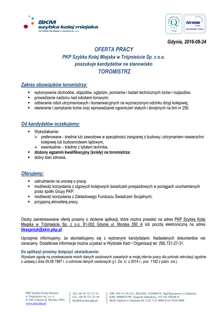 Gdynia, 2016-08-24 OFERTA PRACY PKP Szybka Kolej Miejska w Trójmieście Sp. z o.o. poszukuje kandydatów na stanowisko TOROMISTRZ Zakres obowiązków toromistrza: wykonywanie obchodów, objazdów, oględzin, pomiarów i badań technicznych torów i rozjazdów; prowadzenie nadzoru nad robotami torowymi; odbieranie robot utrzymaniowych i konserwacyjnych na wyznaczonym odcinku drogi kolejowej; otwieranie i zamykanie torów oraz wprowadzanie ograniczeń stałych i doraźnych na linii nr 250. Od kandydatów oczekujemy: Wykształcenie: preferowane - średnie lub zawodowe w specjalności związanej z budową i utrzymaniem nawierzchni kolejowej lub budownictwem lądowym, ewentualnie – średnie z tytułem technika. złożony egzamin kwalifikacyjny (ścisły) na toromistrza; dobry stan zdrowia. Oferujemy: zatrudnienie na umowę o pracę; możliwość korzystania z ulgowych kolejowych świadczeń przejazdowych w pociągach uruchamianych przez spółki Grupy PKP; możliwość korzystania z Zakładowego Funduszu Świadczeń Socjalnych; przyjazną atmosferę pracy. Osoby zainteresowane ofertą prosimy o złożenie aplikacji, które można przesłać na adres PKP Szybka Kolej Miejska w Trójmieście Sp. z o.o. 81-002 Gdynia ul. Morska 350 A lub pocztą elektroniczną na adres [email protected] Uprzejmie informujemy, że skontaktujemy się z wybranymi kandydatami. Nadesłanych dokumentów nie zwracamy. Dodatkowe informacje można uzyskać w Wydziale Kadr i Organizacji tel. (58) 721-27-31. Do aplikacji prosimy dołączyć oświadczenie: Wyrażam zgodę na przetwarzanie moich danych osobowych zawartych w mojej ofercie pracy dla potrzeb rekrutacji zgodnie z ustawą z dnia 29.08.1997 r. o ochronie danych osobowych (j.t. Dz. U. z 2014 r., poz. 1182 z późn. zm.). PKP Szybka Kolej Miejska w Trójmieście sp. z o. o. 81-002 Gdynia ul. Morska 350A www.skm.pkp.pl Tel.+48 58 721-27-31 Fax +48 58 721-27-58 [email protected] NIP: 958-13-70-512 | REGON: 192488478 | Sąd Rejestrowy w Gdańsku KRS: 0000076705 | Kapitał Zakładowy 155 185 500,00 zł BGK Oddział w Gdańsku 88 1130 1121 0080 0116 9520 0008