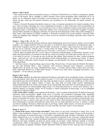Dzień 1: Mk 9, 38-40 1. Być uczniem Pana oznacza nieustannie wierzyć w Chrystusa. Wsłuchiwać się w Mistrza i postępować zgodnie z tym co On naucza. Jak to wygląda u Ciebie? Pozorny uczeń Jezusa przypisuje sobie wyłączność na to, by głosić czy też uzdrawiać innych. Prawdziwy uczeń Jezusa nie tylko sam głosi i uzdrawia w Imię Jezusa, ale cieszy się gdy widzi jak inni głoszą Chrystusa, jak uwalniają czy też uzdrawiają. Do jakich uczniów się zaliczam? 2. Bycie w Kościele Rzymsko-Katolickim wiąże się z tym, że możemy przynależeć do różnych wspólnot, które się w Nim rozwijają. Udzielając się w tych wspólnotach rozwijamy w sobie różne dary, które otrzymaliśmy od Pana. Staramy się nimi posługiwać. Lecz czasami bywa tak, że nasza wspólnota wydaje się nam lepsza od innej i traktujemy siebie, a nawet Boga na wyłączność. Popatrz wraz z Jezusem jak to rzeczywiście wygląda ? Uczniom Jezusa brakło otwartości na drugiego człowieka, ba nawet nie byli tolerancyjni wobec innej osoby działającej w Imię Jezusa. Jeśli należysz do jakiejś wspólnoty w Kościele to przyjrzyj się swoim myślom, uczuciom, które rodzą się względem niej. Pamiętaj o tym, że Jezus wzywa do otwarcia na każdego człowieka, który działa na chwałę Boga. Dzień 2: 1 Kor 3, 9b – 11. 16 – 17 1. Jako wspólnota Kościoła jesteśmy budowlą, której fundamentem jest Jezus Chrystus. Każdy z nas jest jakby cegiełką w tej wielkiej budowli. Wszyscy jak jeden w tej budowli mamy odniesienie do fundamentu, gdyż w przeciwnym wypadku nasz byt jako budowli byłby zawieszony w próżni. Cegły muszą być na czymś oparte – dla nas jest to Chrystus. Pomyśl więc o Twojej relacji do Niego. Zobacz, jaką masz świadomość tego, że wszystko w Twoim życiu ma się odbywać przez Chrystusa, z Chrystusem i w Chrystusie. 2. Paweł jakby zaczepnie pyta nas, czy nie wiemy, że jesteśmy świątynią Boga i że Duch Boży mieszka w nas? Jakby chciał powiedzieć, że powinno to być dla nas czymś oczywistym. Nie tylko jako pewnik, jak to że 2+2 = 4, ale także by tym żyć. Ta prawda ma stać się dla nas jak oddech. Duch mieszka we mnie i jestem świątynią Boga – mam tym żyć. Ale czy tak jest naprawdę? Jestem świątynią Boga i ta świątynia jest święta. To mocne słowa. Pomyśl o sobie jako o kimś świętym. Nie dlatego, że jesteś idealny i bez skazy, ale dlatego, że mieszka w Tobie Duch Boży. 3. Jeśli ktoś zniszczy świątynię Boga, tego zniszczy Bóg. Pomyśl teraz o Twojej relacji do bliźnich. Bo każdy z nas jest taką budowlą Bożą i Jego świątynią. Jeśli niszczysz bliźniego przez kłamstwo, oszczerstwo, obgadywanie, złe myśli, złe czyny, niepohamowany język… to Ciebie zniszczy Bóg. Czujesz moc tych słów, które wypowiada Paweł? Czy widzisz takie obszary w Twoim życiu, które może wymagają nawrócenia w tym względzie – i to im szybciej, tym lepiej? Dzień 3: Mt 5, 43-48 1. Boża łaska. Zdolność do miłowania nieprzyjaciół dotyczy człowieka, który ma głęboką relację z Chrystusem. Jezus powiedział „beze Mnie nic nie możecie uczynić” (J 15,5). Bez Jego łaski nie przebaczę ludziom, którzy skrzywdzili mnie lub moich bliskich. Bez Jego łaski nie będę szczerze i autentycznie modlił się za ludzi, którzy stoją lub pretendują do objęcia władzy w kraju. Bez Jego łaski nie będę szukał choćby najmniejszego usprawiedliwienia dla tych, którzy przyczynili się do mojego bólu. Bez Jego łaski nie dostrzegę pozytywów w wyznawcach innych niż chrześcijańska religii świata. Czy doświadczyłem już w swoim życiu niemocy, aby z miłością spojrzeć na mojego wroga? Na ile liczyłem w takich sytuacjach na Bożą łaskę, a na ile polegałem wyłącznie na własnych siłach? 2. Być synem Ojca w niebie. Jezus zaprasza do heroizmu – mówi o miłości nieprzyjaciół. W duchu Jezusowego nauczania wielu męczenników oddało swoje życie za Prawdę. Ich świadectwo umacniało tylko wspólnotę wierzących i było czynnikiem ogólnego wzrostu. Jezus obiecuje przybrane synostwo każdemu z nas kto tylko nauczy się prawdziwie kochać. Jest to możliwe tylko wtedy, gdy będę kochał nie wysiłkiem swojej kruchej woli, ale licząc na Tego, że nauczy mnie tego ten, kto umarł za mnie, abym prawdziwie żył. Być synem lub córką Ojca niebieskiego to również doświadczenie, które może stać się moim udziałem już teraz, w sytuacji, w jakiej się obecnie znajduję. Wystarczy całkowicie zdać się na Niego, zaufać, oddać ciężary, otworzyć się na łaskę. Czy jestem w stanie zrobić krok w kierunku Ojca? Czy pozwolę Mu, aby mnie wziął w swoje ramiona? Dzień 4: Ap 2,1-7 1. „Znam twoje czyny: trud i twoją wytrwałość”. Jezus mówi, że zna czyny wierzących w Niego. Wie, co się dzieje w Jego wspólnocie. Oznacza to, że się nią interesuje, że jest dla Niego ważna. Zwraca się do Kościoła w Efezie zaczynając od wymieniania tego, co jest dobre w postępowaniu jego członków. Odwołuje się do dobra. Jakby dziękował im za to, że czynią dobro. Trud, wytrwałość, nienawiść do zła, znoszenie cierpień dla imienia Jezusa… Miasto Efez było ważnym ośrodkiem kulturalnym i handlowym ówczesnego świata hellenistycznego. Położone nad rzeką, niedaleko od ujścia do morza mogło się rozwijać i miało ułatwiony kontakt ze światem zewnętrznym, ludzie tu mieszkający mieli kontakt z różnymi prądami myślowymi. Rozwijał się tu też kult bogów greckich, szczególnie Artemidy. Pobyty apostołów Pawła (w latach 52-56) i Jana (po roku 70) sprawiły, że wspólnota Kościoła była liczna i ośrodek ten stał się ważniejszym pośród innych gmin chrześcijańskich w tym regionie. Chrześcijanie zapewne musieli niejednokrotnie bronić swoich racji, uzasadniać swoją wiarę. Pomyśl przez chwilę, co jest Twoim trudem i wytrwałością w kroczeniu za Jezusem? Nazwi