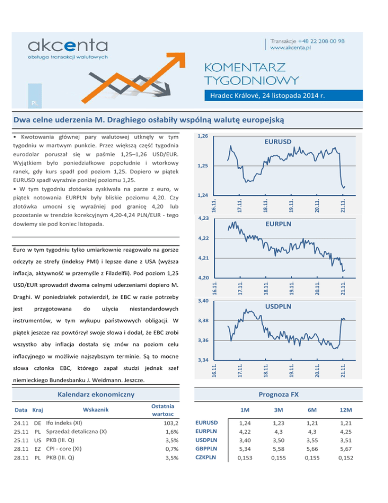 Hradec Králové, 24 listopada 2014 r. Dwa celne uderzenia M. Draghiego osłabiły wspólną walutę europejską 1,26 EURUSD 1,25 21.11. 20.11. 19.11. 18.11. 17.11. 1,24 16.11. • Kwotowania głównej pary walutowej utknęły w tym tygodniu w martwym punkcie. Przez większą część tygodnia eurodolar poruszał się w paśmie 1,25–1,26 USD/EUR. Wyjątkiem było poniedziałkowe popołudnie i wtorkowy ranek, gdy kurs spadł pod poziom 1,25. Dopiero w piątek EURUSD spadł wyraźnie poniżej poziomu 1,25. • W tym tygodniu złotówka zyskiwała na parze z euro, w piątek notowania EURPLN były bliskie poziomu 4,20. Czy złotówka umocni się wyraźniej pod granicę 4,20 lub pozostanie w trendzie korekcyjnym 4,20-4,24 PLN/EUR - tego dowiemy sie pod koniec listopada. 4,23 EURPLN 4,22 Euro w tym tygodniu tylko umiarkownie reagowało na gorsze jest przygotowana do użycia 21.11. 20.11. 3,40 USDPLN niestandardowych instrumentów, w tym wykupu państwowych obligacji. W 19.11. Draghi. W poniedziałek potwierdził, że EBC w razie potrzeby 18.11. 4,20 USD/EUR sprowadził dwoma celnymi uderzeniami dopiero M. 17.11. inflacja, aktywność w przemyśle z Filadelfii). Pod poziom 1,25 4,21 16.11. odczyty ze strefy (indeksy PMI) i lepsze dane z USA (wyższa 3,38 piątek jeszcze raz powtórzył swoje słowa i dodał, że EBC zrobi 21.11. 19.11. 20.11. 3,34 18.11. słowa członka EBC, którego zapał studzi jednak szef 17.11. inflacyjnego w możliwie najszybszym terminie. Są to mocne 3,36 16.11. wszystko aby inflacja dostała się znów na poziom celu niemieckiego Bundesbanku J. Weidmann. Jeszcze. Kalendarz ekonomiczny Data Kraj 24.11 25.11 25.11 28.11 28.11 DE PL US EZ PL Wskaznik Ifo indeks (XI) Sprzedaż detaliczna (X) PKB (III. Q) CPI - core (XI) PKB (III. Q) Prognoza FX Ostatnia wartosc 103,2 1,6% 3,5% 0,7% 3,5% EURUSD EURPLN USDPLN GBPPLN CZKPLN 1M 3M 6M 12M 1,24 4,22 3,40 5,34 0,153 1,23 4,3 3,50 5,58 0,155 1,21 4,3 3,55 5,66 0,155 1,21 4,25 3,51 5,67 0,152
