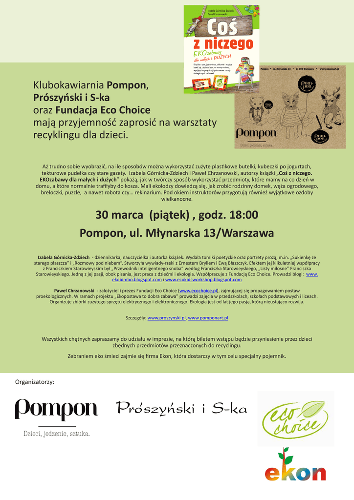 Jak razem z dziećmi spędzić czas twórczo, ciekawie i mądrze, wykorzystując to, co mamy na co dzień w domu? Odpowiedź brzmi: EKOZABAWY! W ekozabawach wykorzystuje się przedmioty, które normalnie trafiłyby do kosza, takie jak butelki po napojach, słoiki po dżemach i słoiczki niemowlęce, rolki po papierze toaletowym, tekturowe opakowania, pudełka po butach czy stare gazety. Prace artystyczne oraz zabawy ruchowe proponowane w książce są proste i nie wymagają specjalnych przygotowań i zakupów. Większość dzieł dziecko może wykonać samo, nawet bez pomocy rodzica, z tego co aktualnie ma w domu. Książka jest przeznaczona dla dzieci w wieku przedszkolnym oraz szkolnym, ich rodziców, a także nauczycieli. Ekozabawy rozwijają zdolności manualne, wzbogacają postrzeganie świata i pobudzają wyobraźnię, stając się twórczą inspiracją. Zagadnienia ekologiczne dzieci przyswajają w sposób naturalny, poprzez zabawę. Książka powstała w oparciu o warsztaty kreatywne Ekolandia. Przyda się w każdym domu oraz bibliotece. Dzięki niej dzieci nigdy nie będą narzekać na nudę! PAWEŁ CHRZANOWSKI założyciel i prezes Fundacji Eco Choice, zajmującej się propagowaniem postaw proekologicznych. W ramach projektu „Ekopostawa to dobra zabawa” prowadzi zajęcia w przedszkolach, szkołach podstawowych i liceach. Organizuje zbiórki zużytego sprzętu elektrycznego i elektronicznego. Ekologia jest od lat jego pasją. www.ecochoice.pl dziennikarka, nauczycielka i autorka książek Sukienka ze starego płaszcza, Rozmowy pod niebem, Przewodnik inteligentnego snoba według Franciszka Starowieyskiego, Listy miłosne Franciszka Starowieyskiego, wywiadów z Ernestem Bryllem i Ewą Błaszczyk. Jej pasją obok pisania jest praca z dziećmi i ekologia. Prowadzi warsztaty ekologiczne. Autorka współpracuje z Fundacją Eco Choice. www.ekobimbo.blogspot.com Coś z niczego EKOzabawy dla małych i DUŻYCH IZABELA GÓRNICKA-ZDZIECH Izabela Górnicka-Zdziech Paweł Chrzanowski 55 ekozabaw dla małych i DUŻYCH Izabela Górnicka-Zdziech Paweł Chrzanowski Coś z niczego EKOzabawy UŻYCH dla małych i D Książka o tym, jak twórczo, ciekawie i mądrze bawić się z dziećmi tym, co mamy w domu, wpajając im przy okazji podstawowe zasady ekologicznych zachowań. Klubokawiarnia Pompon, Prószyński i S-ka oraz Fundacja Eco Choice mają przyjemność zaprosić na warsztaty recyklingu dla dzieci. Cena 25,90 zł ISBN 978-83-7839-047-3 PAT R O N AT M E D I A L N Y Aż trudno sobie wyobrazić, na ile sposobów można wykorzystać zużyte plastikowe butelki, kubeczki po jogurtach, tekturowe pudełka czy stare gazety. Izabela Górnicka-Zdziech i Paweł Chrzanowski, autorzy książki „Coś z niczego. EKOzabawy dla małych i dużych” pokażą, jak w twórczy sposób wykorzystać przedmioty, które mamy na co dzień w domu, a które normalnie trafiłyby do kosza. Mali ekolodzy dowiedzą się, jak zrobić rodzinny domek, węża ogrodowego, breloczki, puzzle, a nawet robota czy… rekinarium. Pod okiem instruktorów przygotują również wyjątkowe ozdoby wielkanocne. 30 marca (piątek) , godz. 18:00 Pompon, ul. Młynarska 13/Warszawa Izabela Górnicka-Zdziech - dziennikarka, nauczycielka i autorka książek. Wydała tomiki poetyckie oraz portrety prozą, m.in. „Sukienkę ze starego płaszcza” i „Rozmowy pod niebem”. Stworzyła wywiady-rzeki z Ernestem Bryllem i Ewą Błaszczyk. Efektem jej kilkuletniej współpracy z Franciszkiem Starowieyskim był „Przewodnik inteligentnego snoba” według Franciszka Starowieyskiego, „Listy miłosne” Franciszka Starowieyskiego. Jedną z jej pasji, obok pisania, jest praca z dziećmi i ekologia. Współpracuje z Fundacją Eco Choice. Prowadzi blogi: www. ekobimbo.blogspot.com i www.ecokidsworkshop.blogspot.com Paweł Chrzanowski - założyciel i prezes Fundacji Eco Choice (www.ecochoice.pl), zajmującej się propagowaniem postaw proekologicznych. W ramach projektu „Ekopostawa to dobra zabawa” prowadzi zajęcia w przedszkolach, szkołach podstawowych i liceach. Organizuje zbiórki zużytego sprzętu elektrycznego i elektronicznego. Ekologia jest od lat jego pasją, którą nieustająco rozwija. Szczegóły: www.proszynski.pl, www.pomponart.pl Wszystkich chętnych zapraszamy do udziału w imprezie, na którą biletem wstępu będzie przyniesienie przez dzieci zbędnych przedmiotów przeznaczonych do recyclingu. Zebraniem eko śmieci zajmie się firma Ekon, która dostarczy w tym celu specjalny pojemnik. Organizatorzy:
