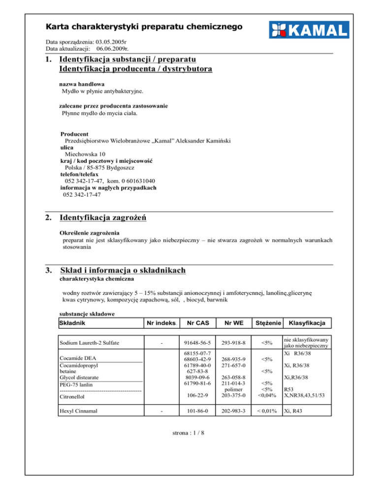 Karta charakterystyki preparatu chemicznego Data sporządzenia: 03.05.2005r Data aktualizacji: 06.06.2009r. 1. Identyfikacja substancji / preparatu Identyfikacja producenta / dystrybutora nazwa handlowa Mydło w płynie antybakteryjne. zalecane przez producenta zastosowanie Płynne mydło do mycia ciała. Producent Przedsiębiorstwo Wielobranżowe „Kamal” Aleksander Kamiński ulica Miechowska 10 kraj / kod pocztowy i miejscowość Polska / 85-875 Bydgoszcz telefon/telefax 052 342-17-47, kom. 0 601631040 informacja w nagłych przypadkach 052 342-17-47 2. Identyfikacja zagrożeń Określenie zagrożenia preparat nie jest sklasyfikowany jako niebezpieczny – nie stwarza zagrożeń w normalnych warunkach stosowania 3. Skład i informacja o składnikach charakterystyka chemiczna wodny roztwór zawierający 5 – 15% substancji anionoczynnej i amfoterycnnej, lanolinę,glicerynę kwas cytrynowy, kompozycję zapachową, sól, , biocyd, barwnik substancje składowe Składnik Sodium Laureth-2 Sulfate Nr indeks. Nr CAS Nr WE Stężenie - 91648-56-5 293-918-8 <5% 268-935-9 271-657-0 <5% 68155-07-7 68603-42-9 61789-40-0 627-83-8 8039-09-6 61790-81-6 Cocamide DEA Cocamidopropyl betaine Glycol distearate PEG-75 lanlin ------------------------------------------Citronellol Hexyl Cinnamal - Klasyfikacja nie sklasyfikowany jako niebezpieczny Xi R36/38 Xi, R36/38 <5% 106-22-9 263-058-8 211-014-3 polimer 203-375-0 <5% <5% <0,04% R53 X,NR38,43,51/53 101-86-0 202-983-3 < 0,01% Xi, R43 strona : 1 / 8 Xi,R36/38 Karta charakterystyki preparatu chemicznego Data sporządzenia: 03.05.2005r Data aktualizacji: 06.06.2009r. Benzyl Salicylate Butylphenyl Methylpropional Geraniol Hydroxycitronellal Eugenol mieszanina 5-chloro-2-metylo-2Hizotiazol-3-onu, 2-metylo-2Hizotiazol-3-onu - 118-58-1 80-54-6 106-24-1 107-75-5 9753-0 204-262-9 201-289-8 203-377-1 203518-7 202-589-1 < 0,01% <0,011% <0,01% <0,01% <0,003% Xi,N R38,43,51/53 Xn, R22,43 Xi, R38,43 Xi, R38,43 Xi,R38,43,52/53 613-167-00-5 55965-84-9 247-500-7 < 0,001% T ; R23/24/25 C ; R34-43 N ; R50/53 4. Pierwsza pomoc informacje ogólne produkt nie zawiera w swoim składzie substancji niebezpiecznych w stężeniach mogących powodować zagrożenia dla zdrowia, przy zachowaniu normalnych warunków stosowania. Poniżej podano zasady postępowania po ekspozycji na znaczne ilości produktu powstałej w wyniku awarii lub niewłaściwego użycia po kontakcie ze skórą Badania dermatologiczne pozytywne. po kontakcie z oczami płukać oczy co najmniej 15 minut dużą ilością chłodnej wody, najlepiej bieżącej (unikać silnego strumienia wody ze względu na ryzyko mechanicznego uszkodzenia rogówki). W przypadku utrzymującego się podrażnienia oczu - skonsultować się z okulistą. po połknięciu nie wywoływać wymiotów. Wypłukać jamę ustną i popić obficie wodą. W przypadku wystąpienia jakichkolwiek niekorzystnych objawów (np. nudności, ból brzucha, zawroty głowy) wezwać lekarza. 5. Postępowanie w przypadku pożaru odpowiednie środki gaśnicze piana, dwutlenek węgla, proszek gaśniczy, mgła (woda) środki gaśnicze, nieodpowiednie ze względów bezpieczeństwa pełny strumień wody szczególne zagrożenie ze strony preparatu, jego produktów spalania lub powstających gazów w przypadku pożaru mogą wydzielać się niebezpieczne produkty spalania. Wdychanie niebezpiecznych produktów spalania może powodować poważne szkody w stanie zdrowia. specjalne wyposażenie ochronne przy zwalczaniu pożaru w przypadku dużego pożaru: nałożyć odzież ochronną i aparat izolujący drogi oddechowe. strona : 2 / 8 Karta charakterystyki preparatu chemicznego Data sporządzenia: 03.05.2005r Data aktualizacji: 06.06.2009r. informacje dodatkowe w razie pożaru chłodzić wodą (prądem rozproszonym) zagrożone pojemniki. Nie pozwolić na przedostanie się wody gaśniczej do kanalizacji, zbiorników wodnych lub gleby. 6. Postępowanie w przypadku niezamierzonego uwolnienia do środowiska Przestrzegać środków bezpieczeństwa, typowych przy obchodzeniu się z chemikaliami. Niebezpieczeństwo poślizgu na skutek rozlania produktu . Personelowi zbierającemu rozsypany/rozlany produkt należy dostarczyć środki ochrony osobistej (patrz pkt. 8). Zabezpieczenie środowiska: Przeszkodzić wdzieraniu się do zbiorników wodnych, kanalizacji i gleby. W przypadku przedostania się znacznych ilości produktu do zbiorników wodnych, kanalizacji lub gleby poinformować władze (Inspektorat Ochrony Środowiska, straż pożarna, urząd gminy). Wyciek: Przy dużych wyciekach produktu zebraną ciecz odpompować. Resztę rozlanego produktu zebrać niezwłocznie za pomocą absorbujących materiałów (piasek, ziemia, ziemia okrzemkowa, wermikulit i in.) do zamkniętego pojemnika. Zanieczyszczoną powierzchnię spłukać wodą. Metody unieszkodliwiania: zgodnie z ustawą z dnia 27 kwietnia 2001 o odpadach (Dz. U. Nr 62, poz. 628) oraz rozporządzeniem Ministra Środowiska z dnia 27 września 2001 w sprawie katalogu odpadów (Dz. U. Nr 112, poz. 1206). Produkt, który utracił swoje własności eksploatacyjne należy gromadzić w odpowiednich pojemnikach, a następnie poddać utylizacji. 7. Postępowanie z preparatem i jego magazynowanie wskazówki na temat bezpiecznego obchodzenia się z danym produktem pojemnik (opakowanie) przechowywać szczelnie zamknięty – podczas stosowania unikać kontaktu z oczami, przestrzegać zasad higieny osobistej. wskazówki na temat ochrony przeciwpożarowej i przeciwwybuchowej produkt niepalny. wymagania pod względem pomieszczeń magazynowych i pojemników zalecane jest przechowywanie w pomieszczeniu zabezpieczonym przed bezpośrednim działaniem promieni słonecznych, z dala od źródeł ciepła (składowanie w temperaturze od -8 do 250C). wspólne magazynowanie przechowywać z dala od artykułów spożywczych 8. Kontrola narażenia i środki ochrony indywidualnej Najwyższe dopuszczalne stężenia Zgodnie z Rozporządzeniem Ministra Pracy i