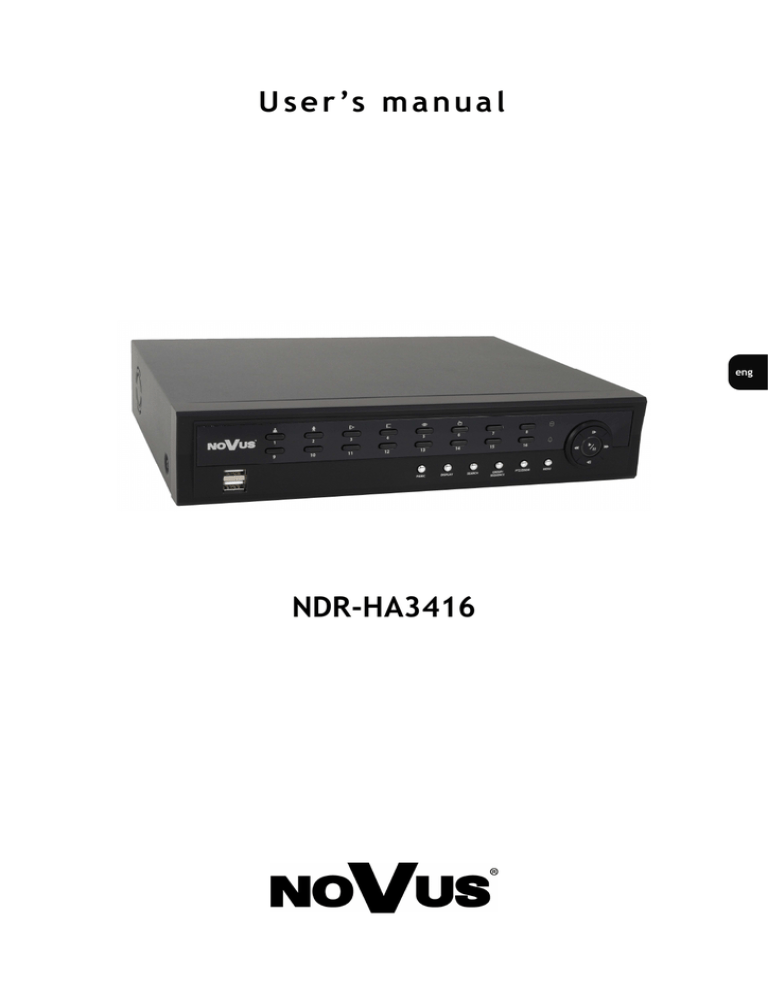 U s e r ’s m a n u a l NDR-HA3416 NDR-HA3416 1.0 version - User’s manual COMMENTS AND WARNINGS EMC (2004/108/EC) and LVD (2006/95/EC ) Directives CE Marking Our products are manufactured to comply with requirements of following directives and national regulations implementing the directives: • • Electromagnetic compatibility EMC 2004/108/EC. Low voltage LVD 2006/95/EC with further amendment. The Directive applies to electrical equipment designed for use with a voltage rating of between 50VAC and 1000VAC as well as 75VDC and 1500VDC. WEEE Directive 2002/96/EC Information on Disposal for Users of Waste Electrical and Electronic Equipment This appliance is marked according to the European Directive on Waste Electrical and Electronic Equipment (2002/96/EC) and further amendments. By ensuring this product is disposed of correctly, you will help to prevent potential negative consequences for the environment and human health, which could otherwise be caused by inappropriate waste handling of this product. The symbol on the product, or the documents accompanying the product, indicates that this appliance may not be treated as household waste. It shall be handed over to the applicable collection point for the waste electrical and electronic equipment for recycling purpose. For more information about recycling of this product, please contact your local authorities, your household waste disposal service or the shop where you purchased the product. RoHS Directive 2002/95/EC Concerning for human health protection and friendly environment, we assure that our products falling under RoHS Directive regulations, regarding the restriction of the use of hazardous substances in electrical and electronic equipment, were designed and manufactured in compliance with mentioned regulation. Simultaneously, we claim that our products were tested and do not contain hazardous substances exceeding limits which could have negative impact on human health or natural environment. Information The device, as a part of professional CCTV system used for surveillance and control, is not designed for self installation in households by individuals without technical knowledge. All rights reserved © AAT Holding Sp. z o.o. 2 NDR-HA3416 1.0 version - User’s manual SAFETY REQUIREMENTS ATTENTION! PRIOR TO UNDERTAKING ANY ACTION THAT IS NOT PROVISIONED FOR THE GIVEN PRODUCT IN ITS USER’S MANUAL AND OTHER DOCUMENTS DELIVERED WITH THE PRODUCT, OR THAT ARISES FROM THE NORMAL APPLICATION OF THE PRODUCT, ITS MANUFACTURER MUST BE CONTACTED OR THE RESPONSIBILITY OF THE MANUFACTURER FOR THE RESULTS OF SUCH AN ACTION SHELL BE EXCLUDED. 1. The installation of NDR-HA3416 should be made by a qualified service person or a professional safety system installer. 2. Recorders mustn’t be placed in places where ventilating holes are partially or fully covered. 3. User’s interference inside the device is not allowed and is unnecessary as it does not have any systems which require adjusting or which are suitable for self-repair. You mustn’t dismantle the recorder or remove any single fastening screws. If any repairs are necessary contact the service. The device must be take care of and protected against any mechanical damage. 4. The recorder has to be protected against humidity and dust. In case the recorder had a contact with water react immediately: switch off the power supply and contact the authorised Novus service. If the device gets dirty it might get damaged or electrocute someone. 5. The device can only be cleaned with a damp cloth after the power supply has been switched off. Avoid strong detergents (liquids and sprays). Mild detergents can be used if the recorder becomes very dirty. 6. Power supply unit cords and signal cords should be laid in a way that eliminates the risk of mechanical damage; special attention should be paid to the plug. Be careful not to overload sockets and extension cords so that there is no fire. 7. To avoid recorder’s damage vision and control signals should be equipped with systems protecting against disturbances, over voltage and atmospheric discharge that are in compliance with Polish regulations. It is also advised to use ground loop isolators. 8. The device mustn’t be used in conditions which do not fulfil operating requirements as far as power supply, relative humidity or air temperature are concerned. 9. You cannot allow any metal objects get inside the recorder. It might cause serious damage. If a metal object gets inside the device contact the authorised Novus service immediately. 10. The manufacturer does not bear responsibility for damage or loss of data stored on HDDs or other media occurred during the usage of the product. All rights reserved © AAT Holding Sp. z o.o. 3 NDR-HA3416 1.0 version - User’s manual TABLE OF CONTENT 1. FOREWORD INFORMATION ...............................................................................................6 1.1 Main Characteristics ............................................................................................................6 1.2 Recorder’s technical data.....................................................................................................7 2. STARTING THE DEVICE .......................................................................................................8 2.1 Getting ready to work.........................................................................................................8 2.2 Electrical connection and other rear panel components ....................................................9 2.3 Connecting peripherals....................................................................................................11 2.4 Front panel description....................................................................................................12 2.5 Remote controller ............................................................................................................14 2.6 HDD Installation .......