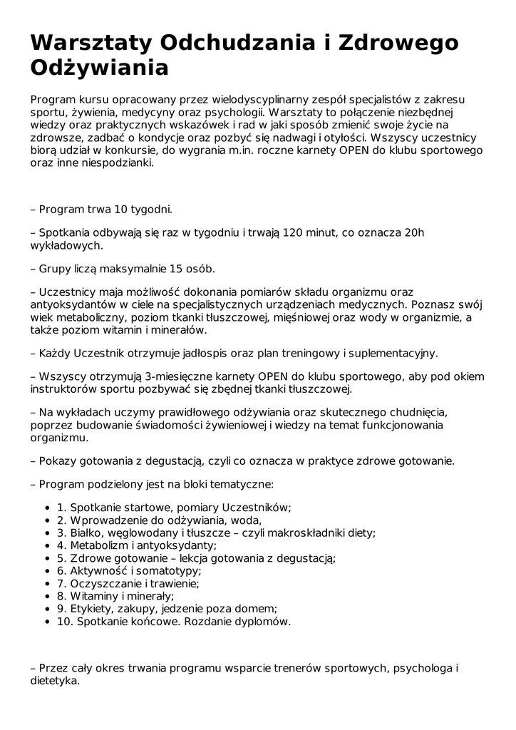 Warsztaty Odchudzania i Zdrowego Odżywiania Program kursu opracowany przez wielodyscyplinarny zespół specjalistów z zakresu sportu, żywienia, medycyny oraz psychologii. Warsztaty to połączenie niezbędnej wiedzy oraz praktycznych wskazówek i rad w jaki sposób zmienić swoje życie na zdrowsze, zadbać o kondycje oraz pozbyć się nadwagi i otyłości. Wszyscy uczestnicy biorą udział w konkursie, do wygrania m.in. roczne karnety OPEN do klubu sportowego oraz inne niespodzianki. – Program trwa 10 tygodni. – Spotkania odbywają się raz w tygodniu i trwają 120 minut, co oznacza 20h wykładowych. – Grupy liczą maksymalnie 15 osób. – Uczestnicy maja możliwość dokonania pomiarów składu organizmu oraz antyoksydantów w ciele na specjalistycznych urządzeniach medycznych. Poznasz swój wiek metaboliczny, poziom tkanki tłuszczowej, mięśniowej oraz wody w organizmie, a także poziom witamin i minerałów. – Każdy Uczestnik otrzymuje jadłospis oraz plan treningowy i suplementacyjny. – Wszyscy otrzymują 3-miesięczne karnety OPEN do klubu sportowego, aby pod okiem instruktorów sportu pozbywać się zbędnej tkanki tłuszczowej. – Na wykładach uczymy prawidłowego odżywiania oraz skutecznego chudnięcia, poprzez budowanie świadomości żywieniowej i wiedzy na temat funkcjonowania organizmu. – Pokazy gotowania z degustacją, czyli co oznacza w praktyce zdrowe gotowanie. – Program podzielony jest na bloki tematyczne: 1. Spotkanie startowe, pomiary Uczestników; 2. Wprowadzenie do odżywiania, woda, 3. Białko, węglowodany i tłuszcze – czyli makroskładniki diety; 4. Metabolizm i antyoksydanty; 5. Zdrowe gotowanie – lekcja gotowania z degustacją; 6. Aktywność i somatotypy; 7. Oczyszczanie i trawienie; 8. Witaminy i minerały; 9. Etykiety, zakupy, jedzenie poza domem; 10. Spotkanie końcowe. Rozdanie dyplomów. – Przez cały okres trwania programu wsparcie trenerów sportowych, psychologa i dietetyka. Start Warsztatów 14.03.2016 Mokotów , 15.03.2016 Ursynów , 17.03.2016 Bielany Link do wydarzenia: http://bonavita.pl/kalendarz/lw/warsztaty-odchudzania-i-zdrowegoodzywiania