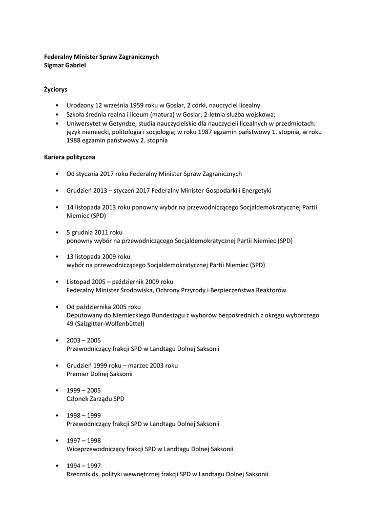 Federalny Minister Spraw Zagranicznych Sigmar Gabriel Życiorys • • • Urodzony 12 września 1959 roku w Goslar, 2 córki, nauczyciel licealny Szkoła średnia realna i liceum (matura) w Goslar; 2-letnia służba wojskowa; Uniwersytet w Getyndze, studia nauczycielskie dla nauczycieli licealnych w przedmiotach: język niemiecki, politologia i socjologia; w roku 1987 egzamin państwowy 1. stopnia, w roku 1988 egzamin państwowy 2. stopnia Kariera polityczna • Od stycznia 2017 roku Federalny Minister Spraw Zagranicznych • Grudzień 2013 – styczeń 2017 Federalny Minister Gospodarki i Energetyki • 14 listopada 2013 roku ponowny wybór na przewodniczącego Socjaldemokratycznej Partii Niemiec (SPD) • 5 grudnia 2011 roku ponowny wybór na przewodniczącego Socjaldemokratycznej Partii Niemiec (SPD) • 13 listopada 2009 roku wybór na przewodniczącego Socjaldemokratycznej Partii Niemiec (SPD) • Listopad 2005 – październik 2009 roku Federalny Minister Środowiska, Ochrony Przyrody i Bezpieczeństwa Reaktorów • Od października 2005 roku Deputowany do Niemieckiego Bundestagu z wyborów bezpośrednich z okręgu wyborczego 49 (Salzgitter-Wolfenbüttel) • 2003 – 2005 Przewodniczący frakcji SPD w Landtagu Dolnej Saksonii • Grudzień 1999 roku – marzec 2003 roku Premier Dolnej Saksonii • 1999 – 2005 Członek Zarządu SPD • 1998 – 1999 Przewodniczący frakcji SPD w Landtagu Dolnej Saksonii • 1997 – 1998 Wiceprzewodniczący frakcji SPD w Landtagu Dolnej Saksonii • 1994 – 1997 Rzecznik ds. polityki wewnętrznej frakcji SPD w Landtagu Dolnej Saksonii • 1991 – 1999 radny miasta Goslar, w tym czasie także przewodniczący Komisji ds. Środowiska • 1990 – 1994 Członek Komisji ds. Środowiska Landtagu Dolnej Saksonii • 1990 – 2005 Deputowany do Landtagu Dolnej Saksonii z wyborów bezpośrednich • 1989 – 1990 Nauczyciel w zakresie kształcenia zawodowego dorosłych w ramach instytucji zrzeszającej placówki kształcenia ustawicznego w Dolnej Saksonii • 1987 – 1998 Deputowany do Rady Powiatu Goslar • 1983 – 1988 Wykładowca w zakresie kształcenia politycznego dorosłych w ramach Zrzeszenia Praca i Życie oraz związków zawodowych ÖTV i IG Metall • Od 1979 roku Członek związku zawodowego ÖTV, później związku zawodowego IG Metall oraz Związku Opieki Społecznej dla Robotników (Arbeiterwohlfahrt) • 1977 Wstąpienie do Socjaldemokratycznej Partii Niemiec (SPD) • 1976 – 1989 Działalność na rzecz dzieci i młodzieży w związanej z SPD organizacji młodzieżowej „Sozialistische Jugend Deutschlands – Die Falken”(„Socjalistyczna Młodzież Niemiec – Sokoły”)