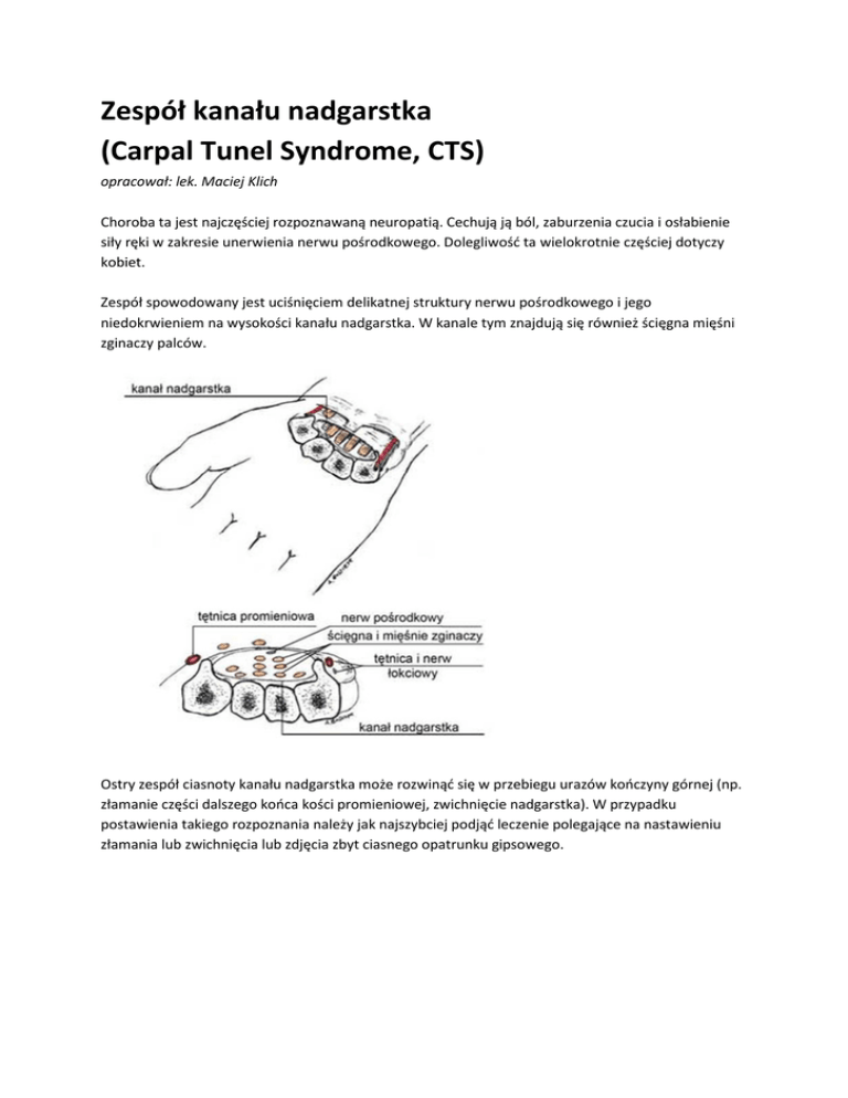 Zespół kanału nadgarstka (Carpal Tunel Syndrome, CTS) opracował: lek. Maciej Klich Choroba ta jest najczęściej rozpoznawaną neuropatią. Cechują ją ból, zaburzenia czucia i osłabienie siły ręki w zakresie unerwienia nerwu pośrodkowego. Dolegliwość ta wielokrotnie częściej dotyczy kobiet. Zespół spowodowany jest uciśnięciem delikatnej struktury nerwu pośrodkowego i jego niedokrwieniem na wysokości kanału nadgarstka. W kanale tym znajdują się również ścięgna mięśni zginaczy palców. Ostry zespół ciasnoty kanału nadgarstka może rozwinąć się w przebiegu urazów kończyny górnej (np. złamanie części dalszego końca kości promieniowej, zwichnięcie nadgarstka). W przypadku postawienia takiego rozpoznania należy jak najszybciej podjąć leczenie polegające na nastawieniu złamania lub zwichnięcia lub zdjęcia zbyt ciasnego opatrunku gipsowego. Znacznie częstsza postać przewlekła rozwija się stopniowo. Może pojawiać się w przypadku zaburzeń hormonalnych i metabolicznych w przebiegu cukrzycy, niedoczynności tarczycy, ciąży, niewydolności nerek, mukopolisacharydozie czy alkoholizmie. Cechują ją ból i parestezje (zaburzenia czucia) oraz osłabienie siły mięśniowej. Objawy często nasilają się w nocy i budzą chorych. W miarę postępu choroby dolegliwości nasilają się i utrudniają wykonywanie codziennych czynności życiowych (prowadzenie samochodu, czesanie się, trzymanie przedmiotów). W zaawansowanych postaciach dochodzi do zaniku mięśniu kłębu kciuka. W przypadku przewlekłej postaci należy wykonać badanie EMG. Przewlekły zespół ciasnoty kanału nadgarstka w zależności od ciężkości można leczyć zachowawczo i operacyjnie. Stosuje się zabiegi rehabilitacyjne i leki przeciwzapalne. W przypadku niepowodzenia wykonuje się zabieg operacyjny polegający na przecięciu troczka zginaczy. Zabieg wykonuje się w znieczuleniu przewodowym. W postępowaniu pooperacyjnym w celu uniknięcia zrostów ścięgien stosuje się rehabilitację i stosunkowo szybki powrót do czynności życia codziennego. Poprawę po leczeniu operacyjnym widuje się u ok. 90% pacjentów.