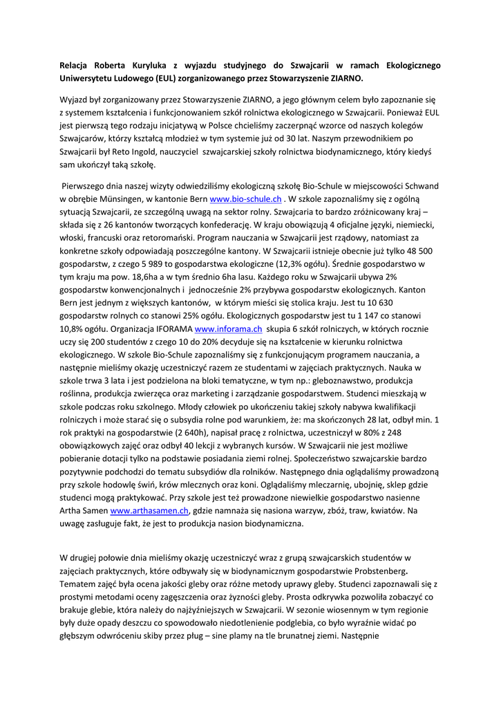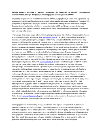 Relacja Roberta Kuryluka z wyjazdu studyjnego do Szwajcarii w ramach Ekologicznego Uniwersytetu Ludowego (EUL) zorganizowanego przez Stowarzyszenie ZIARNO. Wyjazd był zorganizowany przez Stowarzyszenie ZIARNO, a jego głównym celem było zapoznanie się z systemem kształcenia i funkcjonowaniem szkół rolnictwa ekologicznego w Szwajcarii. Ponieważ EUL jest pierwszą tego rodzaju inicjatywą w Polsce chcieliśmy zaczerpnąć wzorce od naszych kolegów Szwajcarów, którzy kształcą młodzież w tym systemie już od 30 lat. Naszym przewodnikiem po Szwajcarii był Reto Ingold, nauczyciel szwajcarskiej szkoły rolnictwa biodynamicznego, który kiedyś sam ukończył taką szkołę. Pierwszego dnia naszej wizyty odwiedziliśmy ekologiczną szkołę Bio-Schule w miejscowości Schwand w obrębie Münsingen, w kantonie Bern www.bio-schule.ch . W szkole zapoznaliśmy się z ogólną sytuacją Szwajcarii, ze szczególną uwagą na sektor rolny. Szwajcaria to bardzo zróżnicowany kraj – składa się z 26 kantonów tworzących konfederację. W kraju obowiązują 4 oficjalne języki, niemiecki, włoski, francuski oraz retoromański. Program nauczania w Szwajcarii jest rządowy, natomiast za konkretne szkoły odpowiadają poszczególne kantony. W Szwajcarii istnieje obecnie już tylko 48 500 gospodarstw, z czego 5 989 to gospodarstwa ekologiczne (12,3% ogółu). Średnie gospodarstwo w tym kraju ma pow. 18,6ha a w tym średnio 6ha lasu. Każdego roku w Szwajcarii ubywa 2% gospodarstw konwencjonalnych i jednocześnie 2% przybywa gospodarstw ekologicznych. Kanton Bern jest jednym z większych kantonów, w którym mieści się stolica kraju. Jest tu 10 630 gospodarstw rolnych co stanowi 25% ogółu. Ekologicznych gospodarstw jest tu 1 147 co stanowi 10,8% ogółu. Organizacja IFORAMA www.inforama.ch skupia 6 szkół rolniczych, w których rocznie uczy się 200 studentów z czego 10 do 20% decyduje się na kształcenie w kierunku rolnictwa ekologicznego. W szkole Bio-Schule zapoznaliśmy się z funkcjonującym programem nauczania, a następnie mieliśmy okazję uczestniczyć razem ze studentami w zajęciach praktycznych. Nauka w szkole trwa 3 lata i jest podzielona na bloki tematyczne, w tym np.: gleboznawstwo, produkcja roślinna, produkcja zwierzęca oraz marketing i zarządzanie gospodarstwem. Studenci mieszkają w szkole podczas roku szkolnego. Młody człowiek po ukończeniu takiej szkoły nabywa kwalifikacji rolniczych i może starać się o subsydia rolne pod warunkiem, że: ma skończonych 28 lat, odbył min. 1 rok praktyki na gospodarstwie (2 640h), napisał pracę z rolnictwa, uczestniczył w 80% z 248 obowiązkowych zajęć oraz odbył 40 lekcji z wybranych kursów. W Szwajcarii nie jest możliwe pobieranie dotacji tylko na podstawie posiadania ziemi rolnej. Społeczeństwo szwajcarskie bardzo pozytywnie podchodzi do tematu subsydiów dla rolników. Następnego dnia oglądaliśmy prowadzoną przy szkole hodowlę świń, krów mlecznych oraz koni. Oglądaliśmy mleczarnię, ubojnię, sklep gdzie studenci mogą praktykować. Przy szkole jest też prowadzone niewielkie gospodarstwo nasienne Artha Samen www.arthasamen.ch, gdzie namnaża się nasiona warzyw, zbóż, traw, kwiatów. Na uwagę zasługuje fakt, że jest to produkcja nasion biodynamiczna. W drugiej połowie dnia mieliśmy okazję uczestniczyć wraz z grupą szwajcarskich studentów w zajęciach praktycznych, które odbywały się w biodynamicznym gospodarstwie Probstenberg. Tematem zajęć była ocena jakości gleby oraz różne metody uprawy gleby. Studenci zapoznawali się z prostymi metodami oceny zagęszczenia oraz żyzności gleby. Prosta odkrywka pozwoliła zobaczyć co brakuje glebie, która należy do najżyźniejszych w Szwajcarii. W sezonie wiosennym w tym regionie były duże opady deszczu co spowodowało niedotlenienie podglebia, co było wyraźnie widać po głębszym odwróceniu skiby przez pług – sine plamy na tle brunatnej ziemi. Następnie zaprezentowano różne maszyny do uprawy gleby począwszy od tradycyjnej orki poprzez uprawę gleby zwykłym agregatem z łapami sprężynowymi, agregat aktywny sprzężony z siewnikiem, aż do bardzo zaawansowanego agregatu uprawowo siewnego – maszyna ta jest na etapie testów polowych, jest to prototyp maszyny, która jest w stanie uprawić glebę z jednoczesnym siewem nasion bez wcześniejszej orki. Taki sposób nauczania poprzez praktykę zrobił duże wrażenie na uczestnikach wyjazdu. Popołudnie spędziliśmy w gospodarstwie Olivera Bürgi. Widzieliśmy tam suchy mur z kamienia, ciągnący się na granicy dwóch kantonów: Solothurn i Bern. Mur ten był zbudowany jedynie z kamieni bez użycia jakiejkolwiek zaprawy. Sztuka budowy takiego muru jest bardzo pracochłonna i wymaga nie lada umiejętności, a dobry fachowiec w ciągu dnia jest w stanie ułożyć 1 metr bieżący takiego muru. Taka budowa zwiększa bioróżnorodność poprzez powstanie nowego ekotonu, który zasiedlany jest przez owady, gady, płazy i ptaki wcześniej w tym miejscu nie występujące w takiej liczbie. Reto Ingold podkreślał znaczenie działalności człowieka na przykładzie łąk – na zboczach wzniesień widać było odznaczający się kawałek łąki polanej gnojowicą – w tym miejscu roślinność była w zupełnie innym składzie, a jej kolor z oddali był biały ze względu na kwitnące tam rośliny. Długofalowa działalność człowieka przyczynia się do widocznych, często nieodwracalnych zmian w krajobrazie. Szwajcarzy przykładają dużo uwagi do ochrony krajobrazu rolniczego. Z dużą pieczołowitością dbają o zadrzewienia, w szczególności na stokach. Dba się również o lasy, w których gospodarka prowadzona jest w sposób zrównoważony. Każdego roku w Szwajcarii zalesia się niemal 1000ha nieużytków. Gospodarstwo jest położone w bardzo ciekawym miejscu z przepięknym widokiem na góry. Gospodarz wybudował dom z myślą o turystyce, ale też stanowi on bazę 