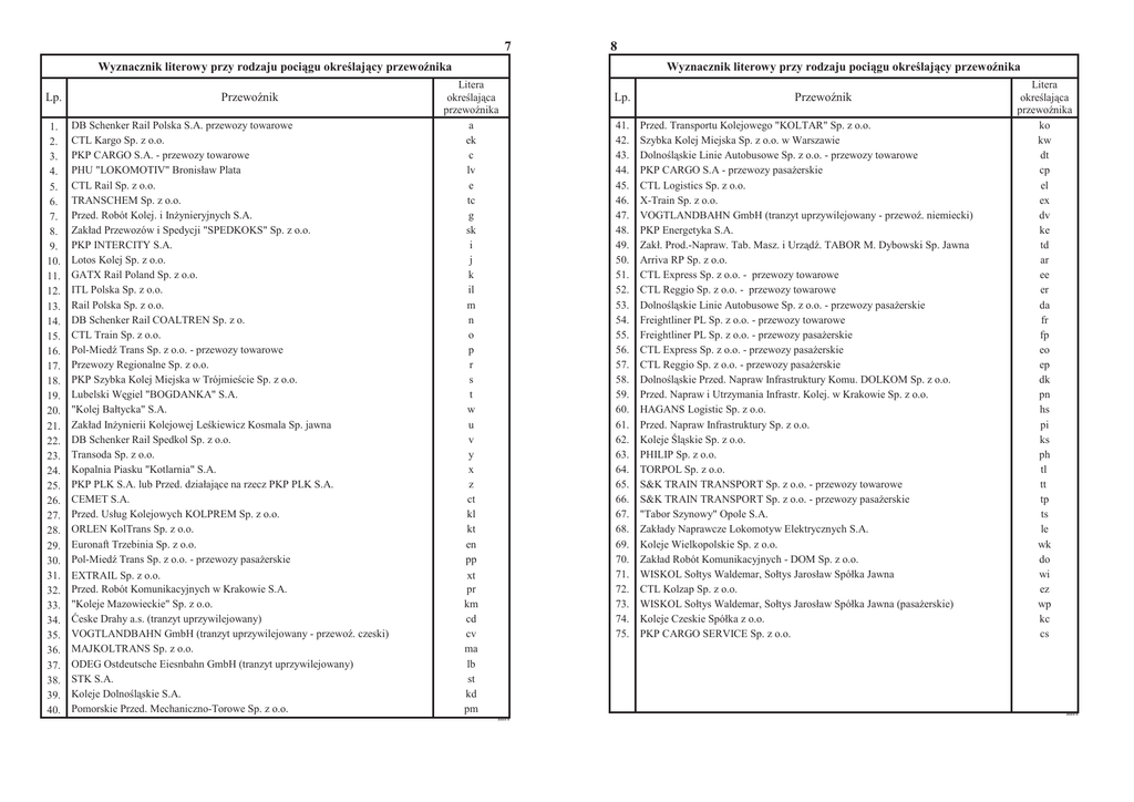 7 8 Wyznacznik literowy przy rodzaju poci gu okre laj cy przewo nika Lp. 1. 2. 3. 4. 5. 6. 7. 8. 9. 10. 11. 12. 13. 14. 15. 16. 17. 18. 19. 20. 21. 22. 23. 24. 25. 26. 27. 28. 29. 30. 31. 32. 33. 34. 35. 36. 37. 38. 39. 40. Przewo nik DB Schenker Rail Polska S.A. przewozy towarowe CTL Kargo Sp. z o.o. PKP CARGO S.A. - przewozy towarowe PHU "LOKOMOTIV" Bronisław Plata CTL Rail Sp. z o.o. TRANSCHEM Sp. z o.o. Przed. Robót Kolej. i In ynieryjnych S.A. Zakład Przewozów i Spedycji "SPEDKOKS" Sp. z o.o. PKP INTERCITY S.A. Lotos Kolej Sp. z o.o. GATX Rail Poland Sp. z o.o. ITL Polska Sp. z o.o. Rail Polska Sp. z o.o. DB Schenker Rail COALTREN Sp. z o. CTL Train Sp. z o.o. Pol-Mied Trans Sp. z o.o. - przewozy towarowe Przewozy Regionalne Sp. z o.o. PKP Szybka Kolej Miejska w Trójmie cie Sp. z o.o. Lubelski W giel "BOGDANKA" S.A. "Kolej Bałtycka" S.A. Zakład In ynierii Kolejowej Le kiewicz Kosmala Sp. jawna DB Schenker Rail Spedkol Sp. z o.o. Transoda Sp. z o.o. Kopalnia Piasku "Kotlarnia" S.A. PKP PLK S.A. lub Przed. działaj ce na rzecz PKP PLK S.A. CEMET S.A. Przed. Usług Kolejowych KOLPREM Sp. z o.o. ORLEN KolTrans Sp. z o.o. Euronaft Trzebinia Sp. z o.o. Pol-Mied Trans Sp. z o.o. - przewozy pasa erskie EXTRAIL Sp. z o.o. Przed. Robót Komunikacyjnych w Krakowie S.A. "Koleje Mazowieckie" Sp. z o.o. eske Drahy a.s. (tranzyt uprzywilejowany) VOGTLANDBAHN GmbH (tranzyt uprzywilejowany - przewo . czeski) MAJKOLTRANS Sp. z o.o. ODEG Ostdeutsche Eiesnbahn GmbH (tranzyt uprzywilejowany) STK S.A. Koleje Dolno l skie S.A. Pomorskie Przed. Mechaniczno-Torowe Sp. z o.o. Wyznacznik literowy przy rodzaju poci gu okre laj cy przewo nika Litera okre laj ca przewo nika a ek c lv e tc g sk i j k il m n o p r s t w u v y x z ct kl kt en pp xt pr km cd cv ma lb st kd pm Lp. 41. 42. 43. 44. 45. 46. 47. 48. 49. 50. 51. 52. 53. 54. 55. 56. 57. 58. 59. 60. 61. 62. 63. 64. 65. 66. 67. 68. 69. 70. 71. 72. 73. 74. 75. Przewo nik Przed. Transportu Kolejowego "KOLTAR" Sp. z o.o. Szybka Kolej Miejska Sp. z o.o. w Warszawie Dolno l skie Linie Autobusowe Sp. z o.o. - przewozy towarowe PKP CARGO S.A - przewozy pasa erskie CTL Logistics Sp. z o.o. X-Train Sp. z o.o. VOGTLANDBAHN GmbH (tranzyt uprzywilejowany - przewo . niemiecki) PKP Energetyka S.A. Zakł. Prod.-Napraw. Tab. Masz. i Urz d . TABOR M. Dybowski Sp. Jawna Arriva RP Sp. z o.o. CTL Express Sp. z o.o. - przewozy towarowe CTL Reggio Sp. z o.o. - przewozy towarowe Dolno l skie Linie Autobusowe Sp. z o.o. - przewozy pasa erskie Freightliner PL Sp. z o.o. - przewozy towarowe Freightliner PL Sp. z o.o. - przewozy pasa erskie CTL Express Sp. z o.o. - przewozy pasa erskie CTL Reggio Sp. z o.o. - przewozy pasa erskie Dolno l skie Przed. Napraw Infrastruktury Komu. DOLKOM Sp. z o.o. Przed. Napraw i Utrzymania Infrastr. Kolej. w Krakowie Sp. z o.o. HAGANS Logistic Sp. z o.o. Przed. Napraw Infrastruktury Sp. z o.o. Koleje l skie Sp. z o.o. PHILIP Sp. z o.o. TORPOL Sp. z o.o. S&K TRAIN TRANSPORT Sp. z o.o. - przewozy towarowe S&K TRAIN TRANSPORT Sp. z o.o. - przewozy pasa erskie "Tabor Szynowy" Opole S.A. Zakłady Naprawcze Lokomotyw Elektrycznych S.A. Koleje Wielkopolskie Sp. z o.o. Zakład Robót Komunikacyjnych - DOM Sp. z o.o. WISKOL Sołtys Waldemar, Sołtys Jarosław Spółka Jawna CTL Kolzap Sp. z o.o. WISKOL Sołtys Waldemar, Sołtys Jarosław Spółka Jawna (pasa erskie) Koleje Czeskie Spółka z o.o. PKP CARGO SERVICE Sp. z o.o. Litera okre laj ca przewo nika ko kw dt cp el ex dv ke td ar ee er da fr fp eo ep dk pn hs pi ks ph tl tt tp ts le wk do wi ez wp kc cs IDDER7R IDDER7R