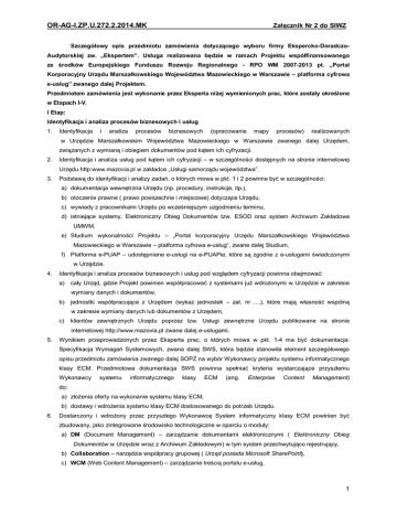 OR-AG-I.ZP.U.272.2.2014.MK Załącznik Nr 2 do SIWZ Szczegółowy opis przedmiotu zamówienia dotyczącego wyboru firmy Ekspercko-DoradczoAudytorskiej zw. „Ekspertem”. Usługa realizowana będzie w ramach Projektu współfinansowanego ze środków Europejskiego Funduszu Rozwoju Regionalnego - RPO WM 2007-2013 pt. „Portal Korporacyjny Urzędu Marszałkowskiego Województwa Mazowieckiego w Warszawie – platforma cyfrowa e-usług” zwanego dalej Projektem. Przedmiotem zamówienia jest wykonanie przez Eksperta niżej wymienionych prac, które zostały określone w Etapach I-V. I Etap: Identyfikacja i analiza procesów biznesowych i usług 1. Identyfikacja i analiza procesów biznesowych (opracowanie mapy procesów) realizowanych w Urzędzie Marszałkowskim Województwa Mazowieckiego w Warszawie zwanego dalej Urzędem, związanych z wymianą i obiegiem dokumentów pod kątem ich cyfryzacji. 2. Identyfikacja i analiza usług pod kątem ich cyfryzacji – w szczególności dostępnych na stronie internetowej Urzędu http:www.mazovia.pl w zakładce „Usługi samorządu województwa”. 3. Podstawą do identyfikacji i analizy zadań, o których mowa w pkt. 1 i 2 powinna być w szczególności: a) dokumentacja wewnętrzna Urzędu (np. procedury, instrukcje, itp.), b) otoczenie prawne ( prawo powszechne i miejscowe) dotyczące Urzędu, c) wywiady z pracownikami Urzędu po wcześniejszym uzgodnieniu terminu, d) istniejące systemy, Elektroniczny Obieg Dokumentów tzw. ESOD oraz system Archiwum Zakładowe UMWM, e) Studium wykonalności Projektu – „Portal korporacyjny Urzędu Marszałkowskiego Województwa Mazowieckiego w Warszawie – platforma cyfrowa e-usług”, zwane dalej Studium, f) Platforma e-PUAP – udostępniane e-usługi na e-PUAPie, które są zgodne z e-usługami świadczonymi w Urzędzie. 4. Identyfikacja i analiza procesów biznesowych i usług pod względem cyfryzacji powinna obejmować: a) cały Urząd, gdzie Projekt powinien współpracować z systemami już wdrożonymi w Urzędzie w zakresie wymiany danych i dokumentów, b) jednostki współpracujące z Urzędem (wykaz jednostek – zał. nr ....), które mają własność wspólną w zakresie wymiany danych lub dokumentów z Urzędem, c) klientów zewnętrznych Urzędu poprzez tzw. Usługi zewnętrzne Urzędu publikowane na stronie internetowej http://www.mazovia.pl zwane dalej e-usługami. 5. Wynikiem przeprowadzonych przez Eksperta prac, o których mowa w pkt. 1-4 ma być dokumentacja: Specyfikacja Wymagań Systemowych, zwana dalej SWS, która będzie stanowiła element szczegółowego opisu przedmiotu zamówienia zwanego dalej SOPZ na wybór Wykonawcy projektu systemu informatycznego klasy ECM. Przedmiotowa dokumentacja SWS powinna spełniać kryteria wystarczające przyszłemu Wykonawcy systemu informatycznego klasy ECM (ang. Enterprise Content Management) do: a) złożenia oferty na wykonanie systemu klasy ECM, b) dostawy i wdrożenia systemu klasy ECM dostosowanego do potrzeb Urzędu. 6. Dostarczony i wdrożony przez przyszłego Wykonawcę System informatyczny klasy ECM powinien być zbudowany, jako zintegrowane środowisko technologiczne w oparciu o moduły: a) DM (Document Management) – zarządzanie dokumentami elektronicznymi ( Elektroniczny Obieg Dokumentów w Urzędzie wraz z Archiwum Zakładowym) w tym system przechwytująco rejestrujący, b) Collaboration – narzędzia współpracy grupowej ( Urząd posiada Microsoft SharePoint), c) WCM (Web Content Management) – zarządzanie treścią portalu e-usług, 1 OR-AG-I.ZP.U.272.2.2014.MK Załącznik Nr 2 do SIWZ d) Workflow/BPM – przepływ pracy/zarządzanie procesami biznesowymi, e) Centralne repozytorium - „hurtownia” danych, wszystkie moduły ECM dostarczają dane do jednego repozytorium, co w konsekwencji zapewnia każdej z nich dostęp do dowolnych informacji. 7. Dokumentacja SWS, o której mowa pkt. 5 powinna zostać opracowana w terminie do 60 dni kalendarzowych oraz składać się z dwóch części: a) Część pierwsza powinna zawierać w szczególności: § Koncepcję projektu Systemu (w formie diagramu ): podział na moduły, współpraca modułów, przepływ dokumentów i danych pomiędzy modułami, § Określenie źródeł, rodzaju pozyskiwanych i wprowadzanych dokumentów oraz danych z określeniem częstotliwości ich wymiany i struktury, szczegółowy opis przepływu dokumentów i danych, ( Model –Diagram Obiegu Dokumentów w Urzędzie w tym Archiwum), § Kategoryzację wszystkich przychodzących dokumentów – w celu ich ujednolicenia w przyszłym systemie klasy ECM oraz możliwości zastosowania technik OCR/ICR/OMR celem automatyzacji wprowadzania dokumentów, § Ewentualne załączniki w postaci aktualnie przesyłanych dokumentów papierowych, § Zdefiniowanie diagramu: przyjmowania, udostępniania i archiwizacji papierowych dokumentów, § Zamodelowane procesy biznesowe niezbędne do obsługi obiegu dokumentów -modelowanie wykonane za pomocą narzędzia CASE (standard BPMN) specjalizowanego do definiowania procesów biznesowych, § Opis zidentyfikowanych e-usług ( walidacja pod względem kompletności) w celu implementacji na e-PUAP ( implementacja zostanie dokonana przez Wykonawcę Systemu klasy ECM), § Zamodelowane procesy biznesowe niezbędne do obsługi e-usług - modelowanie wykonać za pomocą narzędzia CASE (standard BPMN) specjalizowanego do definiowania procesów biznesowych, § Wymagania funkcjonalne dla całego system klasy ECM: wymagania powinny być przedstawione z podziałem na moduły w których występują zgodnie z MoReq2 SPECIFICATION ( Update and Extension ,2008 ) - Wzorcowe wymagania dotyczące Zarządzania Dokumentami Elektronicznymi, § Propozycje reprezentatywnych procesów pracy w Urzędzie typu Workflow (przepływ pracy) wraz z zamodelowaniem za pomocą narzędzia CASE (standard BPMN) specjalizowanego do definiowania procesów biznesowych min. 20, § Wymagania programistyczne (głównie tworzenie r