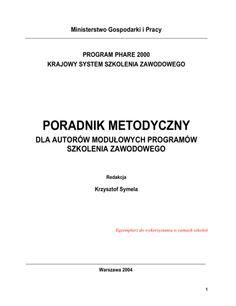 Ministerstwo Gospodarki i Pracy ________________________________________________________________________ PROGRAM PHARE 2000 KRAJOWY SYSTEM SZKOLENIA ZAWODOWEGO PORADNIK METODYCZNY DLA AUTORÓW MODUŁOWYCH PROGRAMÓW SZKOLENIA ZAWODOWEGO Redakcja Krzysztof Symela Egzemplarz do wykorzystania w ramach szkoleń _______________________________________________________________________ Warszawa 2004 1 Ministerstwo Gospodarki i Pracy Publikacja zawiera materiały opracowane w ramach realizacji II Części Projektu PHARE 2000 Nr PL0003.11 „Krajowy System Szkolenia Zawodowego”, Działanie Nr 3: „Opracowanie i upowszechnianie modułowych programów szkolenia zawodowego, opartych na MOP-owskiej koncepcji Modułów umiejętności zawodowych (ang. MES)”. Projekt, we współpracy z Ministerstwem Gospodarki, Pracy i Polityki Społecznej – beneficjentem projektu, realizowało konsorcjum w składzie: German Education and Training (GET – Niemcy), DEMOS (Francja), Doradca Consultants Ltd. (Polska). Podwykonawcami byli: Instytut Technologii Eksploatacji w Radomiu, Pracownia Badań Społecznych w Sopocie. PORADNIK METODYCZNY DLA AUTORÓW MODUŁOWYCH PROGRAMÓW SZKOLENIA ZAWODOWEGO Redakcja: Krzysztof Symela Publikacja stanowi kompendium wiedzy i praktycznych działań w zakresie projektowania modułowych programów szkolenia zawodowego konstruowanych w oparciu o zaadaptowaną do warunków polskich tzw. metodologię modułów umiejętności zawodowych (ang. MES – Modules of Employable Skills). Opracowanie przybrało formę poradnika metodycznego, w którym scharakteryzowano model i strukturę dokumentacji programowej szkoleń modułowych, jak również opisano procedury związane z przygotowaniem programu. Całość została zilustrowana przykładami zaczerpniętymi z programów szkoleń modułowych opracowanych w projekcie Phare 2000 i rekomendowanych przez MGiP do praktycznego wykorzystania w oferowaniu kursów dla rynku pracy. Poradnik przeznaczony jest dla szerokiego kręgu osób i instytucji zainteresowanych projektowaniem i stosowaniem modułowych programów szkolenia zawodowego, zwłaszcza w edukacji ustawicznej dorosłych, jak również w kształceniu zawodowym realizowanym w systemie szkolnym (w formie specjalizacji zawodowych oraz programów modułowych w szkołach policealnych). Publikacja może być również wykorzystywana przez studentów uczelni pedagogicznych, szczególnie w ramach specjalności pedagogika pracy oraz w ramach studiów podyplomowych dla nauczycieli, w zakresie podstaw konstruowania modułowych programów kształcenia i szkolenia zawodowego. Recenzenci: mgr Elżbieta Strojna – MGiP Dep. Polityki Rynku Pracy, Wydział Edukacji Ustawicznej prof. dr hab. Stefan M. Kwiatkowski, Instytut Badań Edukacyjnych w Warszawie Nakład: …………. egzemplarzy © Copyright by Ministerstwo Gospodarki i Pracy, 2004 Wszelkie prawa zastrzeżone Praca nie może być powielana i rozpowszechniana w jakiejkolwiek formie i w jakikolwiek sposób bez pisemnej zgody Ministerstwa Pracy i Polityki Socjalnej. W przypadku wykonywania kopii, adaptacji lub zamawiania egzemplarzy, należy złożyć wniosek do Departamentu Rynku Pracy MGPiPS, ul. Tamka 1, 00-349 Warszawa. Wydanie I ISBN 83–7204–397–3 Wydawnictwo Instytutu Technologii Eksploatacji ul. K. Pułaskiego 6/10, 26-600 Radom, tel. (048) 364-42-41, fax (048) 364-47-65 e-mail: [email protected] http://www.itee.radom.pl 1338 2 SPIS TREŚCI WPROWADZENIE ............................................................................................................................ 4 1. ROZWÓJ PROGRAMÓW SZKOLEŃ MODUŁOWYCH W POLSCE ........................................ 6 1.1. Istota i rozwój modułowych szkoleń zawodowych ………………......................................... 6 1.2. Koncepcja szkolenia modułowego Międzynarodowej Organizacji Pracy – zarys metodologii Modułów Umiejętności Zawodowych (ang. MES) .....………………….….…… 9 1.3. Polskie doświadczenia w opracowaniu programów szkoleń z wykorzystaniem koncepcji modułów umiejętności zawodowych ….………….…………………………........................... 13 1.4. Usytuowanie modułowych programów w Krajowym Systemie Szkolenia Zawodowego .... 20 2. MODEL DOKUMENTACJI PROGRAMOWEJ SZKOLEŃ MODUŁOWYCH PRZYJĘTY W PROJEKCIE PHARE 2000 – KRAJOWY SYSTEM SZKOLENIA ZAWODOWEGO .…....... 23 2.1. Ustalenia terminologiczne i podstawowe pojęcia ................................................................ 23 2.2. Model dokumentacji modułowego programu szkolenia zawodowego …............................. 35 2.3. Charakterystyka modułowego programu szkolenia zawodowego ...................................... 41 3. PODSTAWY METODYCZNE OPRACOWANIA MODUŁOWEGO PROGRAMU SZKOLENIA ZAWODOWEGO ……………………………….….…………………………………………………... 52 3.1. Ocena potrzeb szkoleniowych w projektowaniu programów nauczania …………………… 52 3.2. Procedura opracowania modułowego programu szkolenia zawodowego …………………. 55 3.3. Wskazówki metodyczne w zakresie formułowania zadań zawodowych, operacyjnych celów kształcenia oraz tworzenia oferty szkoleń modułowych ……………………………… 59 3.4. Ocena jakości modułowego programu szkolenia zawodowego ……………………...….….. 71 3.5. Instrukcja kodowania dokumentów oraz przygotowanie zapisu elektronicznego modułowego programu szkoleniowego …...…………….……………………...……………… 79 3.6. Zasady korzystania z informatycznej bazy danych o modułowych szkoleniach zawodowych ………………………………………………………………………………………. 82 4. ANEKSY …………………………………………...………………………..………………………….. 92 4.1. Wzory formularzy stosowane w projektowaniu modułowych programów szkoleni