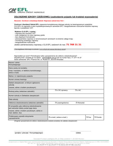 ZGŁOSZENIE SZKODY CZĘ CIOWEJ (uszkodzenie pojazdu lub kradzież wyposażenia) Nowo ćŚ Centrum Likwidacji Szkód- Naprawa szkód bez Vat ! Centrum Likwidacji Szkód EFL zapewnia kompleksową obsługę szkody na leasingowanym pojeździe. CLS EFL to naprawa w sieci wyselekcjonowanych serwisów EFL i bezgotówkowe rozliczenie kosztów naprawy łącznie z podatkiem VAT. Wybierz CLS EFL i zyskaj : - naprawa bez kosztów VAT - auto zastępcze na czas naprawy gratis - bez zbędnych formalności - pierwszeństwo naprawy w renomowanych serwisach na terenie całego kraju - monitoring przebiegu naprawy - bezgotówkowe rozliczenie Jesteś zainteresowany naprawą z CLS EFL zadzwoń do nas: 71 769 31 31 ( Szczegółowe informacje na stronie :www.efl.pl/cok/centrum-likwidacji-szkod) Naprawiłeś już auto? Potrzebujesz tylko upoważnienia do odbioru odszkodowania? Wypełnij druk i prześlij go na adres: [email protected] lub na numer faxu: 71 377 14 37 Dane adresowe :EFL Finance SA, ul. Ruska 51, 50-079 Wrocław Nazwa i adres Korzystającego Dane osoby do kontaktu (imię i nazwisko, nr telefonu komórkowego, adres e-mail) Marka i nr rejestracyjny pojazdu Numer umowy leasingu Zakład ubezpieczeń, w którym zgłoszono szkodę (nazwa, adres z kodem pocztowym) Rodzaj polisy (właściwe zakreślić) z OC sprawcy z AC Numer szkody w Zakładzie ubezpieczeń Data szkody Odbiorca odszkodowania (właściwe zakreślić) Leasingobiorca Warsztat W przypadku gdy odbiorcą odszkodowania jest warsztat należy podać jego dane (nazwa, adres z kodem pocztowym, adres email, telefon, fax) Preferowany sposób otrzymania upoważnienia e-mail ( adres e-mail ): Fax (Oryginał upoważnienia do odbioru odszkodowania zostanie przesłany do zakładu ubezpieczeń) ………………………………………. (podpis i pieczęć Korzystającego) …………………………… (data) Poczta