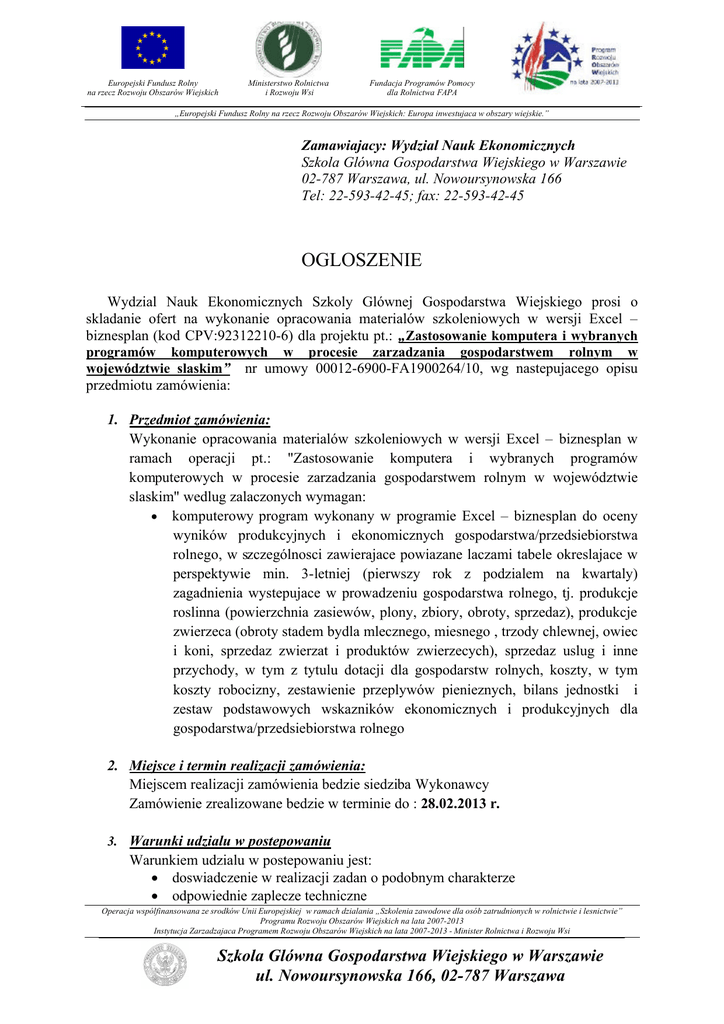 Europejski Fundusz Rolny na rzecz Rozwoju Obszarów Wiejskich Ministerstwo Rolnictwa i Rozwoju Wsi Fundacja Programów Pomocy dla Rolnictwa FAPA „Europejski Fundusz Rolny na rzecz Rozwoju Obszarów Wiejskich: Europa inwestujaca w obszary wiejskie.” Zamawiajacy: Wydzial Nauk Ekonomicznych Szkola Glówna Gospodarstwa Wiejskiego w Warszawie 02-787 Warszawa, ul. Nowoursynowska 166 Tel: 22-593-42-45; fax: 22-593-42-45 OGLOSZENIE Wydzial Nauk Ekonomicznych Szkoly Glównej Gospodarstwa Wiejskiego prosi o skladanie ofert na wykonanie opracowania materialów szkoleniowych w wersji Excel – biznesplan (kod CPV:92312210-6) dla projektu pt.: „Zastosowanie komputera i wybranych programów komputerowych w procesie zarzadzania gospodarstwem rolnym w województwie slaskim” nr umowy 00012-6900-FA1900264/10, wg nastepujacego opisu przedmiotu zamówienia: 1. Przedmiot zamówienia: Wykonanie opracowania materialów szkoleniowych w wersji Excel – biznesplan w ramach operacji pt.: "Zastosowanie komputera i wybranych programów komputerowych w procesie zarzadzania gospodarstwem rolnym w województwie slaskim" wedlug zalaczonych wymagan: • komputerowy program wykonany w programie Excel – biznesplan do oceny wyników produkcyjnych i ekonomicznych gospodarstwa/przedsiebiorstwa rolnego, w szczególnosci zawierajace powiazane laczami tabele okreslajace w perspektywie min. 3-letniej (pierwszy rok z podzialem na kwartaly) zagadnienia wystepujace w prowadzeniu gospodarstwa rolnego, tj. produkcje roslinna (powierzchnia zasiewów, plony, zbiory, obroty, sprzedaz), produkcje zwierzeca (obroty stadem bydla mlecznego, miesnego , trzody chlewnej, owiec i koni, sprzedaz zwierzat i produktów zwierzecych), sprzedaz uslug i inne przychody, w tym z tytulu dotacji dla gospodarstw rolnych, koszty, w tym koszty robocizny, zestawienie przeplywów pienieznych, bilans jednostki i zestaw podstawowych wskazników ekonomicznych i produkcyjnych dla gospodarstwa/przedsiebiorstwa rolnego 2. Miejsce i termin realizacji zamówienia: Miejscem realizacji zamówienia bedzie siedziba Wykonawcy Zamówienie zrealizowane bedzie w terminie do : 28.02.2013 r. 3. Warunki udzialu w postepowaniu Warunkiem udzialu w postepowaniu jest: • doswiadczenie w realizacji zadan o podobnym charakterze • odpowiednie zaplecze techniczne Operacja wspólfinansowana ze srodków Unii Europejskiej w ramach dzialania „Szkolenia zawodowe dla osób zatrudnionych w rolnictwie i lesnictwie” Programu Rozwoju Obszarów Wiejskich na lata 2007-2013 Instytucja Zarzadzajaca Programem Rozwoju Obszarów Wiejskich na lata 2007-2013 - Minister Rolnictwa i Rozwoju Wsi Szkola Glówna Gospodarstwa Wiejskiego w Warszawie ul. Nowoursynowska 166, 02-787 Warszawa Europejski Fundusz Rolny na rzecz Rozwoju Obszarów Wiejskich Ministerstwo Rolnictwa i Rozwoju Wsi Fundacja Programów Pomocy dla Rolnictwa FAPA „Europejski Fundusz Rolny na rzecz Rozwoju Obszarów Wiejskich: Europa inwestujaca w obszary wiejskie.” 4. Dokumenty wymagane od Oferenta Formularz oferty – wedlug wzoru stanowiacego zalacznik nr 1 do niniejszego ogloszenia 5. Kryteria wyboru oferty najkorzystniejszej Zamawiajacy dokona wyboru oferty najkorzystniejszej w oparciu o nastepujace kryteria: cena 100%. Zamawiajacy udzieli zamówienia temu wykonawcy, który zaproponuje najnizsza cene za wykonanie calosci zamówienia. 6. Zalaczniki: Wzór formularza ofertowego – zalacznik nr 1 do ogloszenia; Zamówienia udzielone zostanie na podstawie art. 4 pkt 8 ustawy Prawo zamówien publicznych (teks jednolity Dz. U. z 2010r. Nr 113, poz. 759). Oferty nalezy skladac w zaklejonej i opisanej kopercie, faxem lub mailem (wg zalacznika 1) do dnia 22.02.2013 r. do godziny 1000 w siedzibie Zamawiajacego: Wydzial Nauk Ekonomicznych, blok VII, pokój 19A Oferty zostana otwarte w dniu 22.02.2013 r. o godzinie 1215 w bloku VII pokój 19A OFERTA NA WYKONANIE OPRACOWANIA MATERIALÓW SZKOLENIOWYCH W WERSJI EXCEL – BIZNESPLAN (KOD CPV:92312210-6) PT.: „ZASTOSOWANIE KOMPUTERA I WYBRANYCH PROGRAMÓW KOMPUTEROWYCH W PROCESIE ZARZADZANIA GOSPODARSTWA ROLNYM W WOJEWÓDZTWIE SLASKIM” IMIE I NAZWISKO OSOBY SKLADAJACEJ OFERTE …………………………………………… (Podpis Zamawiajacego) Operacja wspólfinansowana ze srodków Unii Europejskiej w ramach dzialania „Szkolenia zawodowe dla osób zatrudnionych w rolnictwie i lesnictwie” Programu Rozwoju Obszarów Wiejskich na lata 2007-2013 Instytucja Zarzadzajaca Programem Rozwoju Obszarów Wiejskich na lata 2007-2013 - Minister Rolnictwa i Rozwoju Wsi Szkola Glówna Gospodarstwa Wiejskiego w Warszawie ul. Nowoursynowska 166, 02-787 Warszawa