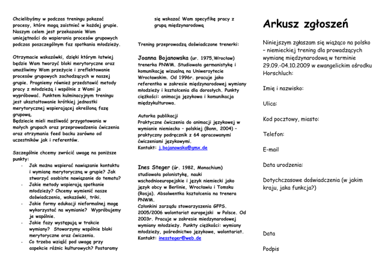 Chcielibyśmy w podczas treningu pokazać procesy, które mogą zaistnieć w kaŜdej grupie. Naszym celem jest przekazanie Wam umiejętności do wspierania procesów grupowych podczas poszczególnym faz spotkania młodzieŜy. Otrzymacie wskazówki, dzięki którym łatwiej będzie Wam tworzyć bloki merytoryczne oraz umoŜliwimy Wam przeŜycie i zreflektowanie procesów grupowych zachodzących w naszej grupie. Pragniemy równieŜ przedstawić metody pracy z młodzieŜą i wspólnie z Wami je wypróbować. Punktem kulminacyjnym treningu jest ukształtowanie krótkiej jednostki merytorycznej wspierającej określoną fazę grupową. Będziecie mieli moŜliwość przygotowania w małych grupach oraz przeprowadzenia ćwiczenia oraz otrzymania feed backu zarówno od uczestników jak i referentów. Szczególnie chcemy zwrócić uwagę na poniŜsze punkty: - Jak moŜna wspierać nawiązanie kontaktu i wymianę merytoryczną w grupie? Jak stworzyć osobiste nawiązanie do tematu? - Jakie metody wspierają spotkanie młodzieŜy? Chcemy wymienić nasze doświadczenia, wskazówki, triki. - Jakie formy edukacji nieformalnej mogę wykorzystać na wymianie? Wypróbujemy je wspólnie. - Jakie fazy występują w trakcie wymiany? Stoworzymy wspólnie bloki merytoryczne oraz ćwiczenia. - Co trzeba wziąść pod uwagę przy aspekcie róŜnic kulturowych? Postaramy się wskazać Wam specyfikę pracy z grupą międzynarodową Trening przeprowadzą doświadczone trenerki: Joanna Bojanowska (ur. 1975,Wrocław) trenerka PNWM. Studiowała germanistykę i komunikację wizualną na Uniwersytecie Wrocławskim. Od 1996r. pracuje jako referentka w zakresie międzynarodowej wymiany młodzieŜy i kształcenia dla dorosłych. Punkty cięŜkości: animacja językowa i komunikacja międzykulturowa. Autorka publikacji Praktyczne ćwiczenia do animacji językowej w wymianie niemiecko – polskiej (Bonn, 2004) – praktyczny podręcznik z 64 opracowanymi ćwiczeniami językowymi. Kontakt: [email protected] Ines Steger (úr. 1982, Monachium) studiowała polonistykę, nauki wschodnioeuropejskie i język niemiecki jako język obcy w Berlinie, Wrocławiu i Tomsku (Rosja). Absolwentka kształcenia na trenera PNWM. Członkini zarządu stowarzyszenia GFPS. 2005/2006 wolontariat europejski w Polsce. Od 2003r. Pracuje w zakresie miedzynarodowej wymiany młodzieŜy. Punkty cięŜkości: wymiany młodzieŜy, pośrednictwo językowe, wolontariat. Kontakt: [email protected] Arkusz zgłoszeń Niniejszym zgłaszam się wiąŜąco na polsko – niemieckiej trening dla prowadzących wymianę międzynarodową w terminie 29.09.-04.10.2009 w ewangelickim ośrodku Horschluch: Imię i nazwisko: Ulica: Kod pocztowy, miasto: Telefon: E-mail Data urodzenia: Dotychczasowe doświadczenia (w jakim kraju, jaka funkcja?) Data Podpis Zgłoszenie proszę przesłać najpóźniej do 11.09.2009 na podany adres: Jugendhilfe und Sozialarbeit e.V. (JuSeV) Geschwister-Scholl-Str. 16 15517 Fürstenwalde Fax: 03361/74777-99 Email: [email protected] Informacje, zapytania, kontakt: Klaus Waiditschka Tel.: 03361/74777-19 Przydatne informacje: Organizator: Jugendhilfe und Sozialarbeit e.V., Furstenwalde, Niemcy Fundacja Szczęśliwe Dzieciństwo, Lublin, Polska Termin: 29.09.-04.10.2009 Proszę przesyłać zgłoszenia tylko w przypadku moŜliwości uczestnictwa w całym szkoleniu! Miejsce: Ewangelicki ośrodek edukacji młodzieŜy i spotkań Hirschluch połoŜony jest w małym miasteczku Storkow, ok. 50 km na południowy wschód od Berlina, niedaleko polskiej granicy (bliŜsze informacje www.hirschluch.de) Koszty & warunki: Opłata wynosi 50 euro. W skład opłaty wchodzi nocleg, wyŜywienie i program, uczestnicy mieszkający w Polsce mogą dodatkowo otrzymać zwrot częściowych kosztów podróŜy od Fundacji Szczęśliwe Dzieciństwo. Trening jest dofinansowany prze PolskoNiemieckiej Współpracy MłodzieŜy. Procesy grupowe w spotkaniach międzynarodowym Polsko-niemiecki trening dla prowadzących wymianę miedzynarodową od 29.09 do 04.10.2009 w ewangelickim ośrodku edukacji młodzieŜy i spotkań Hirschluch (koło Berlina)