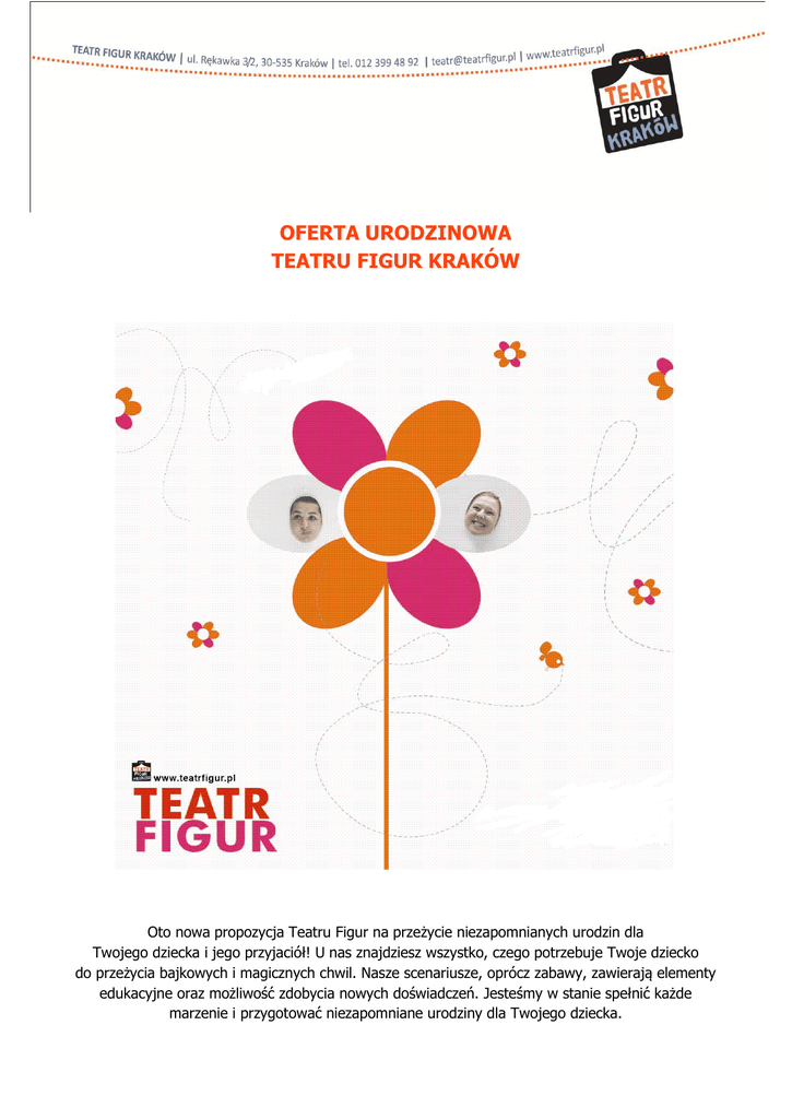 OFERTA URODZINOWA TEATRU FIGUR KRAKÓW Oto nowa propozycja Teatru Figur na przeżycie niezapomnianych urodzin dla Twojego dziecka i jego przyjaciół! U nas znajdziesz wszystko, czego potrzebuje Twoje dziecko do przeżycia bajkowych i magicznych chwil. Nasze scenariusze, oprócz zabawy, zawierają elementy edukacyjne oraz możliwość zdobycia nowych doświadczeń. Jesteśmy w stanie spełnić każde marzenie i przygotować niezapomniane urodziny dla Twojego dziecka. SCENARIUSZE URODZIN URODZINY TEATRALNE (od 4 lat) – w zależności od wieku jubilatów i ich gości, uczestnicy będą odkrywać tajemnice teatru razem z Muminkami, zamienią się w broadwayowskich artystów wystawiając musical Koty, albo w jawajskich aktorów cieniowych. Bez względu na to, którą ścieżkę wybiorą, będzie to niezapomniana przygoda, zakończona niezwykłym pokazem dla rodziców. Mniejsze dzieci pochwalą się oryginalną scenografią, troszkę starsze zabłysną w świetle ramp i błysku fleszy, przy okazji prezentując efekt swoich zdolności plastycznych. Teatr cieni polecamy wszystkim, którzy cenią wyobraźnię i wspólną zabawę. URODZINY AFRYKAŃSKIE (od 5 lat) – to 3 godziny przygody: tańce wokół baobabu, nauka gry na dziwnych instrumentach, niezwykłe opowieści, wyprawa do dżungli, magiczna zamiana w dzikie zwierzęta! Po takich urodzinach każdy pięciolatek będzie odważny jak lew! URODZINY PIRATÓW (od 7 lat) – jak zbudować statek, który nie da się szalejącym sztormom? Jak przygotować załogę do strasznych przygód? Gdzie najlepiej zakopać skarb? Tego wszystkiego dowiecie się na przygodowych urodzinach piratów! URODZINY CYRKOWE (od 6 do 12 lat) – główną atrakcją tej propozycji jest nauka żonglowania różnymi przedmiotami: chustkami, piłkami, maczugami, poi, kręcenie talerzami i diabolo, podrzucanie flowersticków oraz chodzenie na szczudłach. Takie urodziny, to doskonały pomysł na zaangażowanie dorosłych – im też należy się zabawa! URODZINY Z PIPPI LANGSTRUM (od 4 do 8 lat) – Pippi miała pomysły i odwagę ich realizowania. Urodziny z Pippi, to szaleństwo eksperymentów, sztuczek magicznych, niespodzianek. W zależności od wieku uczestników, dzieci same przygotują magiczne show lub wybiorą się w tajemniczą podróż śladami Pippi. URODZINY ŚLADY I TROPY (od 9 do 12 lat) – jeśli w Twoim dziecku zauważasz dociekliwość detektywa, upodobanie do rozwiązywania zagadek, łamigłówek oraz chęć tropienia własnego cienia a przy tym nie straszne są dla niego labirynty i lochy. To te urodziny będą strzałem w dziesiątkę. Cennik: Do 15 osób: 1,5h - 300zł., 2h- 400zł., 3h- 600zł Powyżej 15 osób: + 10 zł od każdej, dodatkowej osoby. Do kosztów przyjęcia urodzinowego należy doliczyć bezzwrotną zaliczkę w kwocie 100 zł oraz koszt wynajmu sali w wysokości 100 zł. Jeżeli urodziny odbywają się w prywatnym domu rodzice jubilata ponoszą koszty transportu w obie strony. Kontakt: Agnieszka Kolanowska [email protected] tel.: 600 306 141 Teatr Figur Kraków www.teatrfigur.pl [email protected] scena: kinoteatr „Wrzos” ul. Zamojskiego 50 biuro: ul. Rękawka 3/2 tel.: 12 399 48 92