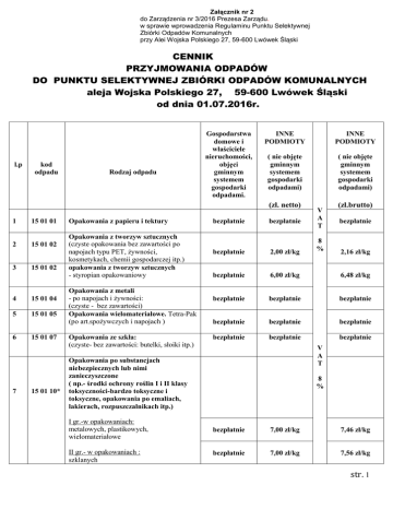 Załącznik nr 2 do Zarządzenia nr 3/2016 Prezesa Zarządu. w sprawie wprowadzenia Regulaminu Punktu Selektywnej Zbiórki Odpadów Komunalnych przy Alei Wojska Polskiego 27, 59-600 Lwówek Śląski CENNIK PRZYJMOWANIA ODPADÓW DO PUNKTU SELEKTYWNEJ ZBIÓRKI ODPADÓW KOMUNALNYCH aleja Wojska Polskiego 27, 59-600 Lwówek Śląski od dnia 01.07.2016r. l.p kod odpadu Rodzaj odpadu Gospodarstwa domowe i właściciele nieruchomości, objęci gminnym systemem gospodarki odpadami. INNE PODMIOTY INNE PODMIOTY ( nie objęte gminnym systemem gospodarki odpadami) ( nie objęte gminnym systemem gospodarki odpadami) (zł. netto) 1 15 01 01 2 15 01 02 3 15 01 02 4 15 01 04 5 15 01 05 6 7 15 01 07 15 01 10* Opakowania z papieru i tektury Opakowania z tworzyw sztucznych (czyste opakowania bez zawartości po napojach typu PET, żywności, kosmetykach, chemii gospodarczej itp.) opakowania z tworzyw sztucznych - styropian opakowaniowy Opakowania z metali - po napojach i żywności: (czyste - bez zawartości) Opakowania wielomateriałowe. Tetra-Pak (po art.spożywczych i napojach ) Opakowania ze szkła: (czyste- bez zawartości: butelki, słoiki itp.) bezpłatnie bezpłatnie II gr.- w opakowaniach : szklanych 8 % (zł.brutto) bezpłatnie bezpłatnie 2,00 zł/kg bezpłatnie 6,00 zł/kg 6,48 zł/kg bezpłatnie bezpłatnie bezpłatnie bezpłatnie bezpłatnie bezpłatnie bezpłatnie bezpłatnie bezpłatnie 2,16 zł/kg V A T Opakowania po substancjach niebezpiecznych lub nimi zanieczyszczone ( np.- środki ochrony roślin I i II klasy toksyczności-bardzo toksyczne i toksyczne, opakowania po emaliach, lakierach, rozpuszczalnikach itp.) I gr.-w opakowaniach: metalowych, plastikowych, wielomateriałowe V A T 8 % bezpłatnie 7,00 zł/kg 7,46 zł/kg bezpłatnie 7,00 zł/kg 7,56 zł/kg str. 1 8 15 01 11* Zużyte opakowania ciśnieniowe: (dezodoranty, aerozole, farby ,lakiery) 9 16 01 03 Zużyte opony: - samochody osobowe i dostawcze do 3,5t. bezpłatnie 7,00 zł/kg 7,56 zł/kg bezpłatnie Maksymalnie 5 szt. na rok. 5,00 zł/szt. 5,40 zł/szt. V A T Odpłatnie powyżej 5 szt. na rok: 5,40 zł/szt. brutto 10 16 01 03 11 17 01 01, 17 01 02, 17 01 07 12 20 01 01 13 20 01 02 14 20 01 40 15 Zużyte opony: - samochody ciężarowe pow. 3,5t. i pojazdy rolnicze Odpady budowlane i rozbiórkowe z drobnych remontów: - odpady z betonu, gruzu ceglanego, odpadowych materiałów ceramicznych i elementów wyposażenia, innych niż wymienione w 17 01 06, tj. niezawierających substancji niebezpiecznych (np. azbestu, styropianu, wełny mineralnej itp.) 17 Wg.kodu właściwego 32,40 zł/szt. bezpłatnie Odpłatnie ponad limit 360 kg/rok 108 zł/Mg. brutto 100 zł/Mg V A T 108 zł/Mg 8 % bezpłatnie bezpłatnie bezpłatnie bezpłatnie 5,00 zł/kg 5,40 zł/kg Złom stalowy i metali kolorowych. Odpady wielkogabarytowe: 1. Meble zawierające elementy z drewna lub płyt drewnopodobnych. Okna i drzwi drewniane z szybami bezbarwnymi: bezpłatnie Bezpłatnie bezpłatnie bezpłatnie Odpłatnie ponad limit 360 kg/rok 0,54 zł/kg brutto Bezpłatnie 0,50 zł/kg 0,54 zł/kg 20 03 07 20 01 39 30,00 zł/szt. Makulatura, karton , tektura (czasopisma, książki, papier biurowy) Szkło okienne bezbarwne bez szyb zespolonych 2. Meble zawierające elementy tapicerskie oraz dywany, wykładziny podłogowe, materace, itp. Okna i drzwi z PCV z szybami bezbarwnymi 16 32,40 zł/szt. brutto 8 % Tworzywa sztuczne; (meble ogrodowe, doniczki, rury i rynny PCV, elementy wyposażenia wnętrz, wiadra itp.) Kompletne zużyte urządzenia elektryczne i elektroniczne ( z których nie wymontowano żadnych elementów wraz z kompletnym kablem zasilającym ) ( zgodnie z Załącznikiem nr 1. do Regulaminu.) Odpłatnie ponad limit 360 kg/rok 0,81 zł/kg brutto V A T 0,75 zł/kg 8 % 0,81 zł/kg bezpłatnie 2,00 zł/kg 2,16 zl/kg bezpłatnie 1,00 zł/kg 1,08 zł/kg str. 2 18 19 20 01 21* 20 01 34 20 20 02 01 21 20 01 32 22 20 01 11 20 01 10 10 01 01 23 Lampy fluoroscencyjne i inne odpady zawierające rtęć: ( zgodnie z Załącznikiem nr 1. do Regulaminu.) Zużyte baterie i akumulatory małogabarytowe Odpady ulegające biodegradacji dostarczone w białych oznakowanych workach o poj.120 l: (trawa, liście, zielone odpady z ogrodów, rozdrobnione gałęzie, itp.) Przeterminowane leki; ( bez opakowań papierowo-kartonowych) Tekstylia Odzież Żużle i popioły paleniskowe z pieców gospodarstw domowych bezpłatnie 1,00 zł/kg 1,08 zł/kg bezpłatnie 1,00 zł/kg 1,08 zł/kg Bezpłatnie Odpłatnie ponad limit 360 kg/rok 388,80 zł/Mg brutto bezpłatnie bezpłatnie bezpłatnie 360,00 zł/Mg 388,80 zł/Mg 8,00 zł/kg 8,64 zł/kg 1,00 kg 485,00 zł/Mg 1,08 zł/kg 523,80 zł/Mg CENNIK USŁUGI TRANSPORTOWEJ ODPADÓW DO PSZOK Zgodnie z Załącznikiem nr 4. Cennik usług transportowych. Zakład Oczyszczania Miasta w Lwówku Śląskim Sp. z o.o. z siedzibą w Lwówku Śląskim, Aleja Wojska Polskiego 27, 59-600 Lwówek Śląski. Zarejestrowana w Sądzie Rejonowym dla Wrocławia-Fabrycznej we Wrocławiu, IX Wydział Gospodarczy Krajowego Rejestru Sądowego. Nr. KRS 0000455302. NIP:6161556562 REGON: 022104403. Kapitał zakładowy: 584 400,00 PLN. str. 3