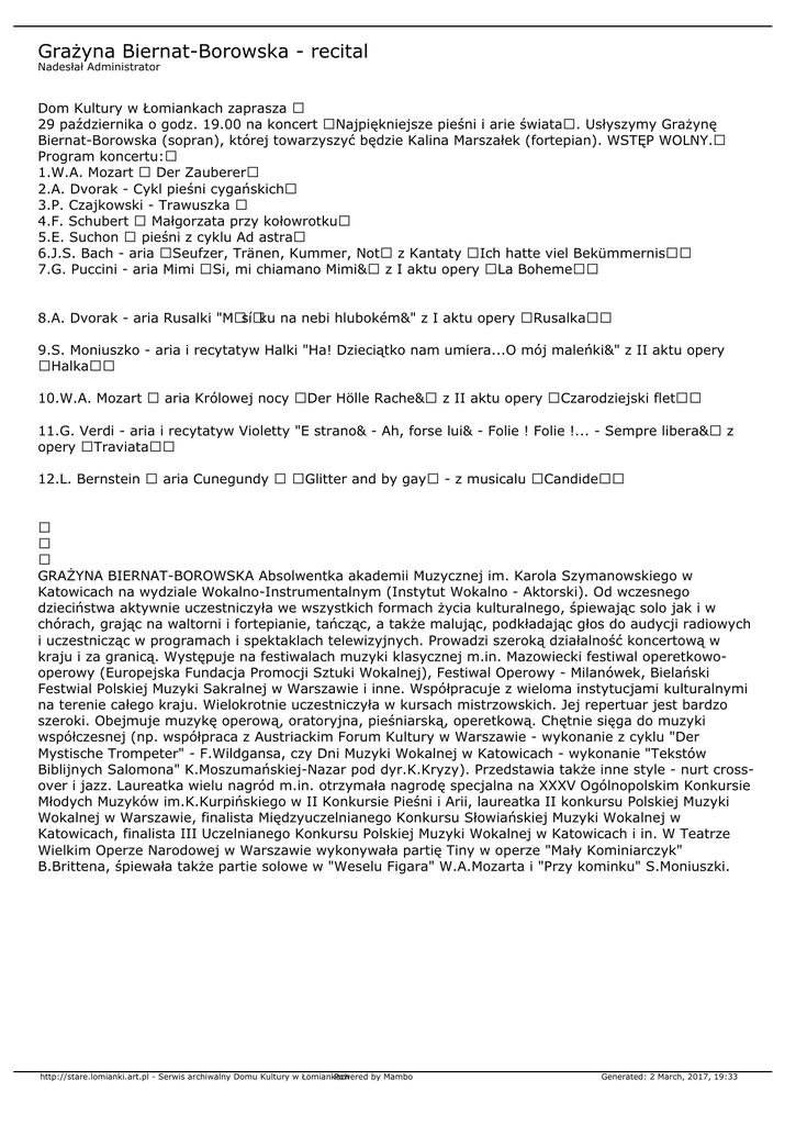 Grażyna Biernat-Borowska - recital Nadesłał Administrator Dom Kultury w Łomiankach zaprasza 29 października o godz. 19.00 na koncert Najpiękniejsze pieśni i arie świata. Usłyszymy Grażynę Biernat-Borowska (sopran), której towarzyszyć będzie Kalina Marszałek (fortepian). WSTĘP WOLNY. Program koncertu: 1.W.A. Mozart Der Zauberer 2.A. Dvorak - Cykl pieśni cygańskich 3.P. Czajkowski - Trawuszka 4.F. Schubert Małgorzata przy kołowrotku 5.E. Suchon pieśni z cyklu Ad astra 6.J.S. Bach - aria Seufzer, Tränen, Kummer, Not z Kantaty Ich hatte viel Bekümmernis 7.G. Puccini - aria Mimi Si, mi chiamano Mimi& z I aktu opery La Boheme 8.A. Dvorak - aria Rusalki "Mìsíèku na nebi hlubokém&" z I aktu opery Rusalka 9.S. Moniuszko - aria i recytatyw Halki "Ha! Dzieciątko nam umiera...O mój maleńki&" z II aktu opery Halka 10.W.A. Mozart aria Królowej nocy Der Hölle Rache& z II aktu opery Czarodziejski flet 11.G. Verdi - aria i recytatyw Violetty "E strano& - Ah, forse lui& - Folie ! Folie !... - Sempre libera& z opery Traviata 12.L. Bernstein aria Cunegundy Glitter and by gay - z musicalu Candide GRAŻYNA BIERNAT-BOROWSKA Absolwentka akademii Muzycznej im. Karola Szymanowskiego w Katowicach na wydziale Wokalno-Instrumentalnym (Instytut Wokalno - Aktorski). Od wczesnego dzieciństwa aktywnie uczestniczyła we wszystkich formach życia kulturalnego, śpiewając solo jak i w chórach, grając na waltorni i fortepianie, tańcząc, a także malując, podkładając głos do audycji radiowych i uczestnicząc w programach i spektaklach telewizyjnych. Prowadzi szeroką działalność koncertową w kraju i za granicą. Występuje na festiwalach muzyki klasycznej m.in. Mazowiecki festiwal operetkowooperowy (Europejska Fundacja Promocji Sztuki Wokalnej), Festiwal Operowy - Milanówek, Bielański Festwial Polskiej Muzyki Sakralnej w Warszawie i inne. Współpracuje z wieloma instytucjami kulturalnymi na terenie całego kraju. Wielokrotnie uczestniczyła w kursach mistrzowskich. Jej repertuar jest bardzo szeroki. Obejmuje muzykę operową, oratoryjna, pieśniarską, operetkową. Chętnie sięga do muzyki współczesnej (np. współpraca z Austriackim Forum Kultury w Warszawie - wykonanie z cyklu "Der Mystische Trompeter" - F.Wildgansa, czy Dni Muzyki Wokalnej w Katowicach - wykonanie "Tekstów Biblijnych Salomona" K.Moszumańskiej-Nazar pod dyr.K.Kryzy). Przedstawia także inne style - nurt crossover i jazz. Laureatka wielu nagród m.in. otrzymała nagrodę specjalna na XXXV Ogólnopolskim Konkursie Młodych Muzyków im.K.Kurpińskiego w II Konkursie Pieśni i Arii, laureatka II konkursu Polskiej Muzyki Wokalnej w Warszawie, finalista Międzyuczelnianego Konkursu Słowiańskiej Muzyki Wokalnej w Katowicach, finalista III Uczelnianego Konkursu Polskiej Muzyki Wokalnej w Katowicach i in. W Teatrze Wielkim Operze Narodowej w Warszawie wykonywała partię Tiny w operze "Mały Kominiarczyk" B.Brittena, śpiewała także partie solowe w "Weselu Figara" W.A.Mozarta i "Przy kominku" S.Moniuszki. http://stare.lomianki.art.pl - Serwis archiwalny Domu Kultury w Łomiankach Powered by Mambo Generated: 2 March, 2017, 19:33