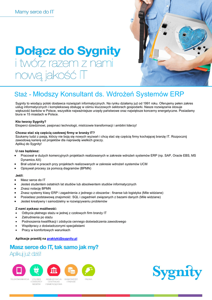 Staż - Młodszy Konsultant ds. Wdrożeń Systemów ERP Sygnity to wiodący polski dostawca rozwiązań informatycznych. Na rynku działamy już od 1991 roku. Oferujemy pełen zakres informatycznych i kompleksową obsługę w ośmiu kluczowych sektorach gospodarki. Nasze rozwiązania stosuje Nrusług ref. e-podatki/JK/0320/S większość banków w Polsce, wszystkie najważniejsze urzędy państwowe oraz największe koncerny energetyczne. Posiadamy biura w 15 miastach w Polsce. Kto tworzy Sygnity? Eksperci dziedzinowi, pasjonaci technologii, mistrzowie transformacji i ambitni liderzy! Chcesz stać się częścią czołowej firmy w branży IT? Szukamy ludzi z pasją, którzy nie boją się nowych wyzwań i chcą stać się częścią firmy kochającej branżę IT. Rozpocznij zawodową karierę od projektów dla naprawdę wielkich graczy. Aplikuj do Sygnity! U nas będziesz: Pracował w dużych komercyjnych projektach realizowanych w zakresie wdrożeń systemów ERP (np. SAP, Oracle EBS, MS Dynamics AX) Brał udział w pracach przy projektach realizowanych w zakresie wdrożeń systemów UCM Opisywał procesy za pomocą diagramów (BPMN) Jeśli: Masz serce do IT Jesteś studentem ostatnich lat studiów lub absolwentem studiów informatycznych Znasz notację BPMN Znasz systemy klasy ERP i zagadnienia z jednego z obszarów : finanse lub logistyka (Mile widziane) Posiadasz podstawową znajomość: SQL i zagadnień związanych z bazami danych (Mile widziane) Jesteś kreatywny i samodzielny w rozwiązywaniu problemów Z nami zyskasz możliwość: Odbycia płatnego stażu w jednej z czołowych firm branży IT Zatrudnienia po stażu Podnoszenia kwalifikacji i zdobycia cennego doświadczenia zawodowego Współpracy z doświadczonymi specjalistami Pracy w komfortowych warunkach Aplikacje prześlij na [email protected]