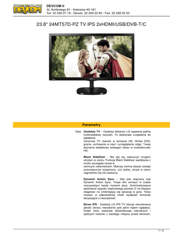 DEVCOM II Al. Korfantego 81 - Katowice 40-161 Tel. 32 259 27 19 - Serwis: 32 259 22 60 - Fax: 32 258 05 53 23.8'' 24MT57D-PZ TV IPS 2xHDMI/USB/DVB-T/C Parametry Opis Osobisty TV – Osobisty telewizor LG zapewnia pełnię multimedialnej rozrywki. To doskonałe urządzenie do oglądania transmisji TV również w formacie HD, filmów DVD, grania, surfowania w sieci i przeglądania zdjęć. Twoje doznania dodatkowo wzbogaci obraz w rozdzielczości HD. Black Stabilizer - Nie daj się zaskoczyć wrogom ukrytym w cieniu. Funkcja Black Stabilizer wydobywa z mroku szczegóły ukryte w ciemnych zakamarkach. Wykryty ciemny obszar zostaje automatycznie rozjaśniony. Już żadne, ukryte w cieniu zagrożenie Cię nie zaskoczy. Dynamic Action Sync – Gdy jest włączony tryb Dynamic Action Sync, Twoje oko uchwyci w czasie rzeczywistym każdy moment akcji. Zminimalizowane opóźnienie sygnału wejściowego pozwoli Ci na bieżąco reagować na zmieniającą się sytuację w grze. Teraz możesz w odpowiedniej chwili wydawać komendy decydujące o zwycięstwie! Ekran IPS - Osobisty LG IPS TV oferuje niezrównaną jakość obrazu niezależnie pod jakim kątem oglądasz. Dzięki temu widzowie doświadczają naturalnych i spójnych kolorów z każdego miejsca przed ekranem. 1/3 DEVCOM II Al. Korfantego 81 - Katowice 40-161 Tel. 32 259 27 19 - Serwis: 32 259 22 60 - Fax: 32 258 05 53 Perfekcyjnie odwzorowane, naturalne kolory pozwalają wprost zanurzyć się w oglądanym obrazie. Divx HD Play - Funkcja ta umożliwia natychmiastowe odtwarzanie plików wideo poprzez proste podłączenie dysku, pendriva lub innego rodzaju pamięci wprost do gniazda USB w Osobistym LG TV, bez konieczności wydawania pieniędzy na dodatkowy sprzęt. Dźwięk stereo - Realistyczny dźwięk stereo uatrakcyjni każdy film czy grę. Dzięki wbudowanym głośnikom stereo nie musisz podłączać i rozstawiać wokół telewizora dodatkowych zestawów grających. Funkcja USB Quick View (wspiera Divx) – funkcja ta umożliwia natychmiastowe odtwarzanie plików wideo poprzez proste podłączenie dysku, pendriva lub innego rodzaju pamięci wprost do gniazda USB w Twoim telewizorze. Funkcja PIP (obraz w obrazie) - Funkcja obrazu w obrazie (PIP) to sposób na wyświetlanie wielu obrazów w tym samym czasie na jednym ekranie. Teraz podczas przeglądania internetu możesz jednocześnie oglądać TV. Flicker Safe - Nowa technologia LG chroni oczy przed wyczerpującym migotaniem i nadmiarem męczącego niebieskiego światła. Zaawansowane sterowania podświetleniem praktycznie eliminuje męczący oczy efekt migotania obrazu. By skorzystać z tego systemu wystarczy jedno, proste kliknięcie. Rozwiązanie to umożliwia komfortową, wielogodzinną zabawę i pracę z monitorem. SMART Energy Saving – Monitor LG LED wyświetla jasny obraz bez utraty jego jakości nawet gdy oszczędzasz energię korzystając z funkcji SUPER Energy Saving. Teraz możesz oszczędzić jeszcze więcej energii niż było to możliwe w tradycyjnych monitorach LED i to przy zachowaniu najwyższej jakości obrazu. Model 24MT57D-PZ Proporcje obrazu Przekątna ekranu Typ matrycy Powierzchnia matrycy Ekran dotykowy Technologia podświetlania Rozdzielczość Czas reakcji 16:9 23.8'' TFT IPS Brak danych Nie Diody LED 1920 x 1080 (HD 1080) 5 Jasność 250 Kontrast statyczny Brak danych Kontrast dynamiczny 5 000 000:1 Kąt widzenia poziomy 178 2/3 DEVCOM II Al. Korfantego 81 - Katowice 40-161 Tel. 32 259 27 19 - Serwis: 32 259 22 60 - Fax: 32 258 05 53 Kąt widzenia pionowy 178 Ilość kolorów Gniazda we/wy Gniazda we/wy Gniazda we/wy Gniazda we/wy Gniazda we/wy Gniazda we/wy Gniazda we/wy Gniazda we/wy Wbudowane głośniki Wbudowany tuner TV Wbudowany tuner TV Pivot Certyfikaty Standard VESA Pobór mocy 16,7 mln 1 x SCART (RGB) 1 x Component (Y, Pb, Pr) 2 x HDMI 1 x RCA in 1 x Audio in 1 x USB 2.0 1 x Composite 1 x 15-pin D-Sub Tak DVB-C DVB-T Nie Brak danych 75 x 75 22 Kolor Czarny Wysokość 343 Wysokość z podstawą 437 Szerokość 555 Głębokość 75 Głębokość z podstawą 198 Waga 3.6 Waga z podstawą 3.8 3/3 Powered by TCPDF (www.tcpdf.org)