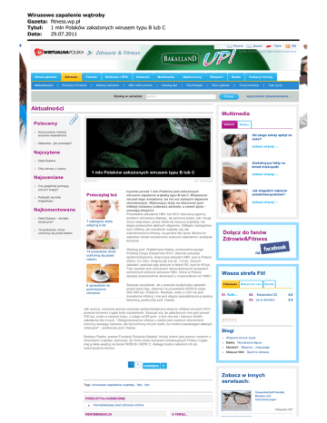 Wirusowe zapalenie w¹troby Gazeta: fitness.wp.pl Tytu³: 1 mln Polaków zaka¿onych wirusem typu B lub C Data: 29.07.2011 5 4 3 2 1 Poczta Docelu Tanio RSS Ustaw fitness.wp.pl jako stronę startow ą Strona głó wna Aktualno ści Zdrowie | Fitness Wirtualny Poradnik | Wellness i SPA Metody naturalne | Nowości ABC odchudzania Szukaj w serwisie Multimedia | Katalog diet Użytkownicy | Psychologia Eksperci | Media Rzuć palenie! szukaj... | Szukaj Kobiecy trening Tw ój horoskop Test życia | wyszukanie zaawansowane Aktualności Multimedia Polecamy Galerie Nowoczesne metody leczenia niepłodności Wideo Od czego zależy apetyt na seks? Nadżerka - jak powstaje? zobacz więcej Najczytane Dieta Dukana Zaskakujące fakty na temat miesiączki Olej zdrowy z natury 1 mln Polaków zakażonych wirusem typu B lub C zobacz więcej Najoceniane 29.07.2011 Czy grejpfruty pomogą zrzucić wag ę? Pozbądź się bólu kręgosłupa Przeczytaj też Najkomentowane Dieta Dukana - nie taka skuteczna? 7 zabiegów, które odejm ą ci lat 14 produktów, które uchronią cię przed rakiem 14 produktów, które uchronią cię przed rakiem 6 sposob ów na podniesienie ciśnienia fot. Thinkstock Jak złagodzić napięcie przedmiesiączkowe? Łącznie ponad 1 mln Polaków jest zakażonych wirusem zapalenia wątroby typu B lub C. Większość nie jest tego świadoma, bo nie ma żadnych objawów chorobowych. Wykonując testy na obecność tych infekcji możemy uratować zdrowie, a nawet życie uważają eksperci. Przewlekłe zakażenia HBV lub HCV stanowią ogromy problem zdrowotny dlatego, że zarówno jeden, jak i drugi wirus stopniowo, przez wiele lat niszczą wątrobę, nie dając przeważnie żadnych objawów. Odległe następstwa tych infekcji, jak marskość wątroby czy rak wątrobowokom órkowy, są groźne dla życia. Można im zapobiec dzięki wczesnemu wykryciu zakażenia i podjęciu leczenia. Według prof. Waldemara Haloty, przewodniczącego Polskiej Grupy Ekspertów HCV, obecnie sytuacja epidemiologiczna, dotycząca zakażeń HBV, jest w Polsce dobra. Co roku, diagnozuje się ok. 1,5 tys. nowych zakażeń, podczas gdy jeszcze w latach 80. było to 40 tys. Taki spadek jest sukcesem obowi ązkowych szczepień ochronnych przeciw wirusowi HBV, które w Polsce zaczęto powszechnie stosować u noworodków od 1996 r. Szacuje się jednak, że z powodu dużej liczby zakażeń przed wielu laty, obecnie na przewlekłe WZW B cierpi 300-400 tys. Polaków. Niestety, wielu z nich nie jest świadoma infekcji i nie jest objęta specjalistyczną opieką lekarską, podkreśla prof. Halota. Jak ocenia, znacznie gorsza sytuacja epidemiologiczna dotyczy infekcji wirusem HCV, przeciw któremu ciągle brak szczepionki. Szacuje się, że zakażonych nim jest ponad 700 tys. osób w naszym kraju, z czego aż 90 proc. o tym nie wie i stanowi źródło zakażenia dla innych. "Zdiagnozowanie infekcji u siebie jest ważnym elementem ochrony swojego zdrowia, ale też ochrony innych osób, bo można zapobiegać dalszym infekcjom" - podkreśla prof. Halota. Barbara Pepke, prezes Fundacji Gwiazda Nadziei, kt órej celem jest pomoc osobom z chorobami wątroby, zaznacza, że mimo wielu kampanii edukacyjnych Polacy ciągle maj ą nikłą wiedzę na temat WZW B i WZW C, dlatego trudno nakłonić ich do wykonywania testów. zobacz więcej Wasza strefa Fit! Fitnesski 01. Rolki ... Dołącz do nas Sonda 02. Madziulka132 4.0 03. ja w domku! 2.5 Blogi Aktywna strona życia Babka: Wymarzona figura Maniek21: Siłownia - moja pasja Mateusz1994: Sport to zdrowie 1 2 Zobacz w innych serwisach: Tagi: wirusowe zapalenie wątroby, hbv, hcv Gewerkschaft Handel, Banken und Versicherungen PRZECZYTAJ KONIECZNIE l Kompleksowy test zdrowia online Wikipedia WP REKOMENDACJA A TERAZ... Prometeusze Wyślij znajomemu Zobacz w innych serwisach: Tagi: wirusowe zapalenie wątroby, hbv, hcv Wirusowe zapalenie w¹troby Gazeta: fitness.wp.pl PRZECZYTAJ KONIECZNIE Tytu³: 1 mln Polaków zaka¿onych wirusem typu B lub C Kompleksowy test zdrowia online l Data: 29.07.2011 REKOMENDACJA Gewerkschaft Handel, Banken und Versicherungen Wikipedia WP A TERAZ... Prometeusze Wyślij znajomemu Polecam wiadomo ść: Rekomendowana: Wydrukuj Wikipedia WP Powiązane artykuły Straż Fabryczna Hird Dlaczego kobiety rzadziej zapadają na raka żołądka? WHO ostrzega przed odrą w Europie Ta choroba naprawdę istnieje! Psychopaci - inteligentni i pozbawieni uczuć wyższych Opinie: 0 Dodaj swoją opinię Ten materiał nie ma jeszcze opinii. Masz okazję by Twój głos pojawił się tutaj jako pierwszy! Nie czekaj - dodaj swoj ą opinię! Masz swoje poglądy? Tu jest miejsce, gdzie możesz je swobodnie wyrazi ć! Pisz, komentuj i dyskutuj. Pamiętaj o tym, że nie będziemy tolerować niecenzuralnych wypowiedzi i wulgaryzmów. Wymieniaj poglądy a nie obelgi. Zasady Opinii. O firmie | Dla prasy | Reklama | Biznes z WP | Skontaktuj się z WP | Praca | Prywatność | Polityka antyspamowa Zobacz wszystkie serwisy | RSS Copyright © 1995-2011 Wirtualna Polska Wikipedia WP Wirusowe zapalenie w¹troby Gazeta: fitness.wp.pl Tytu³: 1 mln Polaków zaka¿onych wirusem typu B lub C Data: 29.07.2011 5 4 3 2 1 Poczta Docelu Tanio RSS Ustaw fitness.wp.pl jako stronę startow ą Strona głó wna Aktualno ści Zdrowie | Fitness Wirtualny Poradnik | Wellness i SPA Metody naturalne | Nowości ABC odchudzania Szukaj w serwisie Multimedia | Katalog diet Użytkownicy | Psychologia Eksperci | Media Rzuć palenie! szukaj... | Szukaj Kobiecy trening Tw ój horoskop Test życia | wyszukanie zaawansowane Aktualności Multimedia Polecamy Galerie Nowoczesne metody leczenia niepłodności Wideo Od czego zależy apetyt na seks? Nadżerka - jak powstaje? zobacz więcej Najczytane Dieta Dukana Zaskakujące fakty na temat miesiączki Olej zdrowy z natury 1 mln Polaków zakażonych wirusem typu B lub C zobacz więcej Najoceniane 29.07.2011 Czy grejpfruty pomogą zrzucić wag ę? Pozbądź się bólu kręgosłupa Przeczytaj 