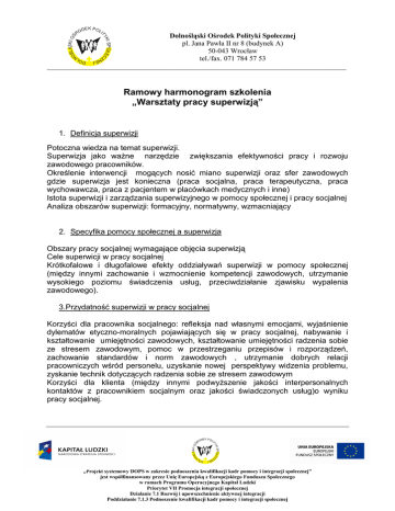 Dolnośląski Ośrodek Polityki Społecznej pl. Jana Pawła II nr 8 (budynek A) 50-043 Wrocław tel./fax. 071 784 57 53 __________________________________________________________________________________ Ramowy harmonogram szkolenia „Warsztaty pracy superwizją” 1. Definicja superwizji Potoczna wiedza na temat superwizji. Superwizja jako waŜne narzędzie zwiększania efektywności pracy i rozwoju zawodowego pracowników. Określenie interwencji mogących nosić miano superwizji oraz sfer zawodowych gdzie superwizja jest konieczna (praca socjalna, praca terapeutyczna, praca wychowawcza, praca z pacjentem w placówkach medycznych i inne) Istota superwizji i zarządzania superwizyjnego w pomocy społecznej i pracy socjalnej Analiza obszarów superwizji: formacyjny, normatywny, wzmacniający 2. Specyfika pomocy społecznej a superwizja Obszary pracy socjalnej wymagające objęcia superwizją Cele superwicji w pracy socjalnej Krótkofalowe i długofalowe efekty oddziaływań superwizji w pomocy społecznej (między innymi zachowanie i wzmocnienie kompetencji zawodowych, utrzymanie wysokiego poziomu świadczenia usług, przeciwdziałanie zjawisku wypalenia zawodowego). 3.Przydatność superwizji w pracy socjalnej Korzyści dla pracownika socjalnego: refleksja nad własnymi emocjami, wyjaśnienie dylematów etyczno-moralnych pojawiających się w pracy socjalnej, nabywanie i kształtowanie umiejętności zawodowych, kształtowanie umiejętności radzenia sobie ze stresem zawodowym, pomoc w przestrzeganiu przepisów i rozporządzeń, zachowanie standardów i norm zawodowych , utrzymanie dobrych relacji pracowniczych wśród personelu, uzyskanie nowej perspektywy widzenia problemu, zyskanie technik dotyczących radzenia sobie ze stresem zawodowym Korzyści dla klienta (między innymi podwyŜszenie jakości interpersonalnych kontaktów z pracownikiem socjalnym oraz jakości świadczonych usług)o wyniku pracy socjalnej. „Projekt systemowy DOPS w zakresie podnoszenia kwalifikacji kadr pomocy i integracji społecznej” jest współfinansowany przez Unię Europejską z Europejskiego Funduszu Społecznego w ramach Programu Operacyjnego Kapitał Ludzki Priorytet VII Promocja integracji społecznej Działanie 7.1 Rozwój i upowszechnienie aktywnej integracji Poddziałanie 7.1.3 Podnoszenie kwalifikacji kadr pomocy i integracji społecznej Dolnośląski Ośrodek Polityki Społecznej pl. Jana Pawła II nr 8 (budynek A) 50-043 Wrocław tel./fax. 071 784 57 53 __________________________________________________________________________________ 4. Funkcje superwizji w placówkach pomocy społecznej Funkcja administracyjno-zarządzająca Funkcja zawodowa Funkcja edukacyjna Funkcja wsparcia emocjonalnego pracownika 5. RóŜnica pomiędzy konsultacją a superwizją Co to jest konsultacja i jaką pełni funkcję Twórcy i odbiorcy konsultacji Sfery moŜliwe do konsultacji Konsultacja merytoryczna RóŜnice w zakresie głębokości oddziaływań konsultacji i superwizji 6. Podstawowe modele superwizji Omówienie wybranych modeli superwizji stosowanych w praktyce kontrakt superwizorski superwizja z perspektywy mocnych stron praca nad biografią podejście systemowe w superwizji Omówienie podstawowych form superwizji oraz ich przydatności w pracy socjalnej: · superwizja formalna i nieformalna · superwizja bezpośrednia i pośrednia · superwizja indywidualna i grupowa Oraz superwizja na Ŝywo i superwizja na podstawie materiału Video 7. Etapy superwizji indywidualnej i grupowej Fazy: omówienia doświadczeń, omówienia odczuć, przetwarzania informacji RóŜnice w przebiegu superwizji indywidualnej i grupowej interpretacji, uogólnienia 8. Czynniki determinujące skuteczność superwizji Czynniki leŜące po stronie osoby superwizora Czynniki organizacyjne Gotowość pracownika do pracy superwizyjnej „Projekt systemowy DOPS w zakresie podnoszenia kwalifikacji kadr pomocy i integracji społecznej” jest współfinansowany przez Unię Europejską z Europejskiego Funduszu Społecznego w ramach Programu Operacyjnego Kapitał Ludzki Priorytet VII Promocja integracji społecznej Działanie 7.1 Rozwój i upowszechnienie aktywnej integracji Poddziałanie 7.1.3 Podnoszenie kwalifikacji kadr pomocy i integracji społecznej Dolnośląski Ośrodek Polityki Społecznej pl. Jana Pawła II nr 8 (budynek A) 50-043 Wrocław tel./fax. 071 784 57 53 __________________________________________________________________________________ 9. Podstawowe trudności w procesie superwizji proces uczenia się, komunikacja w sferze werbalnej i pozawerbalnej, utrudnienia percepcyjne, wpływ emocji, zjawisko oporu i jego źródła, osobiste traumy i nieuświadomione potrzeby, własne nierozwiązane problemy „Projekt systemowy DOPS w zakresie podnoszenia kwalifikacji kadr pomocy i integracji społecznej” jest współfinansowany przez Unię Europejską z Europejskiego Funduszu Społecznego w ramach Programu Operacyjnego Kapitał Ludzki Priorytet VII Promocja integracji społecznej Działanie 7.1 Rozwój i upowszechnienie aktywnej integracji Poddziałanie 7.1.3 Podnoszenie kwalifikacji kadr pomocy i integracji społecznej