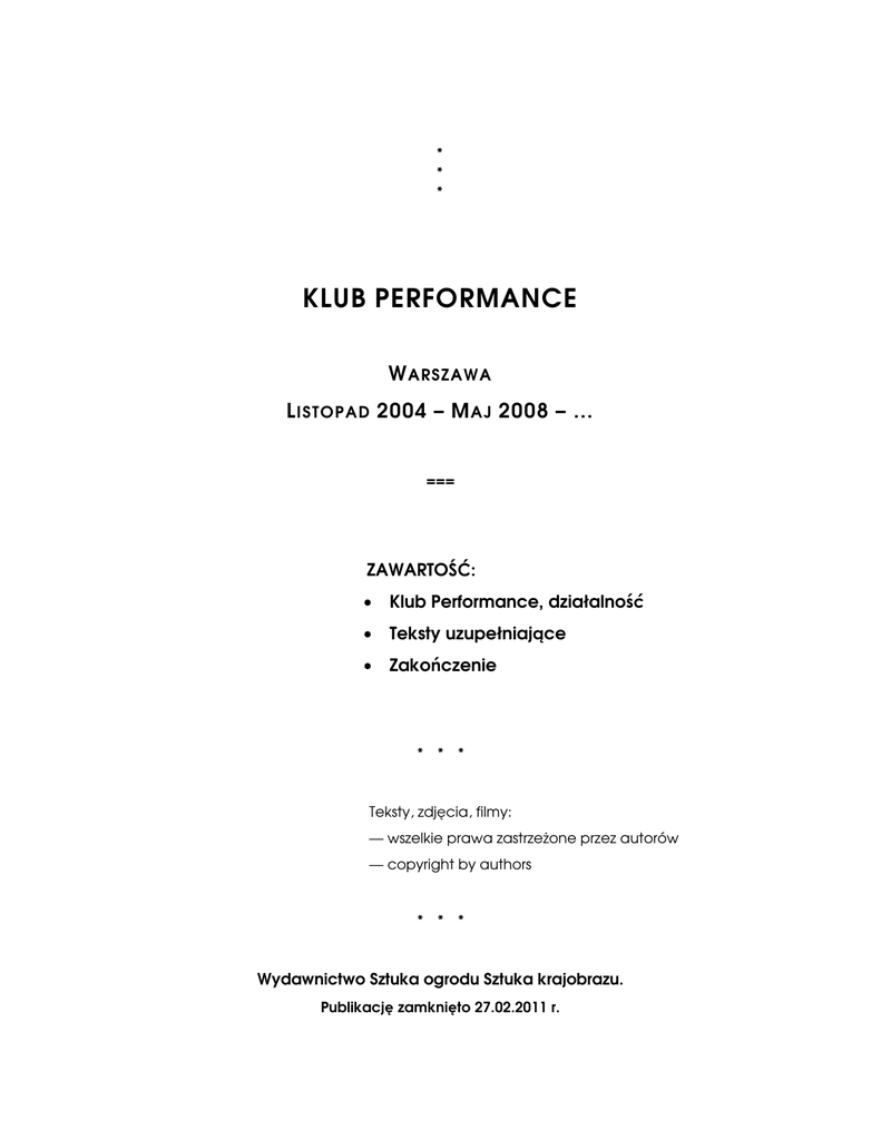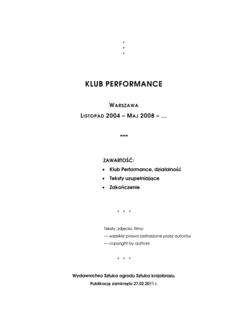 ϭ * * * KLUB PERFORMANCE W ARSZAWA L ISTOPAD 2004 – M AJ 2008 – … === ZAWARTOŚĆ: • Klub Performance, działalność • Teksty uzupełniające • Zakończenie * * * Teksty, zdjęcia, filmy: — wszelkie prawa zastrzeżone przez autorów — copyright by authors * * * Wydawnictwo Sztuka ogrodu Sztuka krajobrazu. Publikację zamknięto 27.02.2011 r. Ϯ Wydanie sfinansowane z projektu badawczego MNiSW N N527 272437 ISBN 978-83-932747-0-3 Druk Projekt okładki: Przemysław Kwiek © Layout: Jan Piekarczyk, Przemysław Kwiek Doprowadził do wydania: Jan Rylke ϯ KLUB PERFORMANCE, OGŁOSZENIE ZAŁOŻYCIELSKIE: „Dnia 12 listopada 2004 w Warszawie Jan Rylke, Przemysław Kwiek i Jan Piekarczyk powołali »Klub Performance«”. Celem Klubu są: Spotkania, Realizacje i Rejestracje.” *** Dokumentacja fotograficzna: przeważnie Mikołaj Tym. Dokumentacja DVD: przeważnie Grzegorz Rogala. Od lewej: Jan Piekarczyk, Przemysław Kwiek, Jan Rylke, Fot. Mikołaj Tym PERFORMANCE CLUB, a set up announcement: On 12 November 2004 in Warsaw, Jan Rylke, Przemyslaw Kwiek and Jan Piekarczyk created the "Performance Club", in order to set up meetings, realize projects, and keep track of documentation. The photo documentation: in large part by Mikolaj Tym. The DVD documentation: in large part by Grzegorz Rogala. Kalendarz spotkań Klubu Performance / The calendar of the Performance Club meetings: 1. spotkanie/meeting: 6.12.2004 Galeria Krytyków Pokaz Małgorzata Butterwick, Angel Pastor, Jan Piekarczyk, Jan Rylke, Anastazy B. Wiśniewski 2. spotkanie/meeting: 7.01.2005 Galeria Krytyków Pokaz Peter Grzybowski, Ewa Rybska & Władysław Kaźmierczak 3. spotkanie/meeting: 18.01.2005 Galeria Kordegarda Krzysztof Żwirblis z zespołem, Przemysław Kwiek, Aleksandra Polisiewicz ϰ 4. spotkanie/meeting: 7.02.2005 Galeria Krytyków Pokaz Paweł Górecki, Wojciech Kowalski, Mariusz Cur 5. spotkanie/meeting: 7.03.2005 Galeria Krytyków Pokaz Janusz Bałdyga, Dariusz Fodczuk 6. spotkanie/meeting: 8.03.2005 Galeria Kordegarda Paweł Kwiek, Przemysław Kwiek, Jan Piekarczyk 7. spotkanie/meeting: 9.05.2005 Galeria Krytyków Pokaz Teresa Murak, Alina Anka Kowalska 8. spotkanie/meeting: 13.06.2005 Galeria Krytyków Pokaz Krzysztof Knittel i przyjaciele 9. spotkanie/meeting: 14.06.2005 Galeria Kordegarda Paweł Kwaśniewski, Ryszard Ługowski, Anastazy B. Wiśniewski, Tomasz Sikorski 10. spotkanie/meeting: 10.10.2005 Galeria Krytyków Pokaz Karolina Stępniowska, Waldemar Petryk 11. spotkanie/meeting: 11.10.2005 Galeria Kordegarda Jan Rylke, Jan Piekarczyk, Przemysław Kwiek 12. spotkanie/meeting 5.12.2005 Galeria Krytyków Pokaz Jan Piekarczyk, Larysa Truszyk 13. spotkanie/meeting: 6.02.2006 Galeria Krytyków Pokaz Mariusz "Marchewa" Marchlewicz, Martyna Piasecka, Magda Burzyńska, Olga Nowakowska, Szymon Cecotka 14. spotkanie/meeting: 2.10.2006 Galeria Krytyków Pokaz Anastazy B. Wiśniewski, Wspomnienie o Anastazym cz. II, wystąpili Paweł Zawadzki, Ewa Mikina 15. spotkanie/meeting: 20.11.2006 Galeria Krytyków Pokaz Jan Piekarczyk, Przemysław Kwiek, Jan Rylke 16. spotkanie/meeting: 8.12.2006 Galeria Krytyków Pokaz Marcela Kawka, Joanna Mach, Robert Pludra, Paweł Zalewski, Maciej Iwiński, Marek Kultys, Piotr Krupski, Grzegorz Rogala, Prakseda Yerka, Vu Thu Thuy, Marcin Ebert, Klara Jankiewicz 17. spotkanie/meeting 7.04.2007 Galeria XX1 Jan Piekarczyk, Grzegorz Rogala, Maciej Meru Adamczewski, Jan Rylke, Przemysław Kwiek ϱ 18. spotkanie/meeting: 4.06.2007 Galeria Krytyków Pokaz Łukasz Owczynnikow, Robert Pludra, Paweł Zalewski, Marcin Ebert, Karolina Stępniowska, Janusz Bałdyga, Nazar Honczar, Grzegorz Rogala 19. spotkanie/meeting: 8.10.2007 Galeria Krytyków Pokaz Angel Pastor, Jan Piekarczyk, Robert Pludra & Paweł Zalewski, Małgosia Butterwick, Przemysław Kwiek 20. spotkanie/meeting: 30.11.2007 Galeria Krytyków Pokaz Wojciech Kowalczyk, Maciej Meru Adamczewski & Irmina Kot, Jan Rylke 21. spotkanie/meeting: 7.04.2008 Galeria Krytyków Pokaz Robert Pludra & Paweł Zalewski 22. spotkanie/meeting 8.05.2008 Galeria XX1 Przemysław Kwiek, Robert Pludra & Paweł Zalewski, Jan Rylke, Jan Piekarczyk, Grzegorz Rogala, Ryszard Ługowski List of Artists: Małgorzata Butterwick, Angel Pastor, Jan Piekarczyk, Jan Rylke, Anastazy B. Wiśniewski, = 5 Peter Grzybowski, Ewa Rybska & Władysław Kaźmierczak, = 3 Krzysztof Żwirblis (z zespołem: Natalia Golanowska, Mariusz Maciejewski, Urszula Prussak), Przemysław Kwiek, Aleksandra Polisiewicz, = 6 Paweł Górecki, Wojciech Kowalski, Mariusz Cur, = 3 Janusz Bałdyga, Dariusz Fodczuk, = 2 Paweł Kwiek, Przemysław Kwiek, Jan Piekarczyk, = 1 (+ 2) Teresa Murak, Alina Anka Kowalska, = 2 Krzysztof Knittel (i przyjaciele: Teresa Murak, Zofia Knittel, Ewelina Sojecka, Ewa Trafna, Cezary Chojnowski, Edward Dwurnik, Włodek Kiniorski, Krzysztof Knittel, Jacek Kochan, Przemysław Kwiek, Ryszard Latecki, Jan Piekarczyk, Mateusz Piekarczyk, Jan Pieniążek, Jan Rylke, Tadeusz Sudnik, Jerzy Truszkowski, Rafał Wnuk, Andrzej Wróbel) = 15 (+ 4) Paweł Kwaśniewski, Ryszard Ługowski, Anastazy B. Wiśniewski, Tomasz Sikorski, = 3 (+1 + 3) Karolina Stępniowska, Waldemar Petryk, = 2 Jan Rylke, Jan Piekarczyk, Przemysław Kwiek, (+3) Jan Piekarczyk, Larysa Truszyk, = 1 (+1) Mariusz "Marchewa" Marchlewicz, Martyna Piasecka, Magda Burzyńska, Olga Nowakowska, Szymon Cecotka, = 5 Paweł Zawadzki, Ewa Mikina,=2 Jan Piekarczyk, Przemysław Kwiek, Jan Rylke, (+3) Marcela Kawka, Joanna Mach, Robert Pludra, Paweł Zalewski, Maciej Iwiński, Marek Kultys, Piotr Krupski, Grzegorz Rogala, Prakseda Yerka, Vu Thu Thuy, Marcin Ebert, Klara Jankiewicz, = 12 Jan Piekarczyk, Grzegorz Rogala, Maciej Meru Adamczewski, Jan Rylke, Przemysław Kwiek, = 1 (+4) Łukasz Owczynnikow, Robert Pludra, Paweł Zalewski, Marcin Ebert, Karolina Stępniowska, Janusz Bałdyga, Nazar Honczar, Grzegorz Rogala, = 3 (+5) Angel Pastor, Jan Piekarczyk, Robert Pludra & Paweł Zalewski, Małgosia Butterwick, Przemysław 