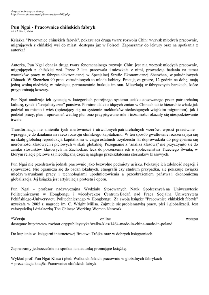Artykuł pobrany ze strony http://www.ekonsument.pl/news-show-762.php Pun Ngai - Pracownice chińskich fabryk 18.11.2010, Zuza Książka "Pracownice chińskich fabryk", pokazująca drugą twarz rozwoju Chin: wyzysk młodych pracownic, migrujących z chińskiej wsi do miast, dostępna już w Polsce! Zapraszamy do lektury oraz na spotkania z autorką! Autorka, Pun Ngai obnaża drugą twarz fenomenalnego rozwoju Chin: jest nią wyzysk młodych pracownic, migrujących z chińskiej wsi. Przez 2 lata pracowała i mieszkała z nimi, prowadząc badania na temat warunków pracy w fabryce elektronicznej w Specjalnej Strefie Ekonomicznej Shenzhen, w południowych Chinach. W Shenzhen 90 proc. zatrudnionych to młode kobiety. Pracują za grosze, 12 godzin na dobę, mają jedną wolną niedzielę w miesiącu, permanentnie brakuje im snu. Mieszkają w fabrycznych barakach, które przypominają koszary. Pun Ngai analizuje ich sytuację w kategoriach potrójnego systemu ucisku stosowanego przez patriarchalną kulturę, rynek i "socjalistyczne" państwo. Pomimo daleko idących zmian w Chinach takie hierarchie władz jak podział na miasto i wieś (opierający się na systemie meldunków niedostępnych wiejskim migrantom), jak i podział pracy, płac i uprawnień według płci oraz przypisywane role i tożsamości okazały się niespodziewanie trwałe. Transformacja nie zmieniła tych nierówności i utrwalonych patriarchalnych wzorów, wprost przeciwnie wprzęgła je do działania na rzecz rozwoju chińskiego kapitalizmu. W ten sposób gwałtownie rozszerzająca się na skalę globalną reprodukcja kapitalizmu w ciągu ostatnich trzydziestu lat doprowadziła do pogłębiania się nierówności klasowych i płciowych w skali globalnej. Pożegnanie z "analizą klasową" nie przyczyniło się do zaniku stosunków klasowych na Zachodzie, lecz do poszerzenia ich o społeczeństwa Trzeciego Świata, w którym relacje płciowe są nieodłączną częścią nagłego przekształcenia stosunków klasowych. Pun Ngai nie przedstawia jednak pracownic jako bezwolne podmioty ucisku. Pokazuje ich zdolność negacji i sprawczość. Nie ogranicza się do badań lokalnych, etnografii czy studium przypadku, ale pokazuje związki między warunkami pracy i technologiami upodmiotowienia a przeobrażeniem państwa i ekonomiczną globalizacją. Jej książka jest artykulacją protestu i oporu. Pun Ngai - profesor nadzwyczajna Wydziału Stosowanych Nauk Społecznych na Uniwersytecie Politechnicznym w Hongkongu i wicedyrektor Centrum Badań nad Pracą Socjalną Uniwersytetu Pekińskiego-Uniwersytetu Politechnicznego w Hongkongu. Za swoją książkę "Pracownice chińskich fabryk" uzyskała w 2005 r. nagrodę im. C. Wright Millsa. Zajmuje się problematyką pracy, płci i globalizacji. Jest założycielką i działaczką The Chinese Working Women Network. *Wersja online dostępna: http://www.rozbrat.org/publicystyka/walka-klas/1464-made-in-china-made-in-poland Do kupienia w księgarni internetowej Bractwa Trójka oraz w dobrych księgarniach. Zapraszamy jednocześnie na spotkania z autorką promujące książkę. Wykład prof. Pun Ngai Klasa i płeć: Walka chińskich pracownic w globalnych fabrykach + prezentacja książki Pracownice chińskich fabryk wstępu Poznań 22 listopada, godz. 18.30 Collegium Maius, ul. Fredry 10 sala Kuraszkiewicza (nr 014) organizatorzy: Pracownia Pytań Granicznych UAM i Oficyna Wydawnicza Bractwa Trojka Warszawa 23 listopada, godz. 16 WFiS UW, ul. Nowy Świat 69 organizatorzy: Instytut Socjologii UW i Think Thank Feministyczny Na podstawie: Oficyna Wydawnicza Bractwa Trojka (http://www.bractwotrojka.pl)