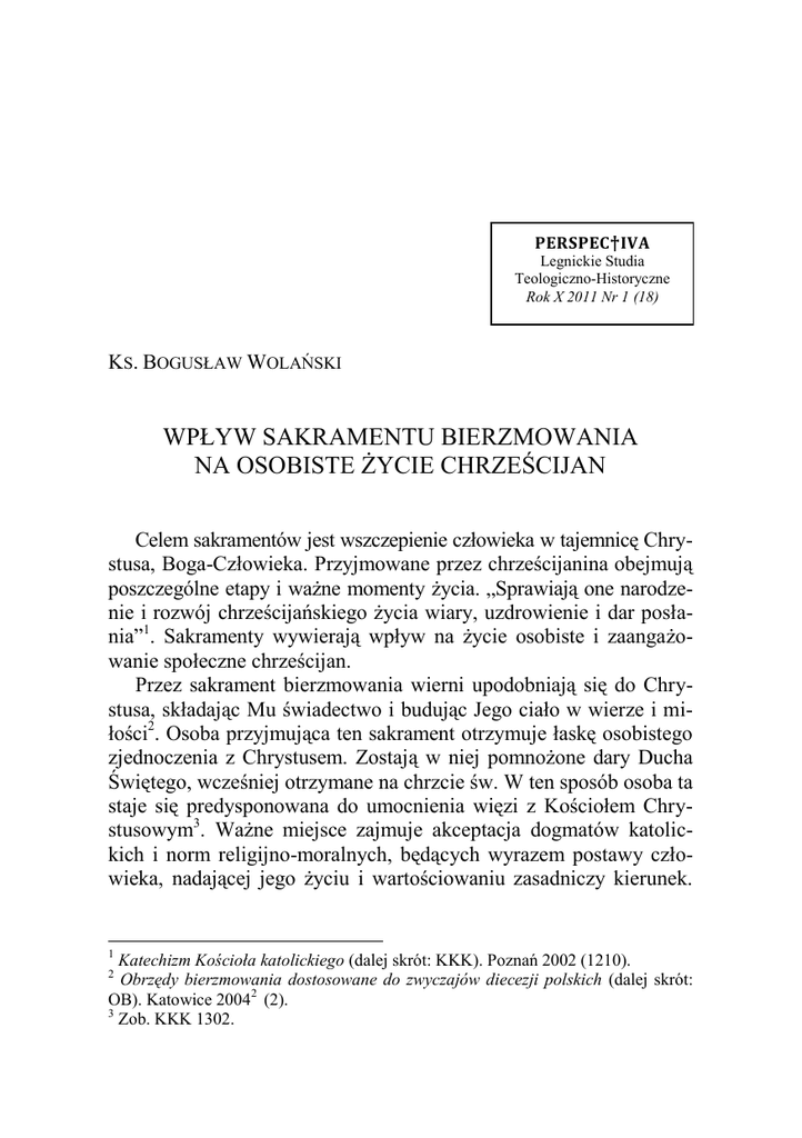 PERSPEC † IVA Legnickie Studia Teologiczno-Historyczne Rok X 2011 Nr 1 (18) KS. BOGUSŁAW WOLAŃSKI WPŁYW SAKRAMENTU BIERZMOWANIA NA OSOBISTE ŻYCIE CHRZEŚCIJAN Celem sakramentów jest wszczepienie człowieka w tajemnicę Chrystusa, Boga-Człowieka. Przyjmowane przez chrześcijanina obejmują poszczególne etapy i ważne momenty życia. „Sprawiają one narodzenie i rozwój chrześcijańskiego życia wiary, uzdrowienie i dar posłania”1. Sakramenty wywierają wpływ na życie osobiste i zaangażowanie społeczne chrześcijan. Przez sakrament bierzmowania wierni upodobniają się do Chrystusa, składając Mu świadectwo i budując Jego ciało w wierze i miłości2. Osoba przyjmująca ten sakrament otrzymuje łaskę osobistego zjednoczenia z Chrystusem. Zostają w niej pomnożone dary Ducha Świętego, wcześniej otrzymane na chrzcie św. W ten sposób osoba ta staje się predysponowana do umocnienia więzi z Kościołem Chrystusowym3. Ważne miejsce zajmuje akceptacja dogmatów katolickich i norm religijno-moralnych, będących wyrazem postawy człowieka, nadającej jego życiu i wartościowaniu zasadniczy kierunek. 1 Katechizm Kościoła katolickiego (dalej skrót: KKK). Poznań 2002 (1210). Obrzędy bierzmowania dostosowane do zwyczajów diecezji polskich (dalej skrót: OB). Katowice 20042 (2). 3 Zob. KKK 1302. 2 280 KS. BOGUSŁAW WOLAŃSKI Ta akceptacja wskazuje na integrację postawy wiary z całą osobowością człowieka4. Problemem tego artykułu jest wpływ sakramentu bierzmowania na osobiste życie chrześcijan. Zostanie on przedstawiony na trzech poziomach: zjednoczenia z Chrystusem, pomnożenia darów Ducha Świętego i umocnienia więzi z Kościołem. 1. ŚCIŚLEJSZE ZJEDNOCZENIE Z CHRYSTUSEM Chrzest czyni ludzi członkami Ciała Chrystusa. Ochrzczeni są wszczepieni w Chrystusa i stają się ludem Bożym, a otrzymawszy odpuszczenie wszystkich grzechów, wyrwani z mocy ciemności, zostają wyniesieni do stanu przybranych synów Boga5. Chrzest zespala człowieka z Chrystusem, by uczynić go uczestnikiem zbawczego wydarzenia wielkanocnego. Człowiek ochrzczony tworzy z Nim taką jedność, która czyni go dziedzicem obietnicy danej Abrahamowi, a przez niego ludowi ustanowionemu na mocy Bożego wezwania6. Chrystus przez sakramenty upodabnia ludzi do siebie w rozmaity sposób. Jeśli jesteśmy organicznie złączeni z Chrystusem przez chrzest, tj. zbliżeni do Jego śmierci, zmartwychwstania i życia, i jeśli cała działalność apostolska Kościoła ma zmierzać do tego, by w nas ukształtować Chrystusa, to i pozostałe sakramenty nie mogą mieć innego skutku7. Misja Ducha Świętego w bierzmowaniu udoskonala dzieło rozpoczęte przez chrzest. Ochrzczony zostaje ściślej włączony do Kościoła i uzdolniony do pełnej realizacji potrójnej funkcji mesjańskiej otrzymanej na chrzcie. Bierzmowany chrześcijanin jest doskonalej upodo4 G. MILANESI. Integrazione tra fede e kultura; problema centrale della pastorale catechetica. W: Ricerche di psicosociologia religiosa. Zurych 1970 s. 70. 5 Obrzędy chrześcijańskiego wtajemniczenia dorosłych dostosowane do zwyczajów diecezji polskich. Katowice 19962 (1). 6 „Bo wy wszyscy, którzy zostaliście ochrzczeni w Chrystusie, przyoblekliście się w Chrystusa. Nie ma już Żyda ani poganina, nie ma już niewolnika ani człowieka wolnego, nie ma już mężczyzny ani kobiety, wszyscy bowiem jesteście kimś jednym w Chrystusie Jezusie. Jeżeli zaś należycie do Chrystusa, to jesteście też potomstwem Abrahama i zgodnie z obietnicą – dziedzicami” (Ga 3,27-29). B. TESTA. Sakramenty Kościoła. Poznań 1998 s. 130. 7 W. GRANAT. Dogmatyka katolicka. T. 7: Sakramenty święte. Cz. 2: Chrzest, bierzmowanie, pokuta. Lublin 1966 s. 169-170. Wpływ sakramentu bierzmowania na osobiste życie 281 bniony do Chrystusa, aby mógł czynnie wypełniać misję proroczą, kapłańską i królewską8. Źródłem doskonalszego zjednoczenia z Chrystusem w bierzmowaniu jest Duch Święty. To zjednoczenie nazywane jest mistycznym utożsamieniem z Chrystusem9. Pojęcie confirmatio, użyte na określenie bierzmowania, zakłada w swej treści umocnienie czegoś, co zostało wcześniej zainicjowane. W chrzcie udziałem chrześcijan stało się już początkowe upodobnienie do Syna Bożego. W bierzmowaniu zostają oni jeszcze bardziej upodobnieni do Chrystusa i umocnieni do składania Mu świadectwa dla budowania Jego Ciała w wierze i miłości (por. OB 2). 2. POMNOŻENIE DARÓW DUCHA ŚWIĘTEGO Jednym ze skutków sakramentu bierzmowania jest pomnożenie darów Ducha Świętego. Wynika z tego, że są one udzielane wcześniej, w sakramencie chrztu świętego. Według Katechizmu Kościoła katolickiego: „Najświętsza Trójca daje ochrzczonemu łaskę uświęcającą, łaskę usprawiedliwienia, która daje mu zdolność życia i działania pod natchnieniem Ducha Świętego za pośrednictwem Jego darów” (KKK 1266). Sakrament chrztu daje Ducha Świętego jako Początek i Zasadę życia Bożego, wszczepia nas w ciało Chrystusa i czyni dziedzicami Bożymi10. Bierzmowanie udziela Ducha Świętego w sposób głębszy, bardziej intensywny i jest umocnieniem chrztu. Katechizm Kościoła katolickiego wiele razy wspomina o darach Ducha Świętego w związku z chrztem (KKK 1266), bierzmowaniem (KKK 1299, 1303) i całym życiem chrześcijańskim (KKK 1830, 8 S. CZERWIK. Struktura i teologia odnowionej liturgii sakramentu bierzmowania. W: Materiały z kursów homiletyczno-katechetyczno-liturgicznych 1972-1974. Red. W. Wojdecki. Warszawa 1979 s. 259-260. Cz. Bartnik dodaje jeszcze, że bierzmowany otrzymuje dar odkupieńczy, który również włącza w Chrystusa. Dzięki temu darowi chrześcijanin włącza się w Chrystusowe dzieło odkupienia, dokonuje wewnętrznej przemiany, bierze na swoje ramiona ofiarniczy charakter życia ludzkiego, nadaje wartość wszystkim cierpieniom, „nosi w sobie konanie Jezusa” (2 Kor 4,10) i dopełnia odkupienia dokonaneg