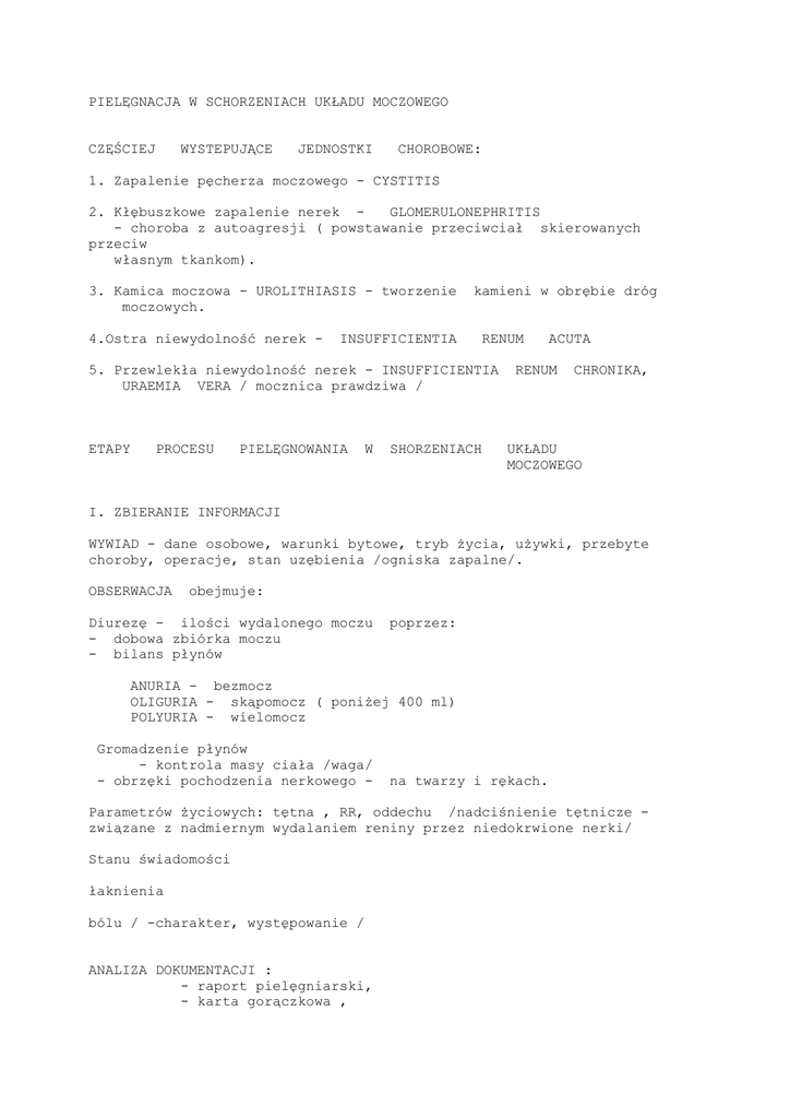 PIELĘGNACJA W SCHORZENIACH UKŁADU MOCZOWEGO CZĘŚCIEJ WYSTEPUJĄCE JEDNOSTKI CHOROBOWE: 1. Zapalenie pęcherza moczowego - CYSTITIS 2. Kłębuszkowe zapalenie nerek GLOMERULONEPHRITIS - choroba z autoagresji ( powstawanie przeciwciał skierowanych przeciw własnym tkankom). 3. Kamica moczowa - UROLITHIASIS - tworzenie moczowych. 4.Ostra niewydolność nerek - INSUFFICIENTIA kamieni w obrębie dróg RENUM 5. Przewlekła niewydolność nerek - INSUFFICIENTIA URAEMIA VERA / mocznica prawdziwa / ETAPY PROCESU PIELĘGNOWANIA W SHORZENIACH ACUTA RENUM CHRONIKA, UKŁADU MOCZOWEGO I. ZBIERANIE INFORMACJI WYWIAD - dane osobowe, warunki bytowe, tryb Ŝycia, uŜywki, przebyte choroby, operacje, stan uzębienia /ogniska zapalne/. OBSERWACJA obejmuje: Diurezę - ilości wydalonego moczu - dobowa zbiórka moczu - bilans płynów poprzez: ANURIA - bezmocz OLIGURIA - skąpomocz ( poniŜej 400 ml) POLYURIA - wielomocz Gromadzenie płynów - kontrola masy ciała /waga/ - obrzęki pochodzenia nerkowego - na twarzy i rękach. Parametrów Ŝyciowych: tętna , RR, oddechu /nadciśnienie tętnicze związane z nadmiernym wydalaniem reniny przez niedokrwione nerki/ Stanu świadomości łaknienia bólu / -charakter, występowanie / ANALIZA DOKUMENTACJI : - raport pielęgniarski, - karta gorączkowa , - zleceń, karta dobowej zbiórki moczu, bilansuwodnego, wyniki badań moczu, krwi (kontrola metabolitów przemiany azotowej mocznika, kreatyniny, kwasu moczowego). występowanie II. PROBLEMY PIELĘGNACYJNE 1. Utrzymanie równowagi - wodnoelektrolitowej W okresie bezmoczu - podaje się tylko około 500ml płynu / utrata pozanerkowa 400- 700ml/ plus ilość równą wydalonego moczu, uwzględniając wymiociny, biegunki. 2. Zapewnienie właściwego odŜywiania - w zaleŜności od schorzenia o niskiej zawartości białka i soli , - w obrzękach ograniczenie podaŜy płynów - w nadwadze ograniczenia kaloryczne 3. Zapewnienie higieny osobistej i otoczenia chorego / zapobieganie zakaŜeniom:pielęgnacja skóry, krocza, cewki moczowej, jamy ustnej/ 4. Kontrola metabolitów przemiany azotowej. 5.Przygotowanie ch. do badań diagnostycznych: - b. ogólnego moczu - przygotowanie pojemnika, pacjenta - Urografia - na czczo, z oczyszczonym i odgazowanym przewodem pokarmowym / obiad zupa, lewatywa wieczorem i rano w dniu badania, wenflon/ - USG - na czczo z pełnym pęcherzem - Cystoscopia - na czczo, wenflon - biopsja nerek 6.Przygotowanie do zabiegów nefrologicznych: - Dializa nerka) ( otrzewnowa i hemodializa- sztuczna - cewnikowanie pęcherza moczowego - płukanie pęcherz moczowego PIELĘGNACJA W WYBRANYCH SCHORZENIACH UKŁ. MOCZOWEGO Zapalenie p. moczowego- wywołane jest zakaŜeniem bakteryjnym ( drogą wstępującą) nieleczone moŜe przechodzić na dalsze odcinki dróg moczowych. Objawy: - stałe parcie na mocz - pieczenie cewki moczowej przy oddawaniu moczu - gorączka - w moczu bakterie leukocyty, złuszczony nabłonek p. moczowego, czasami krwinki czerwone. Przewlekła postać przebiega bez objawowo z okresami zaostrzenia. W moczu stwierdza się obecność bakterii. Postępowanie: higiena ciała, krocza, środki odkaŜające drogi moczowe /UROSEPT, FURAGIN/ pod kontrolą badań bakteriologicznych moczu, antybiotyki w ostrej fazie choroby, środki uszczelniające błony śluzowe/RUTINOSCORBIN, WITAMINA C/. ONN- ostra niewydolność nerek - dochodzi do zatrzymania produktów przemiany białkowej i zaburzeń gospodarki wodno-elektrolitowej: Na, K. - OBJAWY: - skąpomocz, - bezmocz, - a następnie mocznica - PRZYCZYNY: ONN: - ostre zap. kłębków nerkowych, - Zatrucia /sulfonamidami, lekami, metalami cięŜkimi/ - wstrząsy /kardiogenny, oligowolemiczny - w rozległych oparzeniach/ PNN: - Przewlekłe zap. kłęb. nerkowych - Przewlekłe zap.kanalików nerkowych WSKAZANIA DO DIALIZOTERAPII: - ONN, PNN, zatrucia, 1. Kliniczne : - narastające obiawy niewydolności nerek mimo leczenia zachowawczego (- nudności ,wymioty, brak apetytu - zaburzenia stanu psychicznego / senność, majaczenie, śpiączka, drgawki/, zap.osierdzia) 2.- Laboratoryjne - Hiperkaliemia powyŜej 7mmol/l - Kwasica metaboliczna ( HCO3 poniŜej 14mmol/l - kreatynina we krwi powyŜej 10 mg/dl, a w cukrzycy powyŜej 5mg/l LITERATURA: 1.Choroby wewnętrzne PZWL W-wa 1999 red. Wojciech Pędich, Iwona Jakubowska-Kuźmiuk - 2.Ćwiczenia z chorób wewnętrznych pielęgniarstwa internistycznego – J.Szewieczek, I.Caus – Śląska Akademia Medyczna 1999 3.Pielęgniarstwo – Olaf Krischnick – Urban & Partner, Wrocław 2001 4.Zarys chorób wewnętrznych dla studentów pielęgniarstwa – pod red. Jadwigi Daniuk, GraŜyny Jurkowskiej – CZELEJ, Lublin 2005. PIELĘGNACJA W SCHORZENIACH UKŁADU MOCZOWEGO CZĘŚCIEJ WYSTEPUJĄCE JEDNOSTKI CHOROBOWE; 1. Zapalenie pęcherza moczowego - CYSTITIS 2. Kłębuszkowe zapalenie nerek - GLOMERULONEPHRITIS - choroba z autoagresji ( powstawanie przeciwciał skierowanych przeciw własnym tkankom). 3. Kamica moczowa - UROLITHIASIS - tworzenie kamieni w obrębie dróg moczowych. 4.Ostra niewydolność nerek - INSUFFICIENTIA RENUM ACUTA 5. Przewlekła niewydolność nerek - INSUFFICIENTIA RENUM CHRONIKA, URAEMIA VERA. OBSERWACJA: ilości wydalonego moczu: ANURIA - bezmocz OLIGURIA - skąpomocz ( poniŜej 400 ml) POLYURIA - wielomocz obrzęki pochodzenia nerkowego - na twarzy i rękach. parametrów Ŝyciowych :tętna , RR, oddechu /nadciśnienie tętnicze związane z nadmiernym wydalaniem reniny przez niedokrwione nerki/. utratę płynów stan świadomośc kontrola wagi ciała łaknienia bólu analiza dokumentacji : - raport pielęgniarski, - karta gorączkowa , - zleceń, - karta dobowej zbiórki moczu, bilansu wodnego, - wyniki badań moczu, krwi (kontrola metabolitów przemiany azotowej mocznika , kreatyniny, kwasu moczowego) /. PROBLEMY PIELĘGNACYJNE Utrzymanie równowagi - wodnoelektrolitowej W okresie bezmoczu - podaje się tylko około 500ml płynu / utrata pozanerkowa 400- 700ml/ plus ilość równą wydalonego moczu, 