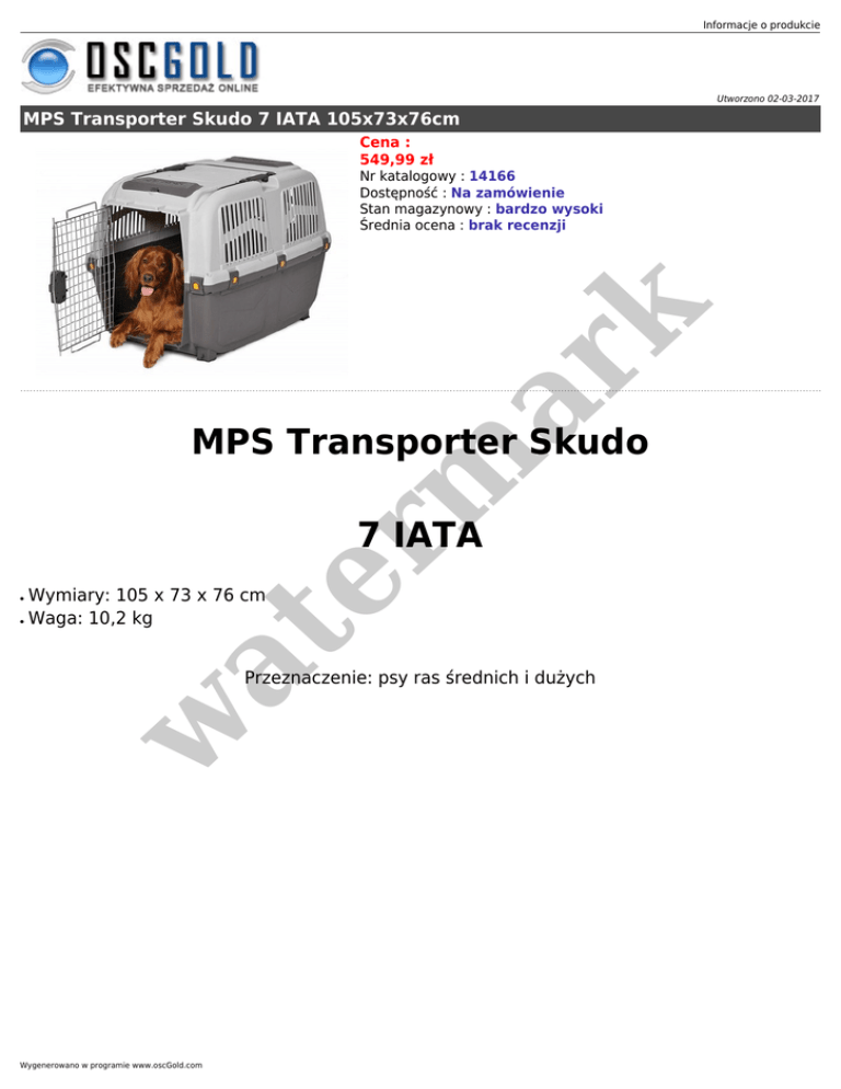 Informacje o produkcie Utworzono 02-03-2017 MPS Transporter Skudo 7 IATA 105x73x76cm Cena : 549,99 zł er m ar k Nr katalogowy : 14166 Dostępność : Na zamówienie Stan magazynowy : bardzo wysoki Średnia ocena : brak recenzji MPS Transporter Skudo 7 IATA ● at ● Wymiary: 105 x 73 x 76 cm Waga: 10,2 kg w Przeznaczenie: psy ras średnich i dużych Wygenerowano w programie www.oscGold.com er m ar k Cechy: ● ● ● ● ● ● ● ● ● ● ● at ● wykonany z mocnego, najlepszej jakości tworzywa sztucznego solidny, funkcjonalny i bezpieczny waga transportera - 10,2 kg ilość drzwi - 1 szt metalowe drzwi posiadające zamek z podwójnym systemem zamykania spełniającym normy IATA dotyczące cywilnego transportu lotniczego wysokiej jakości wykończenie gwarantuje długowieczność transporter jest łatwy do utrzymania w czystości lekki do noszenia posiada mały schowek na górze transportera 2 uchwyty do przenoszenia + jedno ramię do ciągnięcia transportera występuje w 6 rozmiarach przeznaczony dla psów (bernardyn, doberman, bullmastiff, dog niemiecki, rhodesian ridgeback, rottweiler) możliwość zakupu kółek do transportera (brak kółek w zestawie) w ● er m ar k Informacje o produkcie at Transporter Skudo IATA jest doskonałym rozwiązaniem podczas podróży z czworonogiem! Ta wytrzymała, plastikowa konstrukcja zapewnia komfort użytkowania w każdym rodzaju transportu. Transporter Skudo IATA oferuje wiele unikatowych i specjalnie zaprojektowanych rozwiązań jak unikatowy system zamykania dostosowany do norm przewozu zwierząt w pasażerskim transporcie lotniczym. w Materiał, z którego wykonany jest transporter jest wytrzymały i łatwy do utrzymania w czystości. Otwory wentylacyjne rozmieszczone w górnej częsci transportera zapewniają wentylację w ciepłe dni. Wieloletnie doświadczenie w produkcji oraz współpraca z projektantami sprawiają, że włoskie produkty firmy MPS dla zwierząt spełniają oczekiwania najbardziej wymagających klientów i ich pupili. Wygenerowano w programie www.oscGold.com
