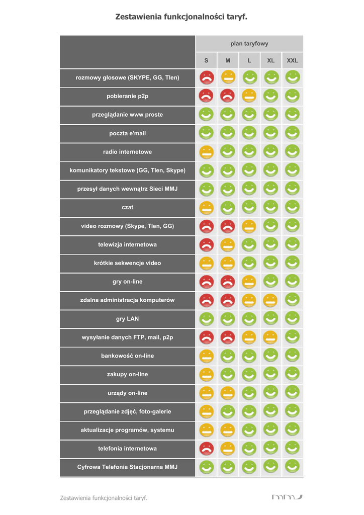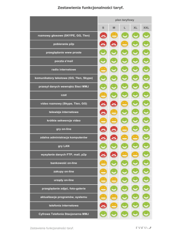 Zestawienia funkcjonalności taryf. plan taryfowy S M L XL XXL rozmowy głosowe (SKYPE, GG, Tlen) pobieranie p2p przeglądanie www proste poczta e'mail radio internetowe komunikatory tekstowe (GG, Tlen, Skype) przesył danych wewnątrz Sieci MMJ czat video rozmowy (Skype, Tlen, GG) telewizja internetowa krótkie sekwencje video gry on-line zdalna administracja komputerów gry LAN wysyłanie danych FTP, mail, p2p bankowość on-line zakupy on-line urządy on-line przeglądanie zdjęć, foto-galerie aktualizacje programów, systemu telefonia internetowa Cyfrowa Telefonia Stacjonarna MMJ Zestawienia funkcjonalności taryf. mmj