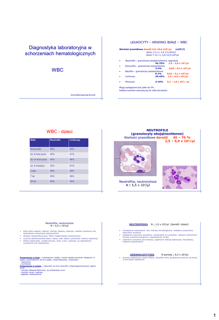 LEUKOCYTY – KRWINKI BIAŁE – WBC Diagnostyka laboratoryjna w schorzeniach hematologicznych Wartości prawidłowe dorośli 4,0–10,0 x103/µl (x106/l) dzieci 1-6 r.ż. 4,5-13 x103/µl 3 dzieci 7-12 r.ż. 4,0-12,0 x10 /µl • • Neutrofile – granulocyty obojętnochłonne, segmenty 45-70% 2,5 – 5,0 x 103/µl Eozynofile – granulocyty kwasochłonne 2-4% 0,04 – 0,4 x 103/µl Bazofile – granulocyty zasadochłonne 0-1% 0,02 – 0,1 x 103/µl Limfocyty 20-45% 1,5 – 4,0 x 103/µl • Monocyty • WBC • 3-10% 0,2 – 1,0 x 103/ /µl Mogą występować też pałki do 5%. Podane wartości odnoszą się do osób dorosłych. Anna Stelmaszczyk-Emmel NEUTROFILE (granulocyty obojętnochłonne) Wartości prawidłowe dorośli 45 – 70 % 2,5 – 5,0 x 103/µl WBC - dzieci Wiek Neutrofile Limfocyty Noworodki 60% 30% ok. 6 dnia życia 45% 41% do 14 dnia życia 40% 48% ok. 6 miesięcy 32% 61% 2 lata 39% 59% 7 lat 55% 38% 20 lat 60% 30% Neutrofilia, neutrocytoza N ↑ 5,5 x 103/µl Neutrofilia, neutrocytoza N ↑ 5,5 x 103/µl • • • • Ostre stany zapalne, infekcje, choroby zakaźne, pasożyty, niektóre nowotwory lite (pobudzenie wytwarzania granulocytów) Zespoły mieloproliferacyjne, MDSy (nadprodukcja nowotworowa) Leczenie glikokortykosteroidami, sepsa, udar cieplny (uwolnienie rezerwy szpikowej) Palenie papierosów, wysiłek fizyczny, stres, urazy i operacje, po splenektomii (uwolnienie puli marginalnej) NEUTROPENIA • • • N ↓ 1,5 x 103/µl (dorośli i dzieci) zmniejszone wytwarzanie: leki, choroby hematologiczne, niedobory zywieniowe, zaburzenia wrodzone zwiększone niszczenie obwodowe: wytwarzanie p/c przeciwko własnym leukocytom, choroby autoimmunologiczne, nadwrażliwość na leki nadmierne tworzenie puli brzeżnej: uogólnione infekcje bakteryjne, hemodializy, krążenie pozaustrojowe AGRANULOCYTOZA Przesuniecie w lewo = odmłodzenie układu, wzrost odsetka komórek młodszych w szpiku, przechodzenie do krwi pałek, metamielocytów, mielocytów - odczynowe - rozrostowe Przesunięcie w prawo = obecność we krwi neutrofili o hipersegmentowanym jądrze (6-8) - choroba Adissona-Biermera, po przetoczeniu krwi - choroby nerek i wątroby - głębokie niedożywienie • N poniżej ↓ 0,5 x 103/µl Znaczne zwiększenie ryzyka infekcji, wszystkie stany gorączkowe powinno się leczyć w warunkach szpitalnych 1 ANOMALIE JAKOŚCIOWE NEUTROFILII anomalia wrodzona Pelgera i Huëta - niepełna segmentacja jądra neutrofilii (2), ale bez zaburzenia ich czynności - występuje u ok. 1 % ludzi, bez znaczenia klinicznego • anomalia nabyta pseudopelgerowska - występuje w przebiegu różnych chorób np.: ostrych białaczek, MDS, aplazji szpiku • hipersegmentacja jąder neutrofilii obojętnochłonnych - przesunięcie w prawo, zwiększenie liczby segmentów (6-7) • ziarnistości toksyczne - grube azurochłonne, ciemnofioletowe ziarnistości w cytoplaźmie neutrofilii (pozostałość ziarnistości promielocytów- zaburzone dojrzewanie N) - występują w przebiegu ciężkich procesów zapalnych, zatruciach, nowotworach z przerzutami, odczynach białaczkowych EOZYNOFILE (granulocyty kwasochłonne) Wartości prawidłowe dorośli 2 - 4% 40,0 – 400,0/µl wahania fizjologiczne : min - rano i popołudnie max – noc min - przed owulacją max - po owulacji • pałeczki Auera - czerwono-fioletowe kreseczki w mieloblastach lub promielocytach MPO+, - swoisty objaw AML • wodniczki w cytoplaźmie - okrągłe puste przestrzenie w cytoplazmie - występują w: anomalii Jordansa - wodniczki lipidowe w N i M ciężkich stanach zapalnych (posocznica) ciężkich zatruciach grzybami ciężkich chorobach wątroby (marskość, ostry żółty zanik wątroby) • ciałka Döhlego - ogniska bezziarnistej cytoplazmy zabarwionej na niebiesko (okrągłe lub wrzecionowate) - pozostałość mRNA w następstwie zaburzeń dojrzewania cytoplazmy - występuje w: anomalii wrodzonej Maya i Hegglina BAZOFILE (granulocyty zasadochłonne) Wartości prawidłowe dorośli 0–1% 20,0 – 100,0/µl EOZYNOFILIA - ↑ 400/ ul BAZOFILIA - ↑ 100/ul przewlekłe zespoły mieloproliferacyjne: (przewlekła białaczka szpikowa =PBSZ=CML, czerwienica prawdziwa, osteomielofibroza = zwłóknienie szpiku ziarnica złośliwa zespół nerczycowy cukrzyca zapalenie zatok przynosowych, choroby alergiczne (np. nadwrażliwość na leki) alergie - dychawica oskrzelowa, pokrzywka uczuleniowa,katar sienny choroby pasożytnicze – włośnica, toksoplazmoza, glistnica, owsica, lamblioza choroby skóry – łuszczyca, pęcherzyca, świerzb kolagenozy choroby zakaźne np. płonica ch. rozrostowe i nowotworowe ziarnica złośliwa, czerwienica prawdziwa, CML LIMFOCYTY Wartości prawidłowe dorośli 20 – 45 % 1,5 – 4,0 x 103/µl LIMFOCYTOZA - ↑ 4 x 103 /µl dorośli 7 x 103 /µl dzieci 9 x 103 /µl niemowlaki LIMFOCYTOZA Stan fizjologiczny: niemowlęta i dzieci do 6 r.ż. Stany patologiczne: • przewaga limfocytów dojrzałych: - CLL - nadczynność tarczycy • przewaga limfocytów atypowych = aktywowanych: infekcje wirusowe: - mononukleoza zakaźna - wirusowe zapalenie wątroby - nagminne zapalenie ślinianek przyusznych - półpasiec - odra - różyczka - wirusowe zapalenie płuc - przewlekłe infekcje (gruźlica, kiła) 2 ↓ 1000 / μl - dorośli ↓ 2000/ μl - dzieci • • LIMFOPENIA Stan fizjologiczny: - ciąża, stres, wysiłek fizyczny Stan patologiczny: - ch. rozrostowe: ostra i przewlekła białaczka szpikowa - AIDS - radioterapia - sterydoterapia - HLH PLAZMOCYTY - mononukleoza zakaźna - różyczka - plazmocytoma - szpiczak mnogi MONOCYTY Wartości prawidłowe dorośli 3 – 10 % 200,0 – 1000,0/µl •MONOCYTOPENIA - ↓ 200/µl kortykosteroidy, aplazja MONOCYTOZA - ↑ 10% liczby monocytów powyżej dorośli ↑ 800/µl - 1000/µl - dzieci 3000/µl - niemowlęta MONOCYTOZA - ↑ 10% choroby zakaźne: gruźlica, kiła mononukleoza zakaźna nagminne zapalenie ślinianek przyusznych wirusowe zapalenie wątroby, wirusowe z