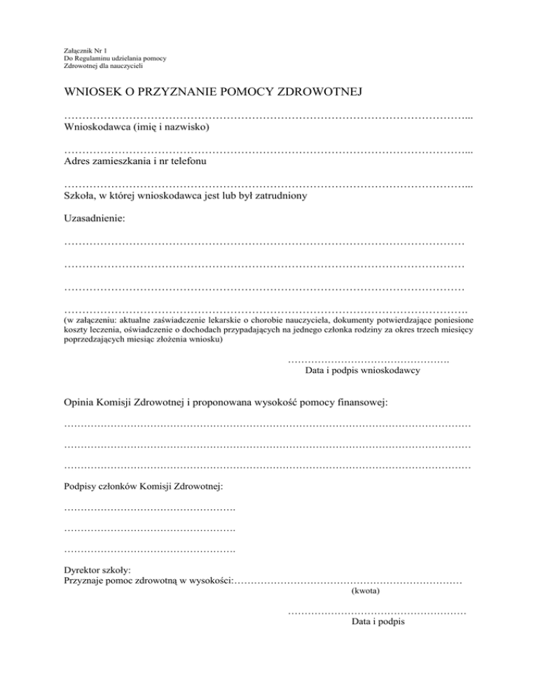 Załącznik Nr 1 Do Regulaminu udzielania pomocy Zdrowotnej dla nauczycieli WNIOSEK O PRZYZNANIE POMOCY ZDROWOTNEJ …………………………………………………………………………………………………... Wnioskodawca (imię i nazwisko) …………………………………………………………………………………………………... Adres zamieszkania i nr telefonu …………………………………………………………………………………………………... Szkoła, w której wnioskodawca jest lub był zatrudniony Uzasadnienie: ………………………………………………………………………………………………… ………………………………………………………………………………………………… ………………………………………………………………………………………………… …………………………………………………………………………………………………. (w załączeniu: aktualne zaświadczenie lekarskie o chorobie nauczyciela, dokumenty potwierdzające poniesione koszty leczenia, oświadczenie o dochodach przypadających na jednego członka rodziny za okres trzech miesięcy poprzedzających miesiąc złożenia wniosku) …………………………………………. Data i podpis wnioskodawcy Opinia Komisji Zdrowotnej i proponowana wysokość pomocy finansowej: …………………………………………………………………………………………………………… …………………………………………………………………………………………………………… …………………………………………………………………………………………………………… Podpisy członków Komisji Zdrowotnej: ……………………………………………. ……………………………………………. ……………………………………………. Dyrektor szkoły: Przyznaje pomoc zdrowotną w wysokości:…………………………………………………………… (kwota) ……………………………………………… Data i podpis